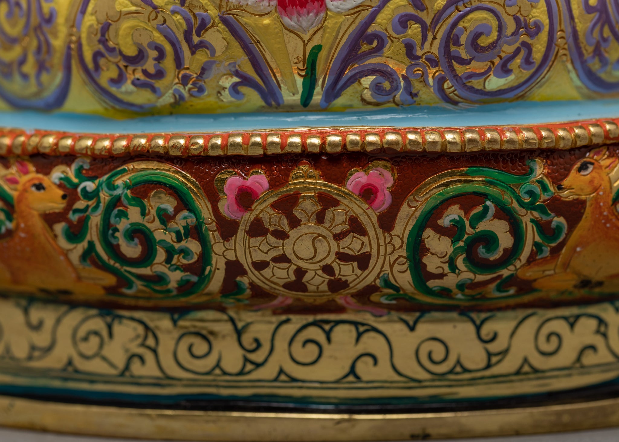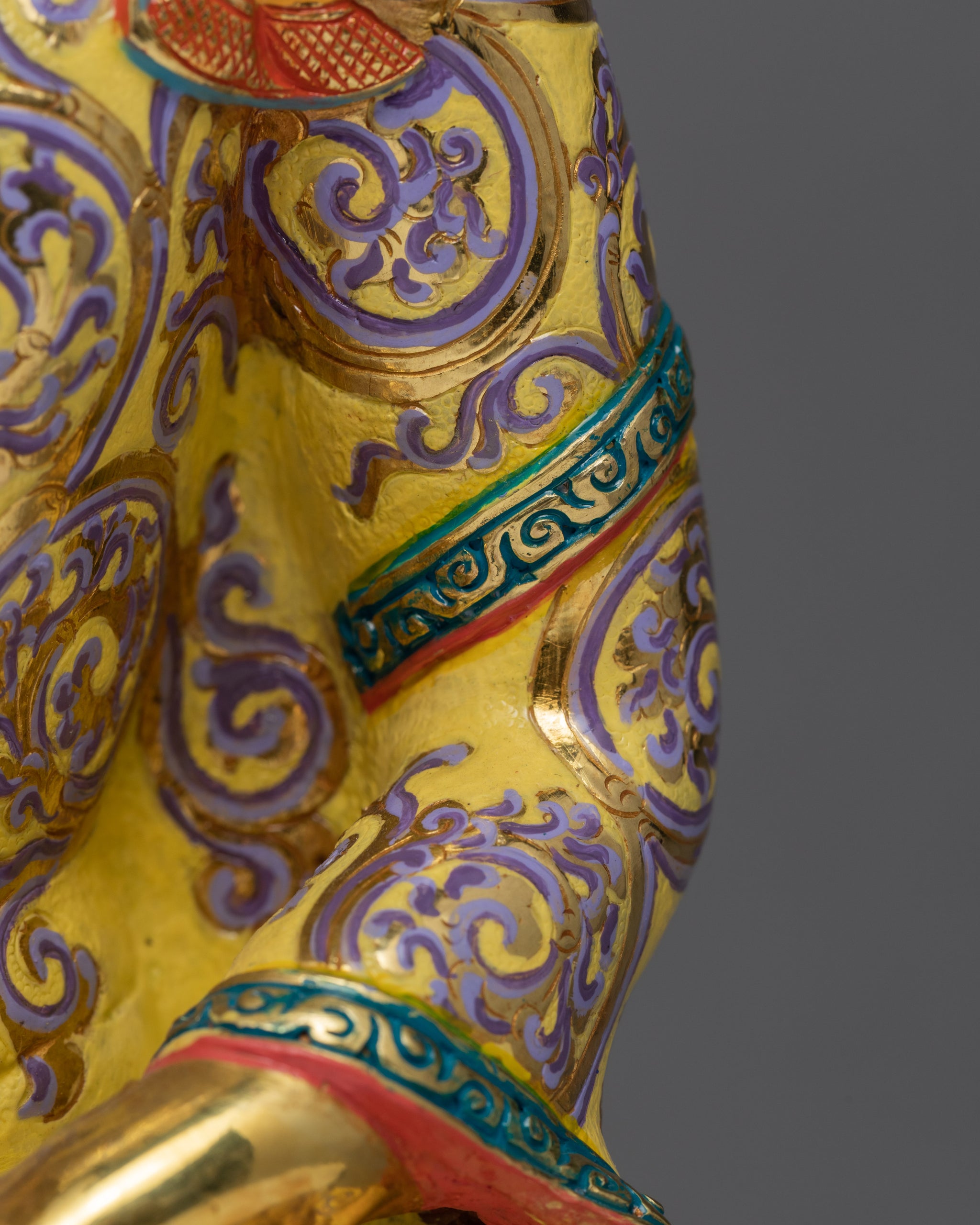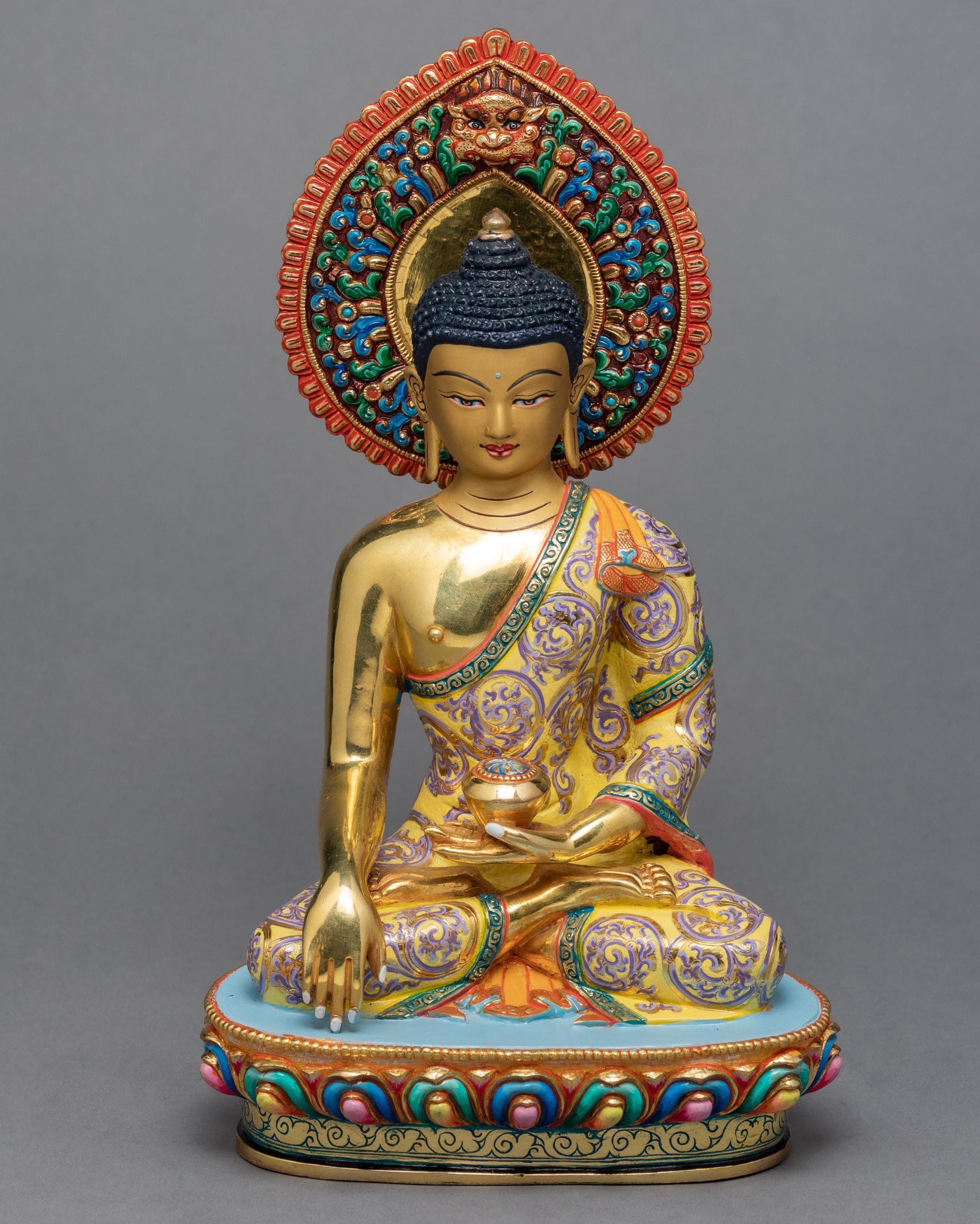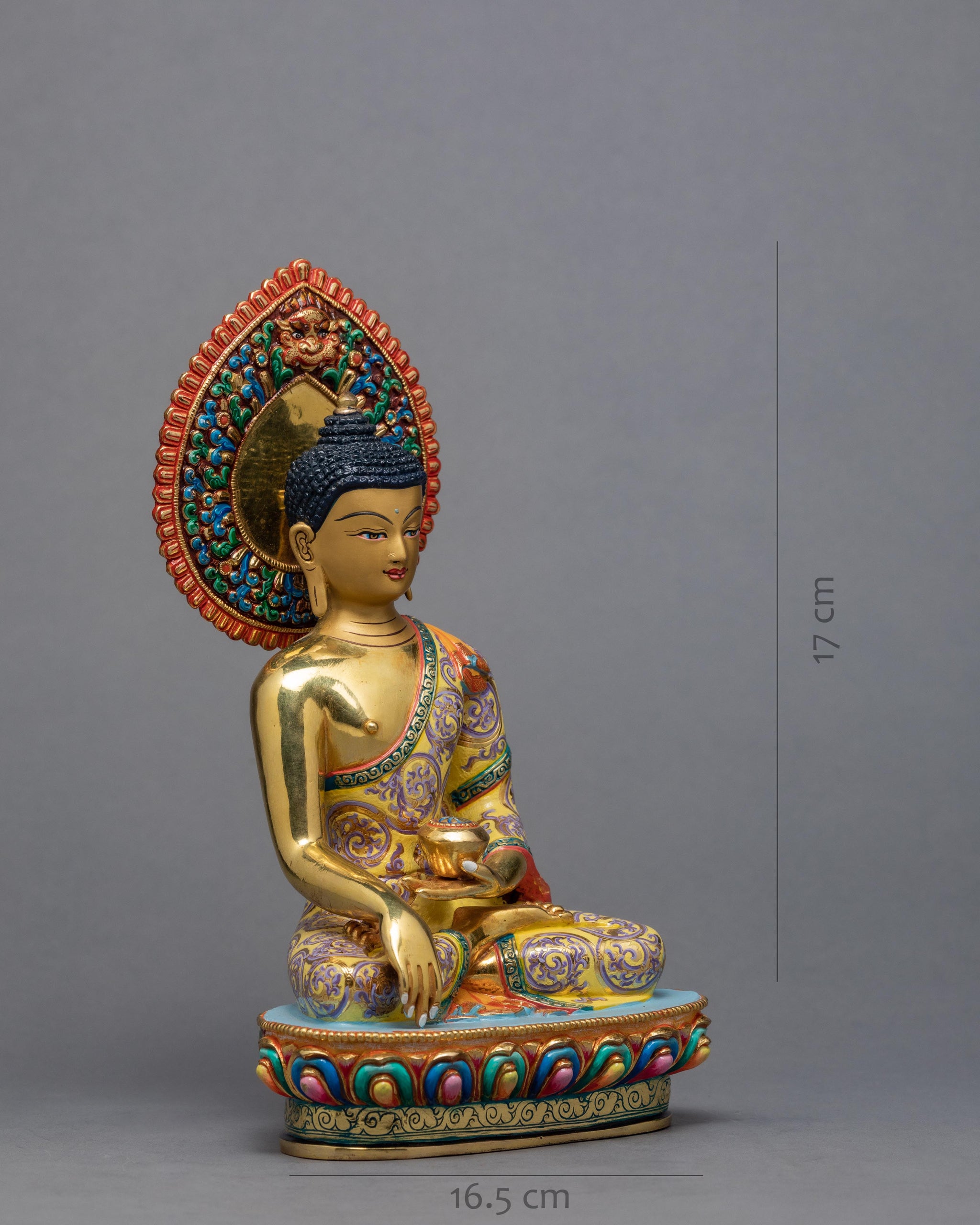 Shakyamuni Buddha is also known as Lord Buddha or Gautam Buddha. Shakyamuni’s right hand reaches down to touch the earth. This gesture represents the moment when he called the earth to witness his transcendence of the realm of Mara, the supreme God of the world (samsara), who had tried to distract him from his meditation. This Shakyamuni Buddha Statue is made up of copper plated with 24K gold.Size: 6.69"/ 17cm (Height) x6.49"/16.5cm (Base)