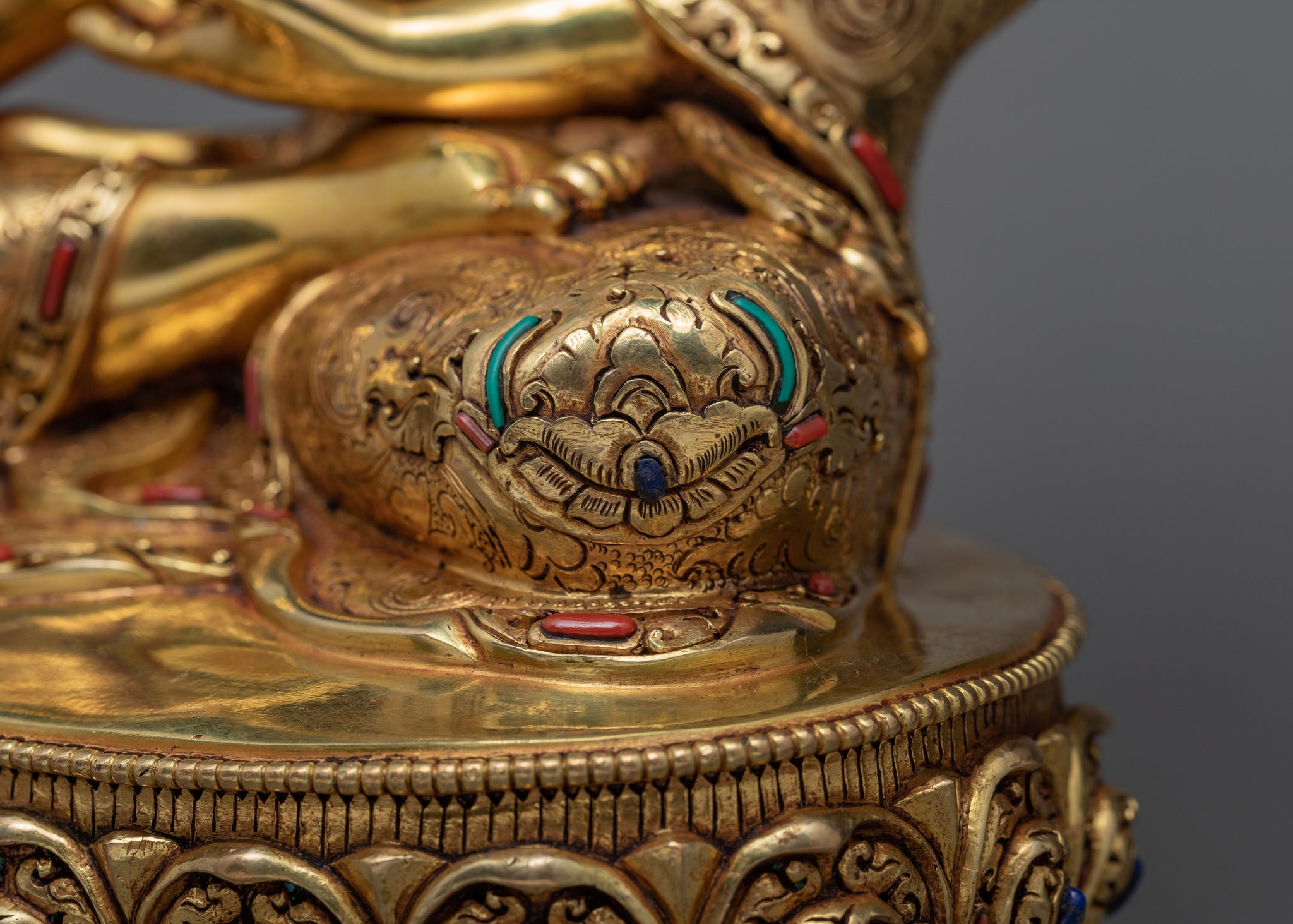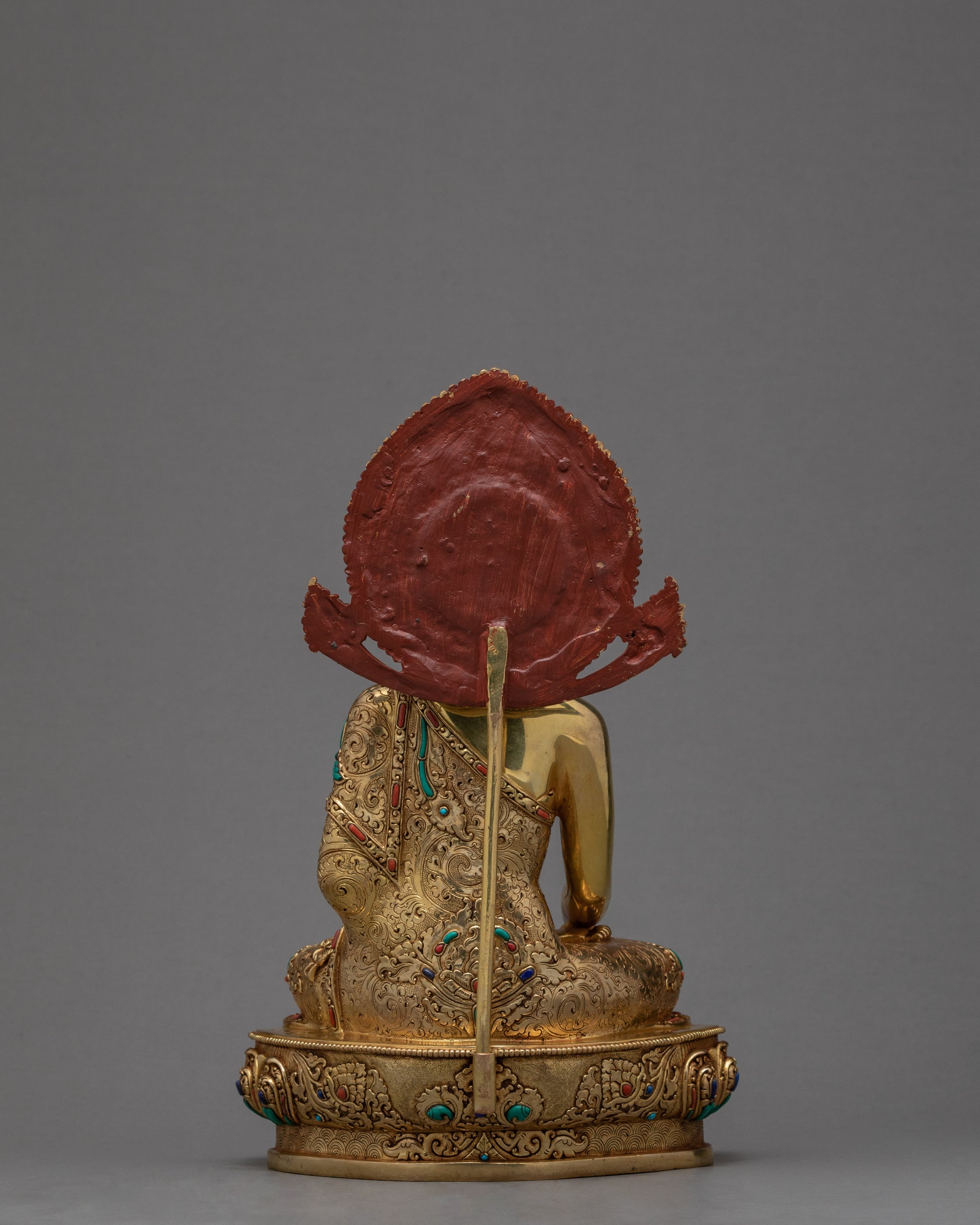 This is a statue of Buddha Shakyamuni seated on a lotus seat. This statue was handcrafted in copper and gilded in 24K gold by a Nepali artist in Kathmandu. The statue's attractiveness is enhanced by the multicolored lotus petals and delicately crafted flower designs on his robe. This will be a perfect Buddha Statue for your meditation shrine.