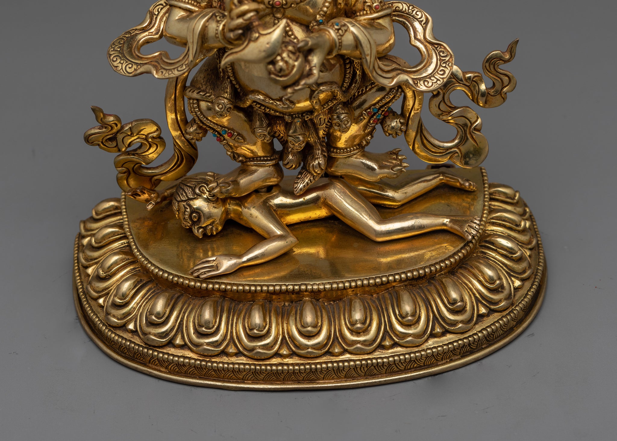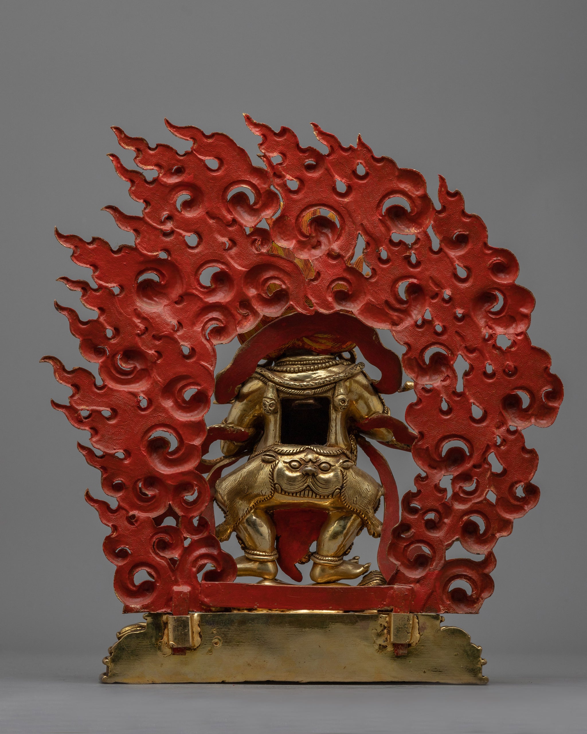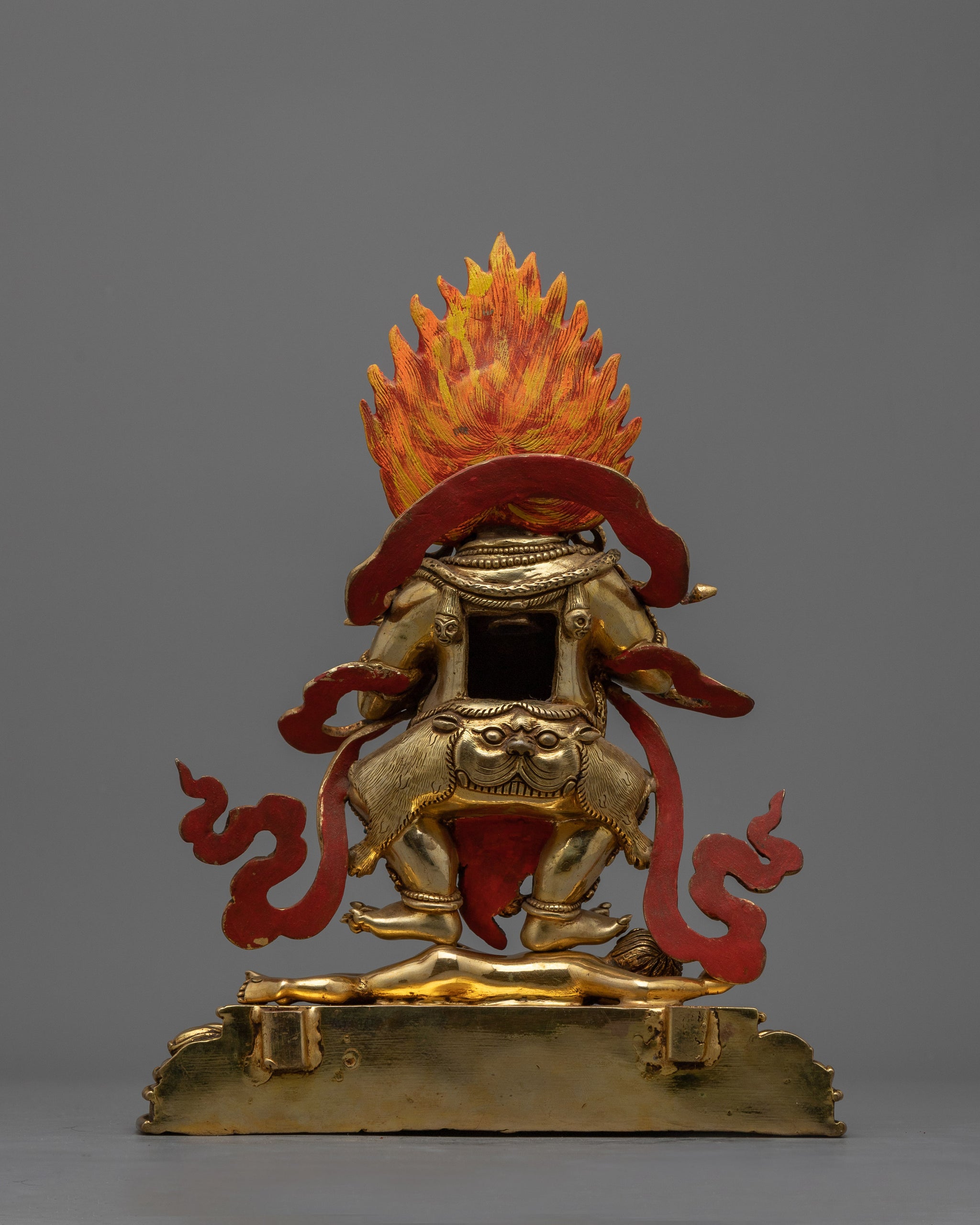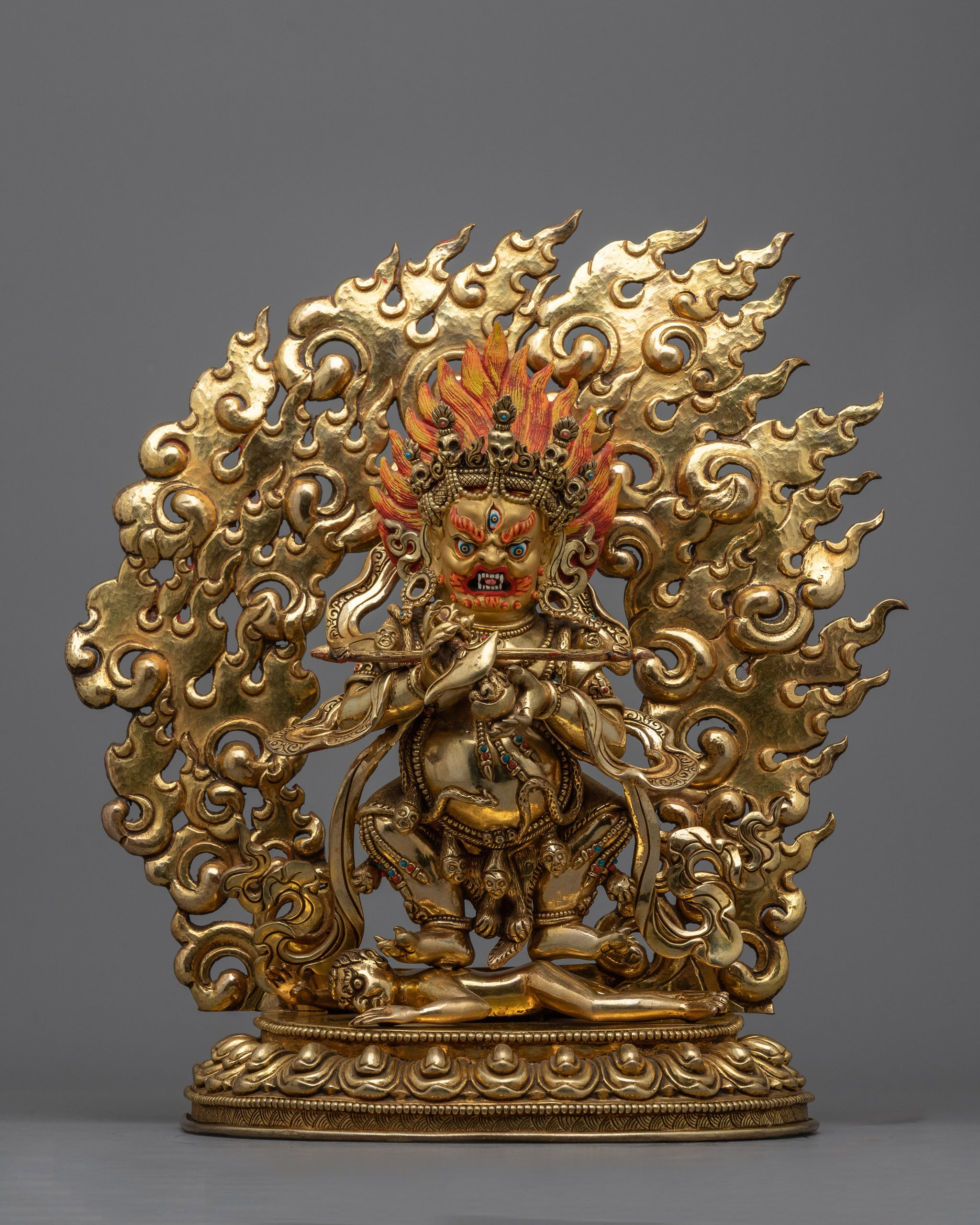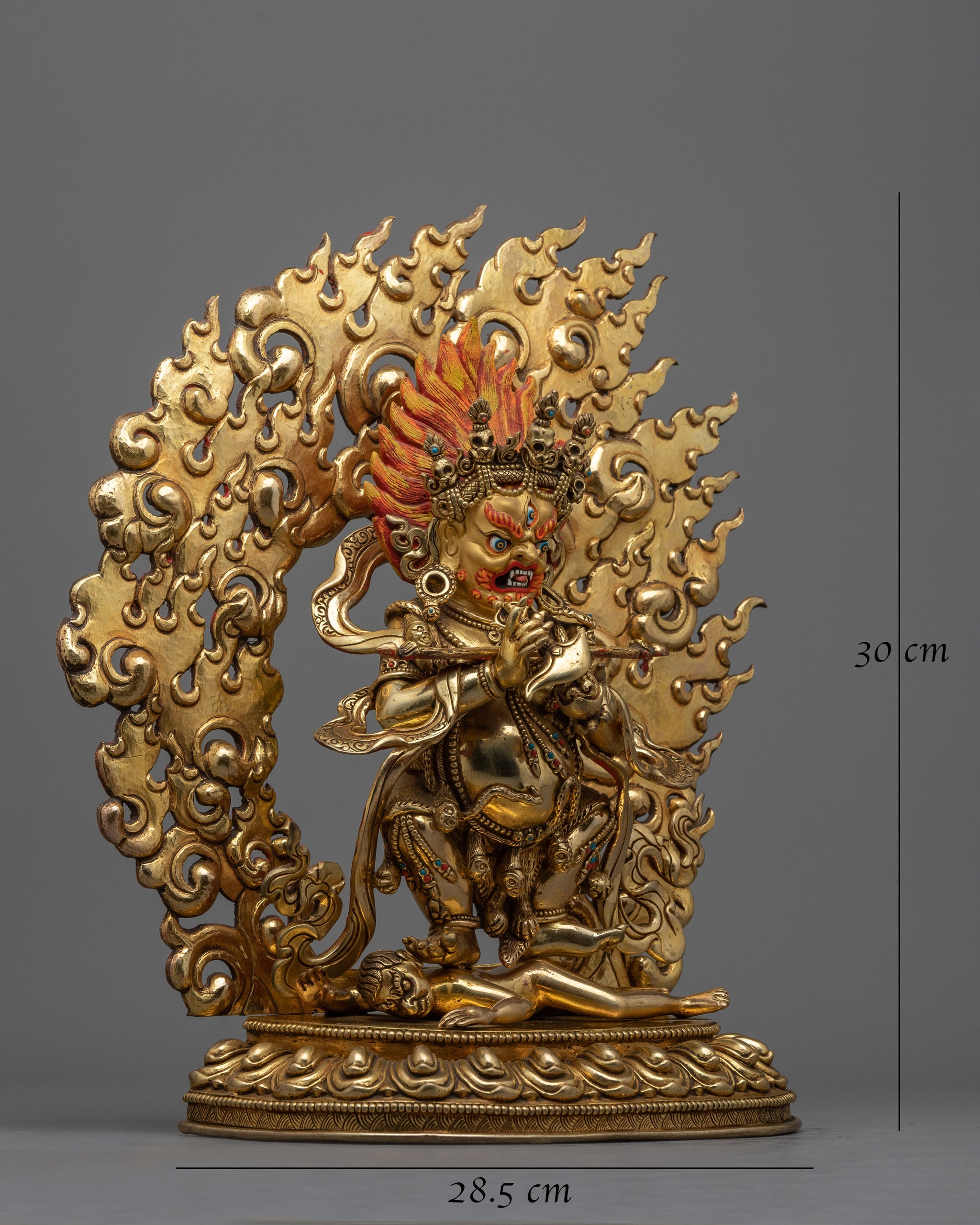 This sculpture, which is made of a sturdy copper body and is gilded in 24K gold, exudes a commanding presence that demands attention and respect. In addition to adding to its visual attractiveness, the gold finish represents the holiness and purity of the Dharmapala's purpose. Enhanced with detailed gold and acrylic paintings, every feature, from the fierce expression to the ornate armor, is rendered with precision, showcasing the artisan's dedication to creating both a spiritually significant and visually stunning piece.