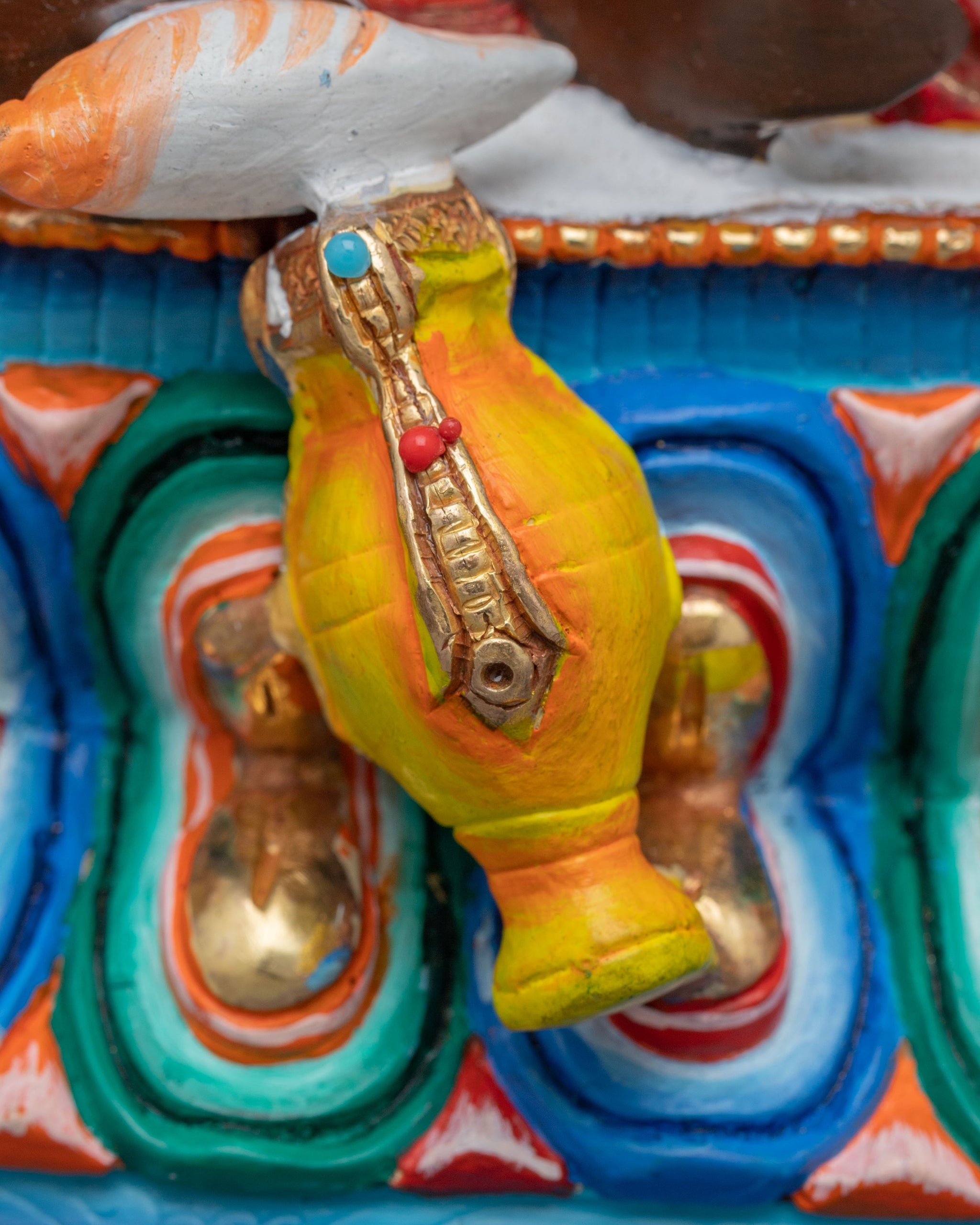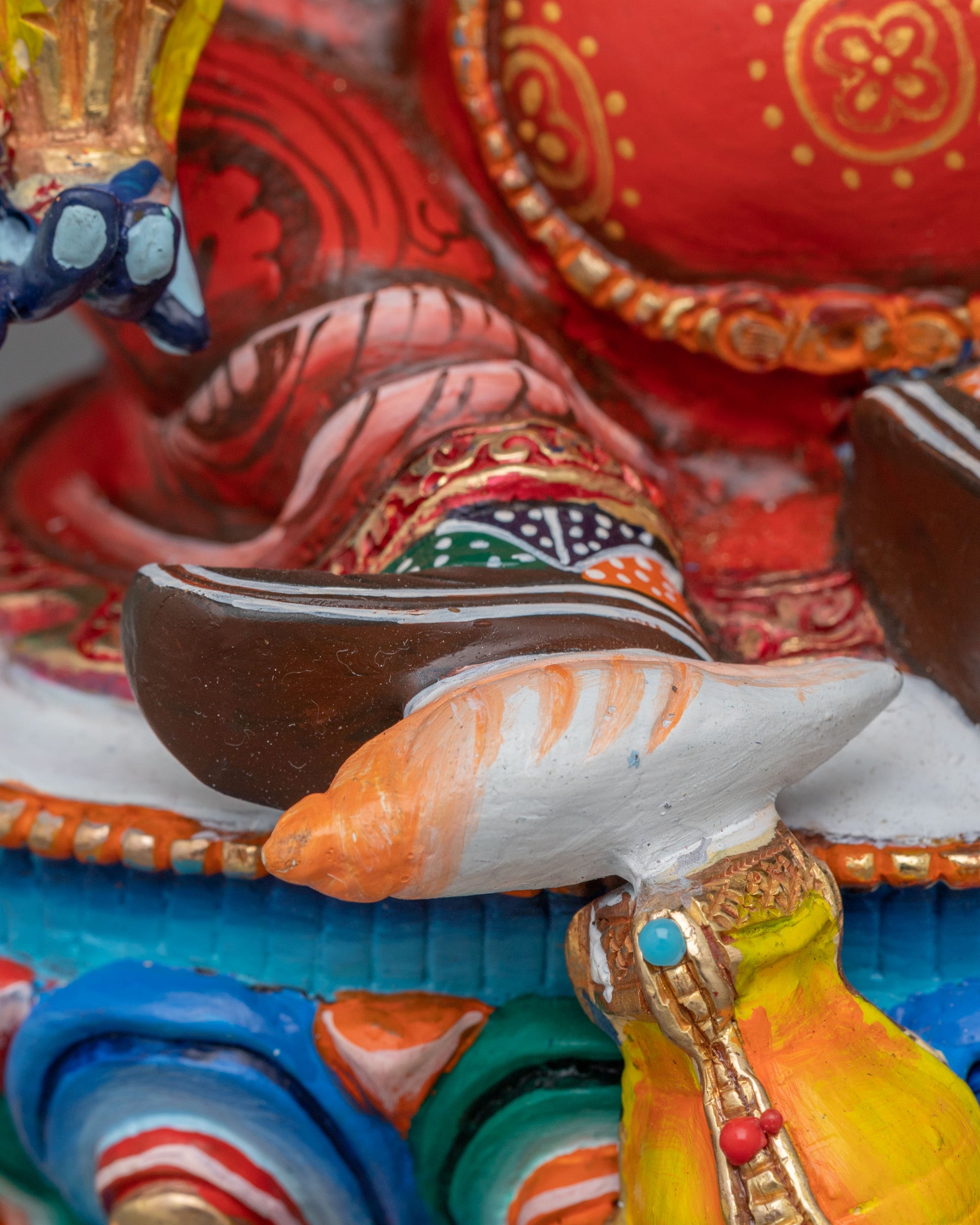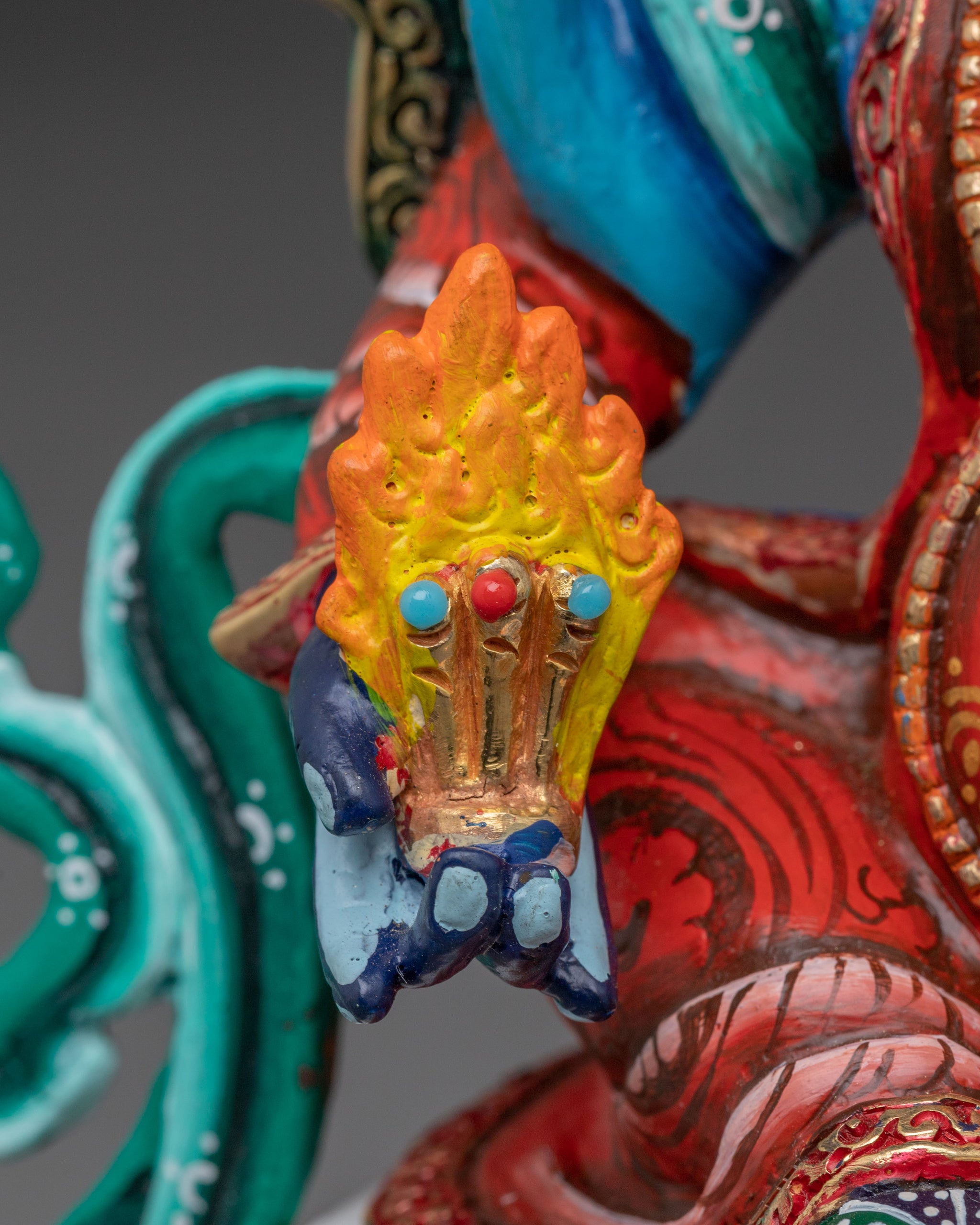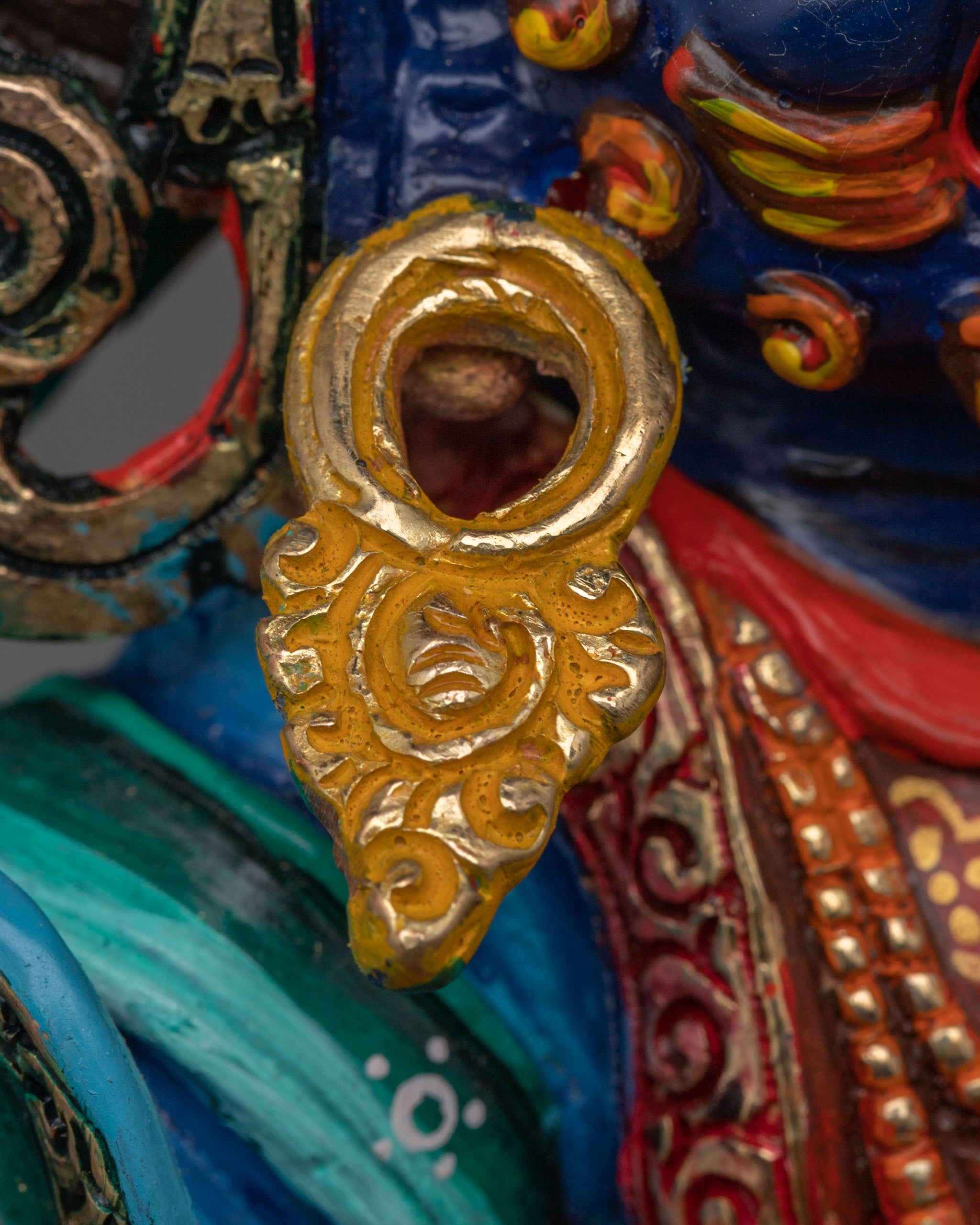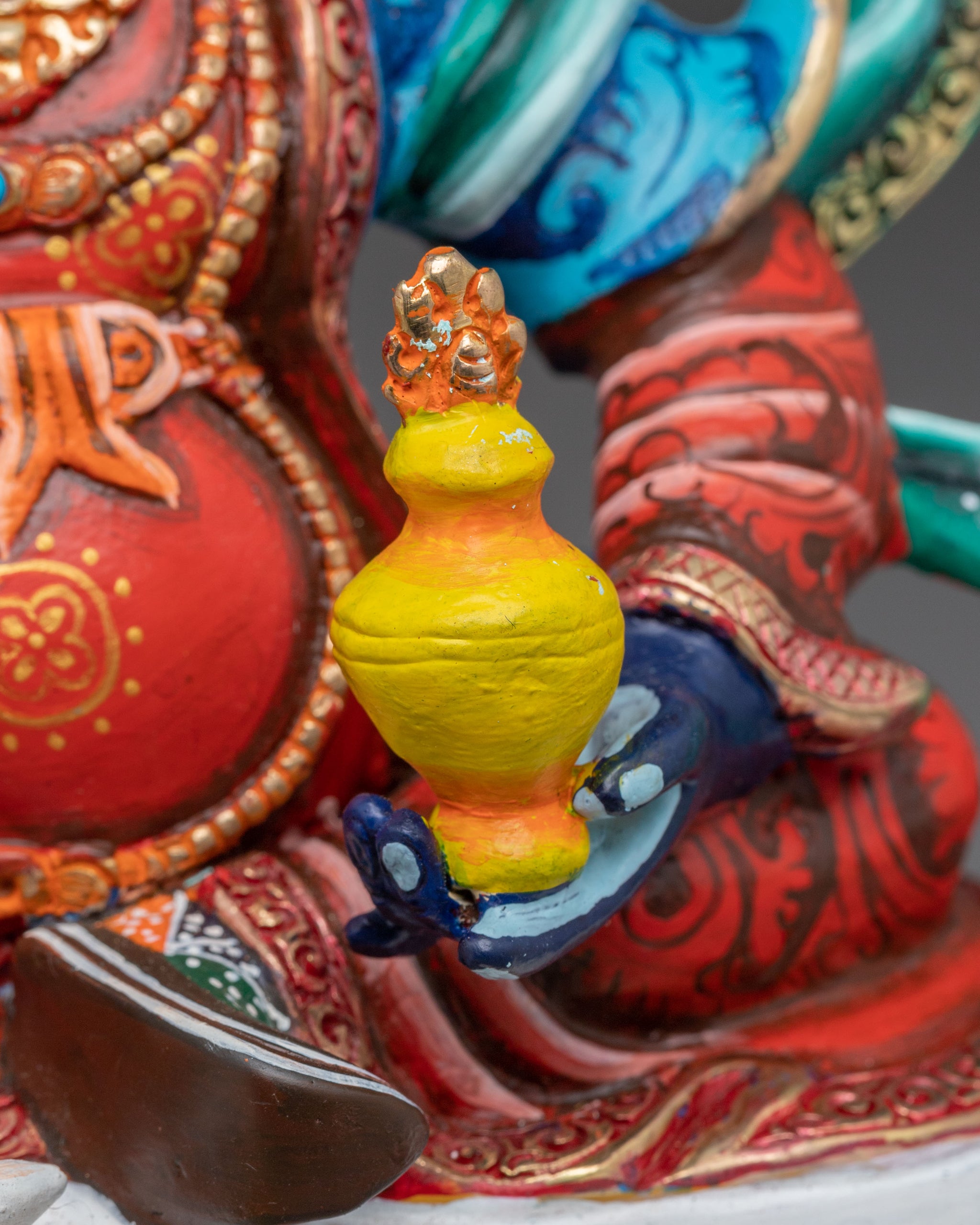 Vajrayogini is stunning. The details are amazing. It's easy to make out her facial expressions, skulls, feet, and the ring of fire around her. You can tell she's handmade. There is a consecration hole in her back.