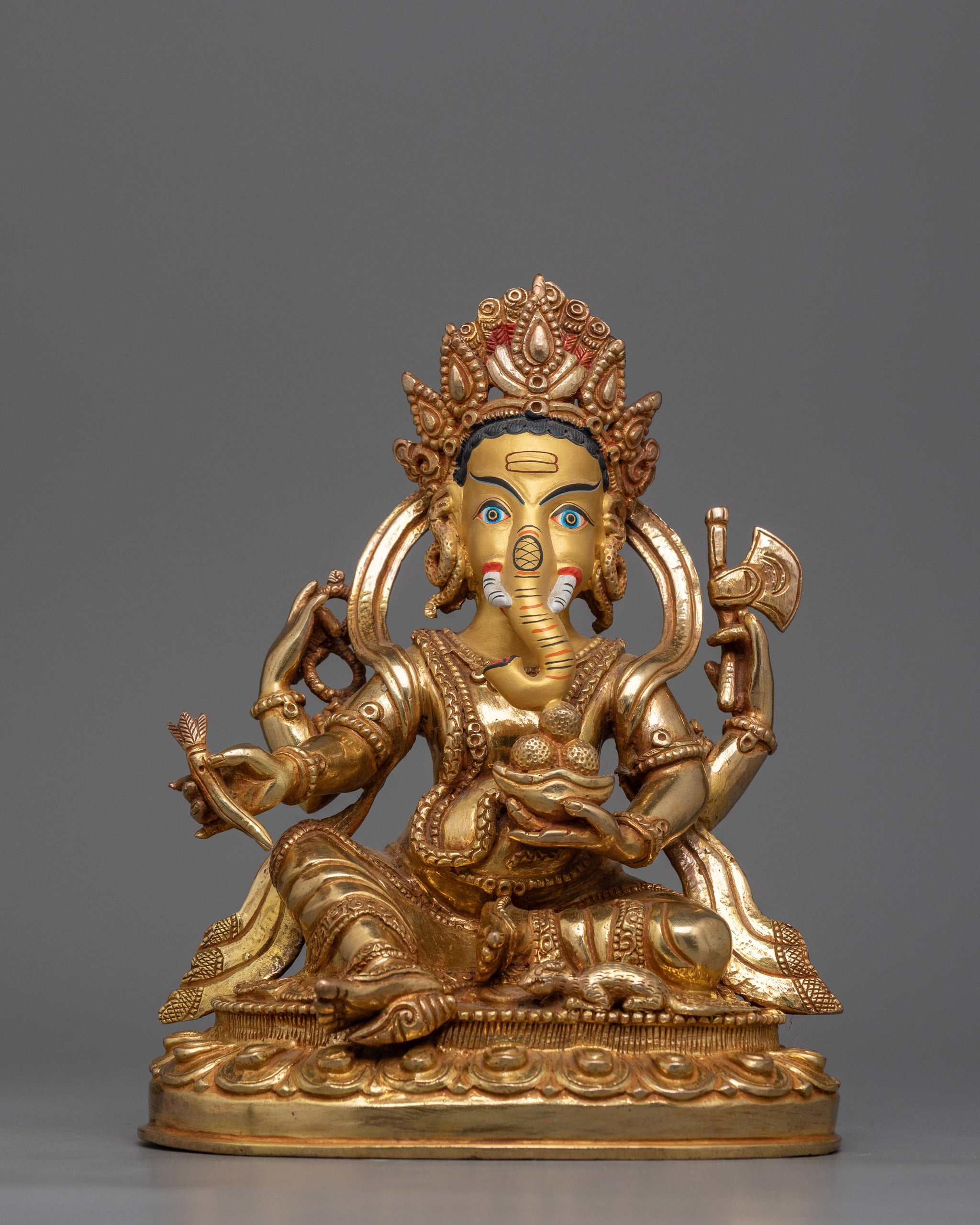 Presenting our stunning statue of Shri Ganesh, skillfully crafted by Patan, Nepalese artists. This statue, which has a height of 7.9 inches and a base diameter of 6.3 inches, is constructed from a copper body that has been intricately painted in acrylic and gilded with 24 carat gold. Respected as the remover of barriers and the herald of wisdom and wealth, Shri Ganesh is shown with fine detail and a calm expression that perfectly captures his heavenly essence.