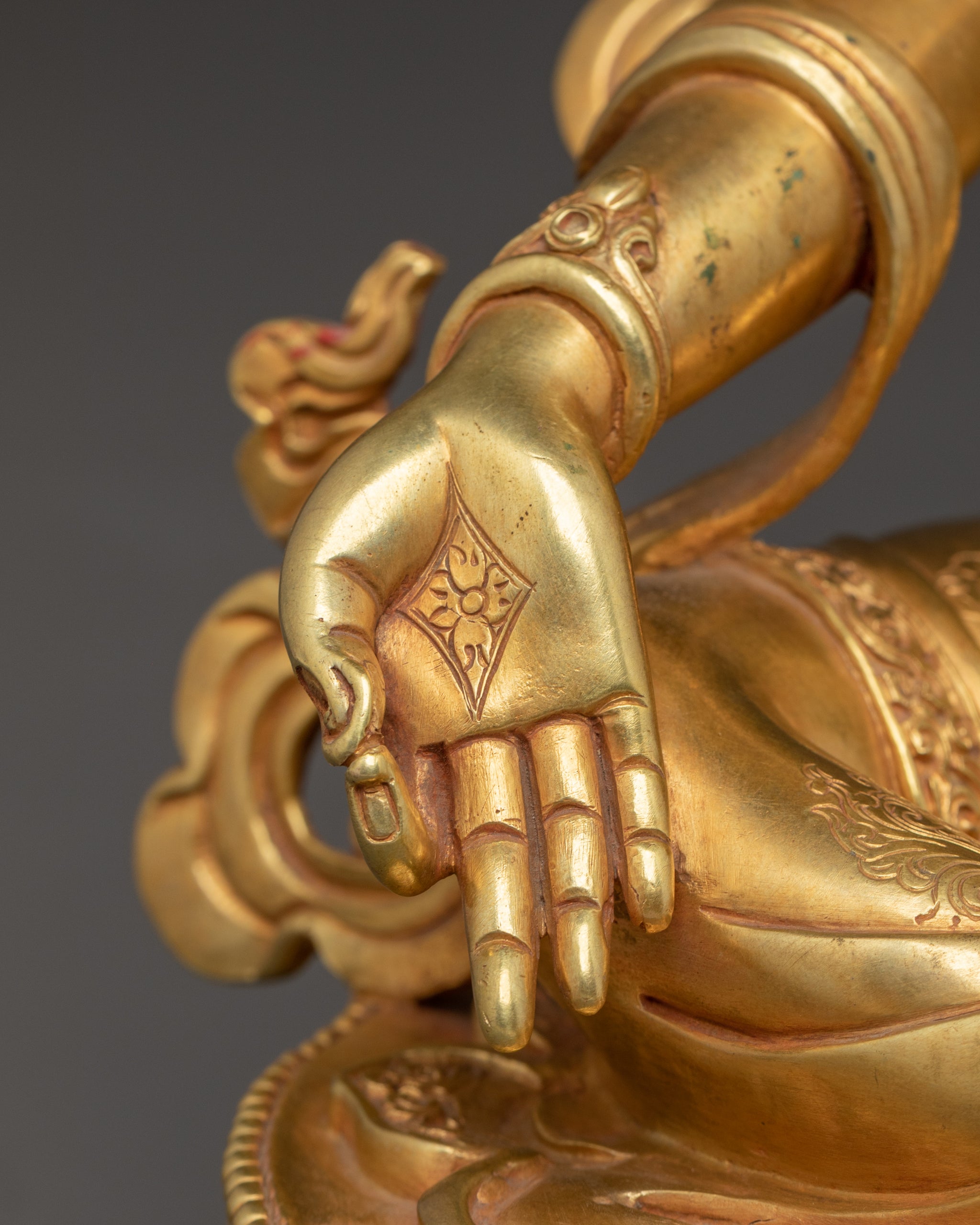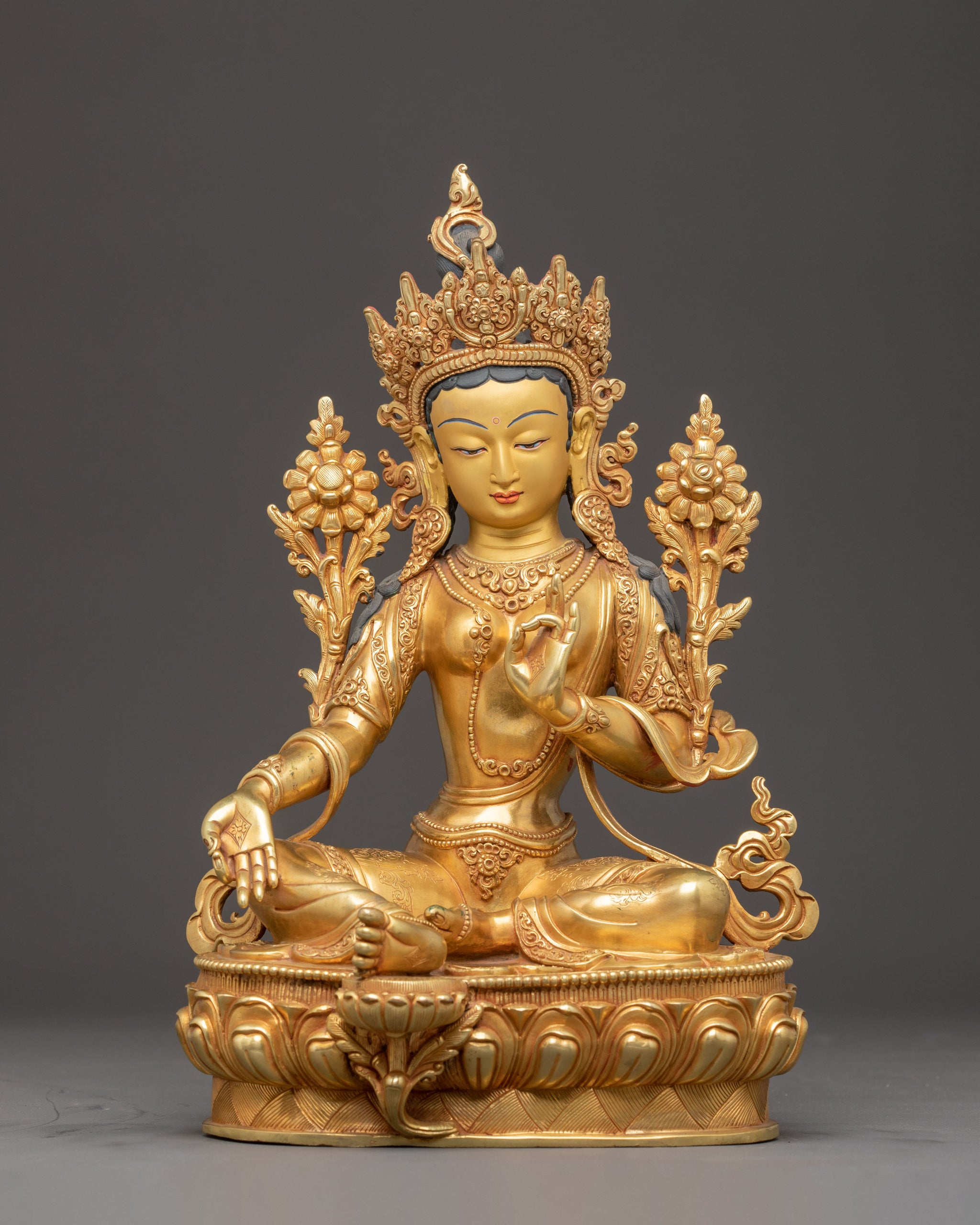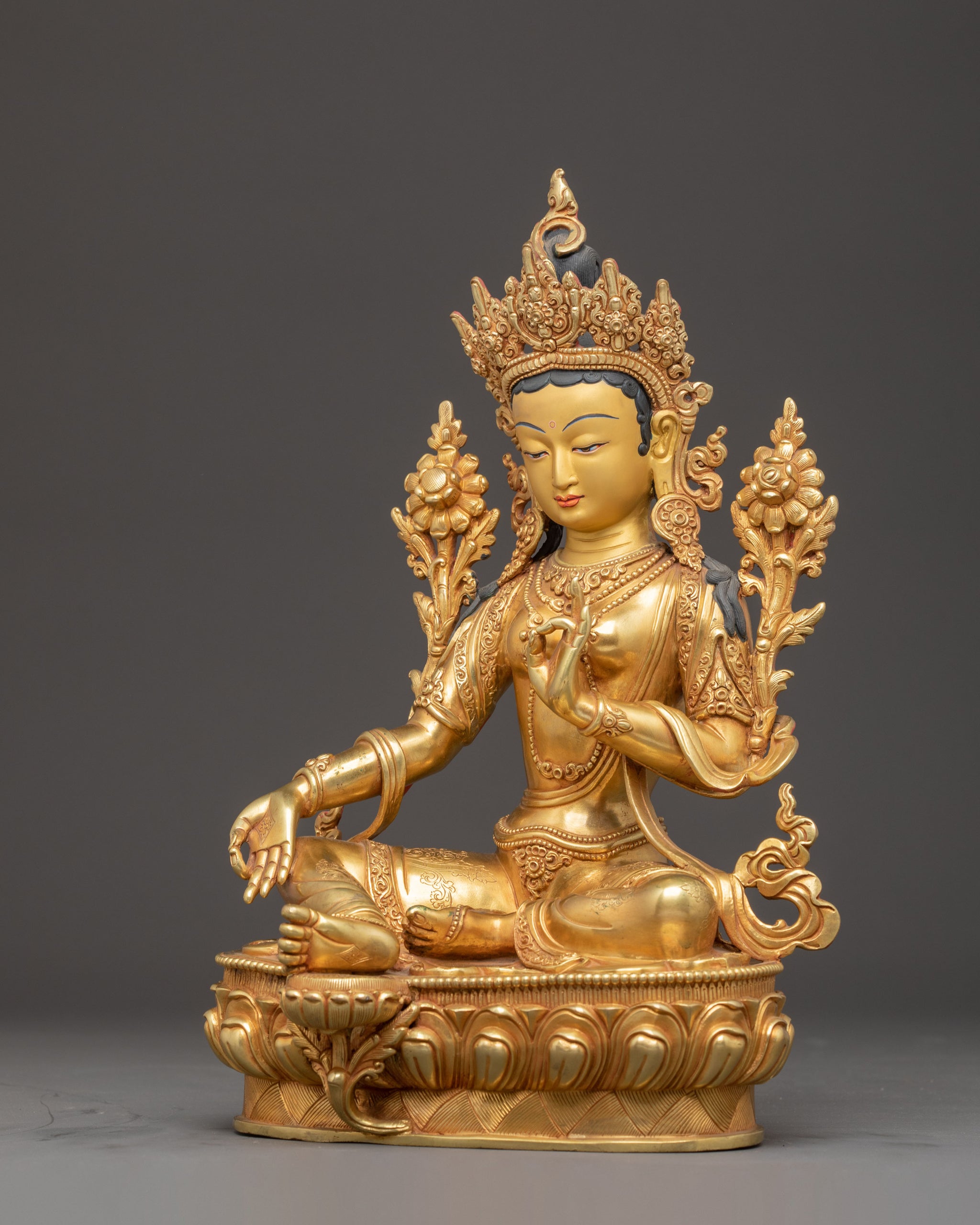 This Shyama Tara Golden Statue stands at 13.0 inches (33 cm) in height and rests on a 9.3-inch (23.5 cm) base, weighing 4.16 kg. It is made of copper, covered with a triple layer of 24K gold gilding, and carved with deeply engraved carvings that produce a magnificent 3D-like effect. This sculpture, adorned with gemstones, handcrafted by expert Nepalese artisans, elegantly symbolizes Himalayan Buddhism's sacred traditions, making it an appropriate addition to altars, meditation places, or sacred collections.