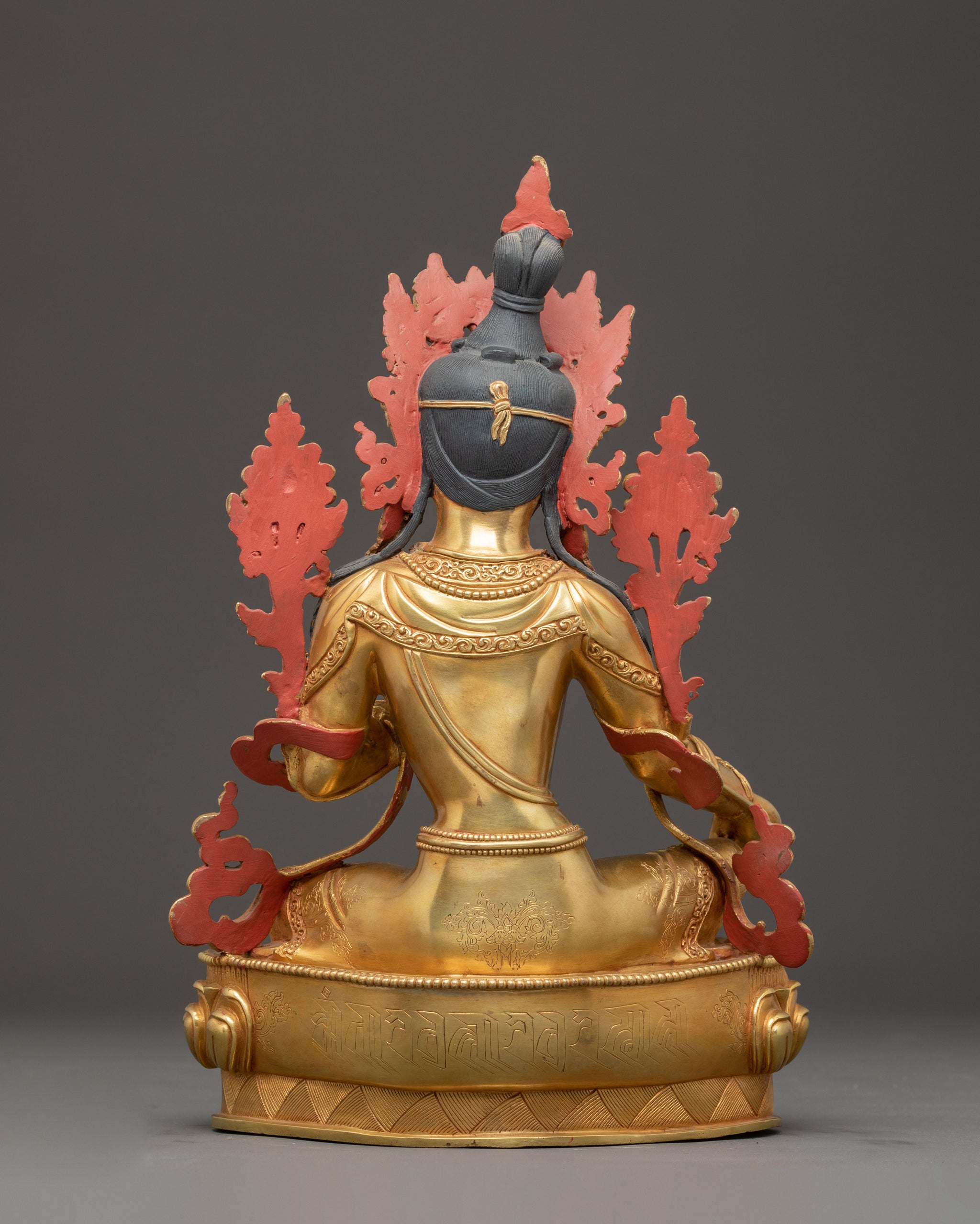 Shyama Tara, honored for her profound compassion and protective spirit, is portrayed seated gracefully with her right leg extended, ready to respond to the needs of those who seek her aid. In her right hand, she holds a lotus, signifying purity and spiritual flourishing, while her left hand forms the Three Jewel Mudra, paying homage to the Buddha, Dharma, and Sangha, and also cradles a lotus symbolizing continuous spiritual development. Adorned with a crown of the Five Dhyani Buddhas, she embodies the five aspects of enlightened wisdom. Seated upon a lotus pedestal with a moon disc, her poised yet dynamic presence reflects her compassionate readiness to assist sentient beings on their journey toward enlightenment. This radiant statue captures her essence as a benevolent and responsive guide.