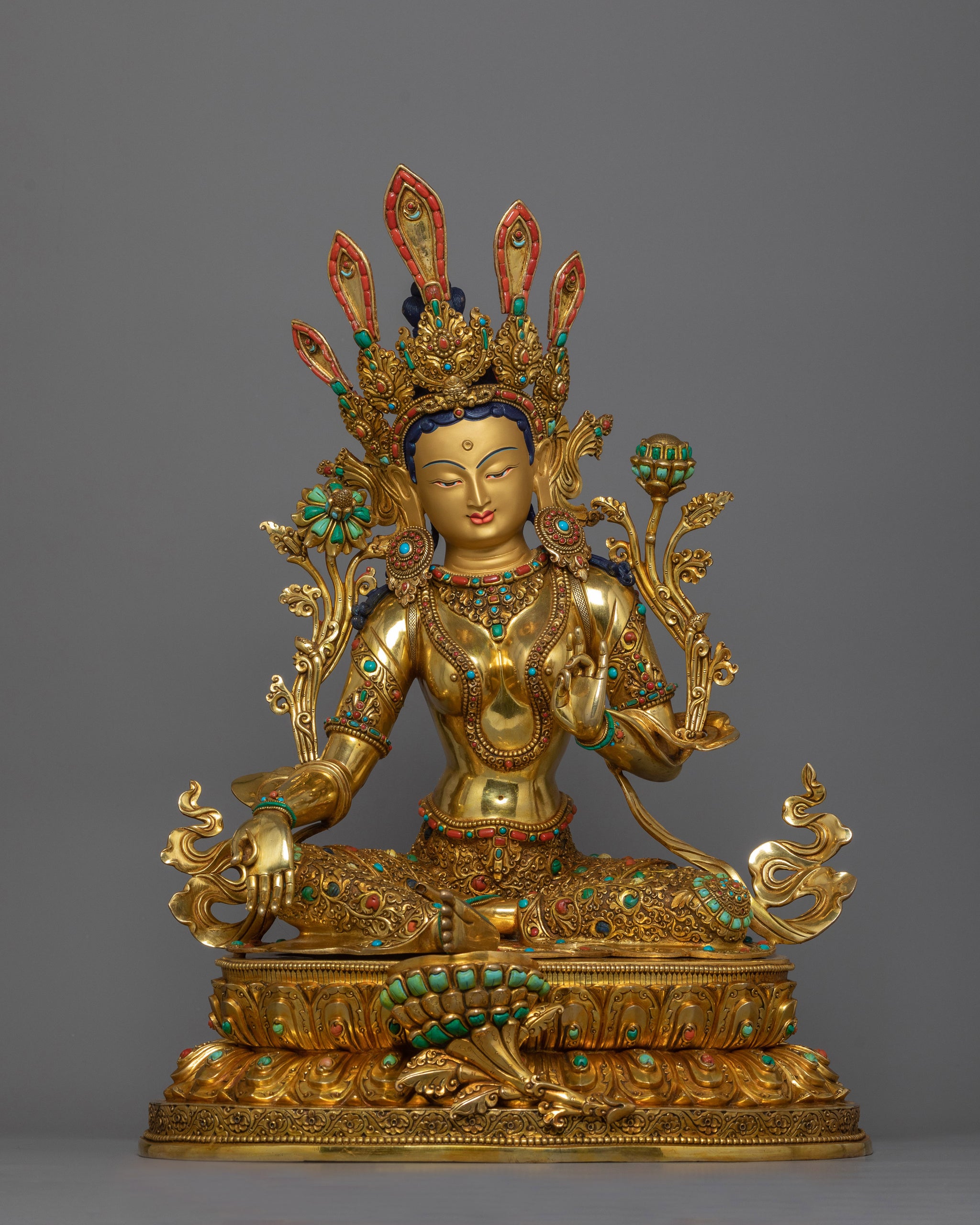 Presenting the Shyama Tara "Green Tara" Idol is a stunning depiction of Tara, which stands for profound knowledge and a shielding force. This idol, which stands an impressive 20.8 inches tall with a base of 15.3 inches and weighs 11.13 kg, represents the enigmatic and potent presence of Shyama Tara. This item, made of a copper body and gilded in 24K gold, is enhanced by intricate paintings in gold and acrylic and is further enhanced by hand-carved jewels. It perfectly embodies Tara's caring and protective personality.