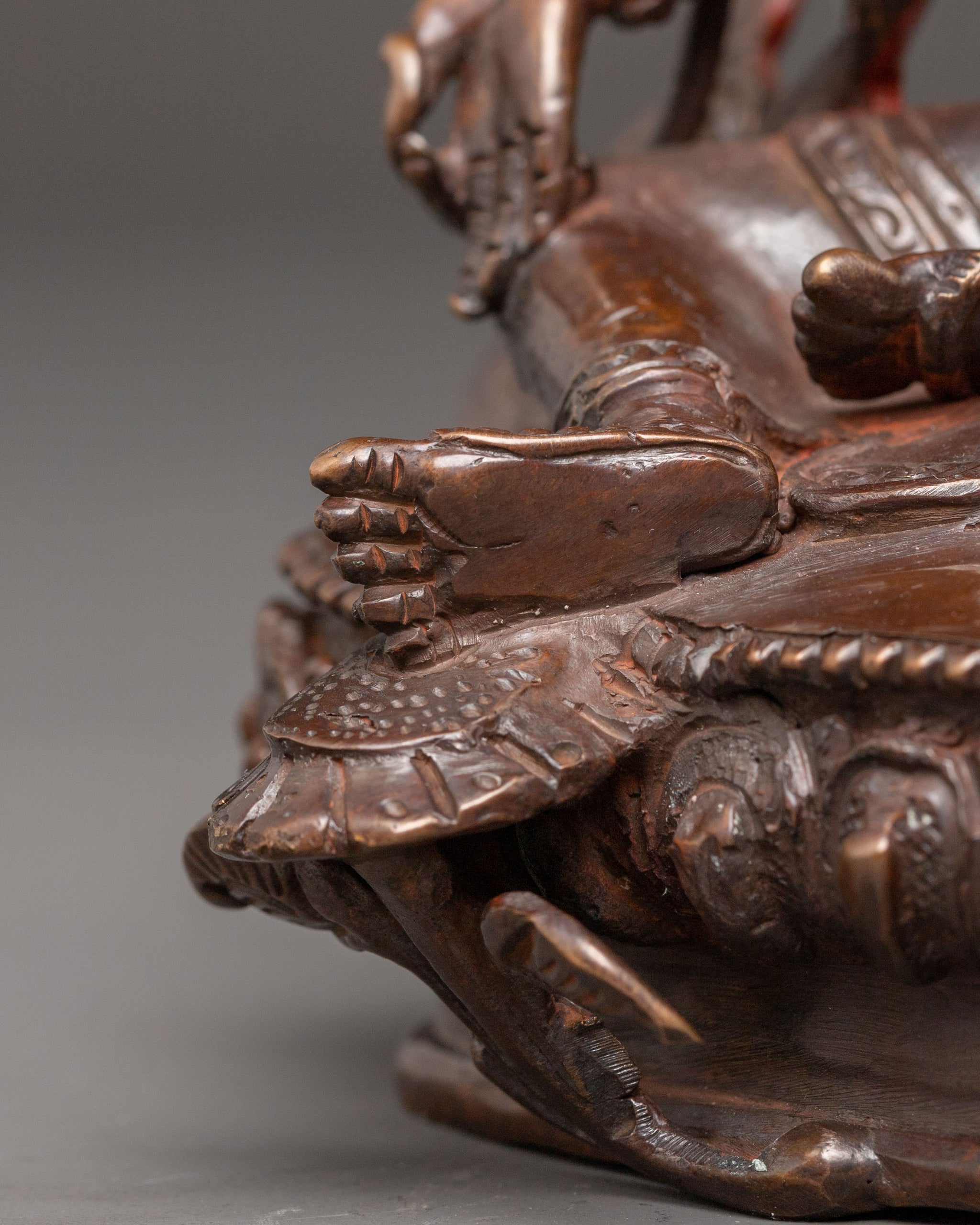 The Handmade Shyama Tara Statue of Love and Compassion, also known as Green Tara, measures 6.7 inches (17 cm) in height and 5.9 inches (15 cm) at the base, weighing 1 kg. Made from an oxidized copper body, it features a rich, antique finish that highlights its intricate detailing. Expertly crafted by skilled artisans, this piece reflects traditional craftsmanship and makes a refined addition to compact altars, meditation spaces, or personal spiritual collections.