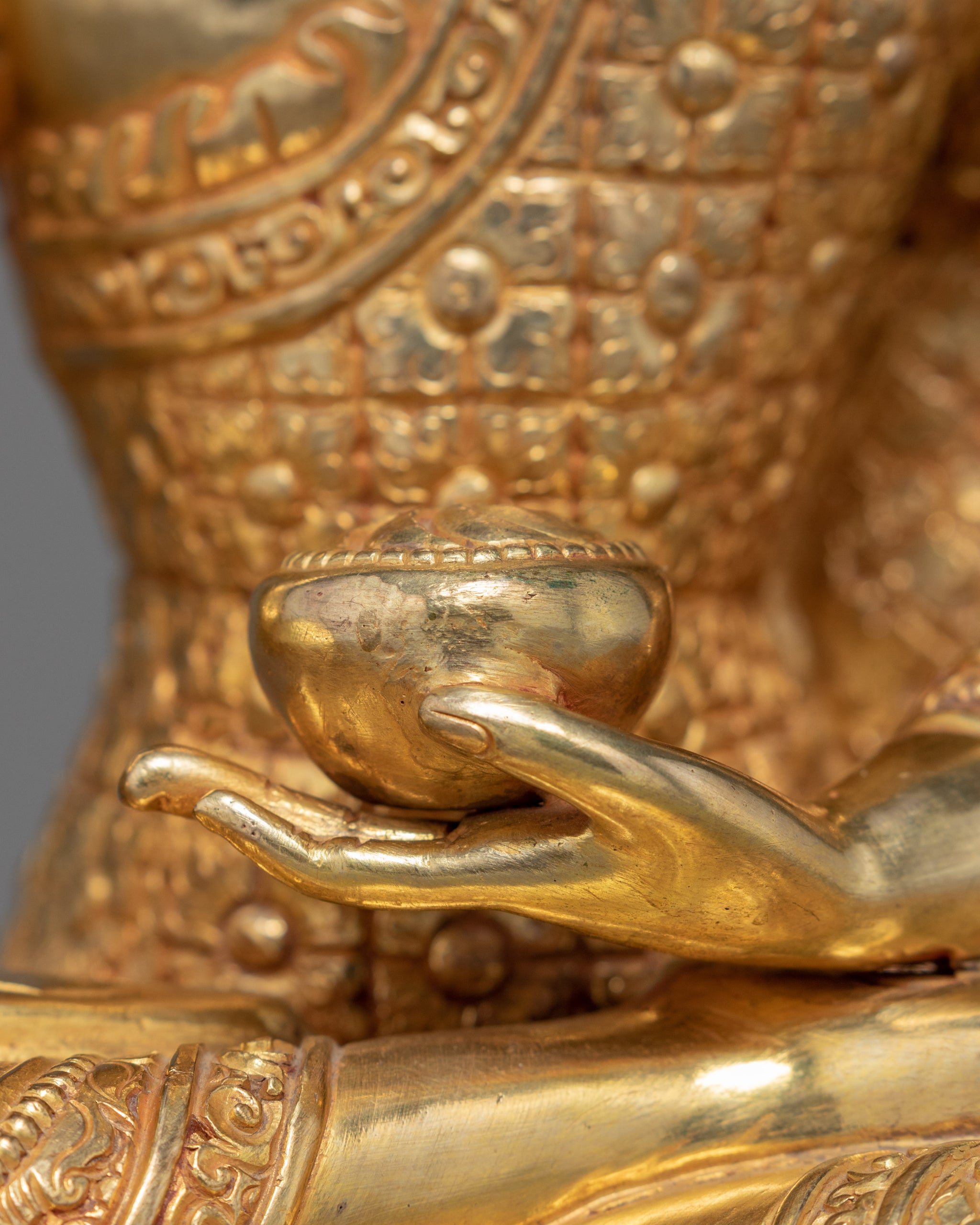 The Siddhartha Gautama Buddha sculpture was entirely hand-carved in Nepal using traditional Himalayan art. Buddha is seen in art with a peaceful expression while sitting on top of a moon disc lotus seat. You will benefit significantly from this statue since you can use it for many different types of meditation. The statue adorned with priceless diamonds and jewelry will be a tremendous gift from Nepal to a practitioner like you. The delicately hand-sculpted robe is exquisitely decorated with precious 24k gold and gems and reflects Buddhism. Additionally, you can utilize this sculpture in various Vajrayana activities and as a gift.