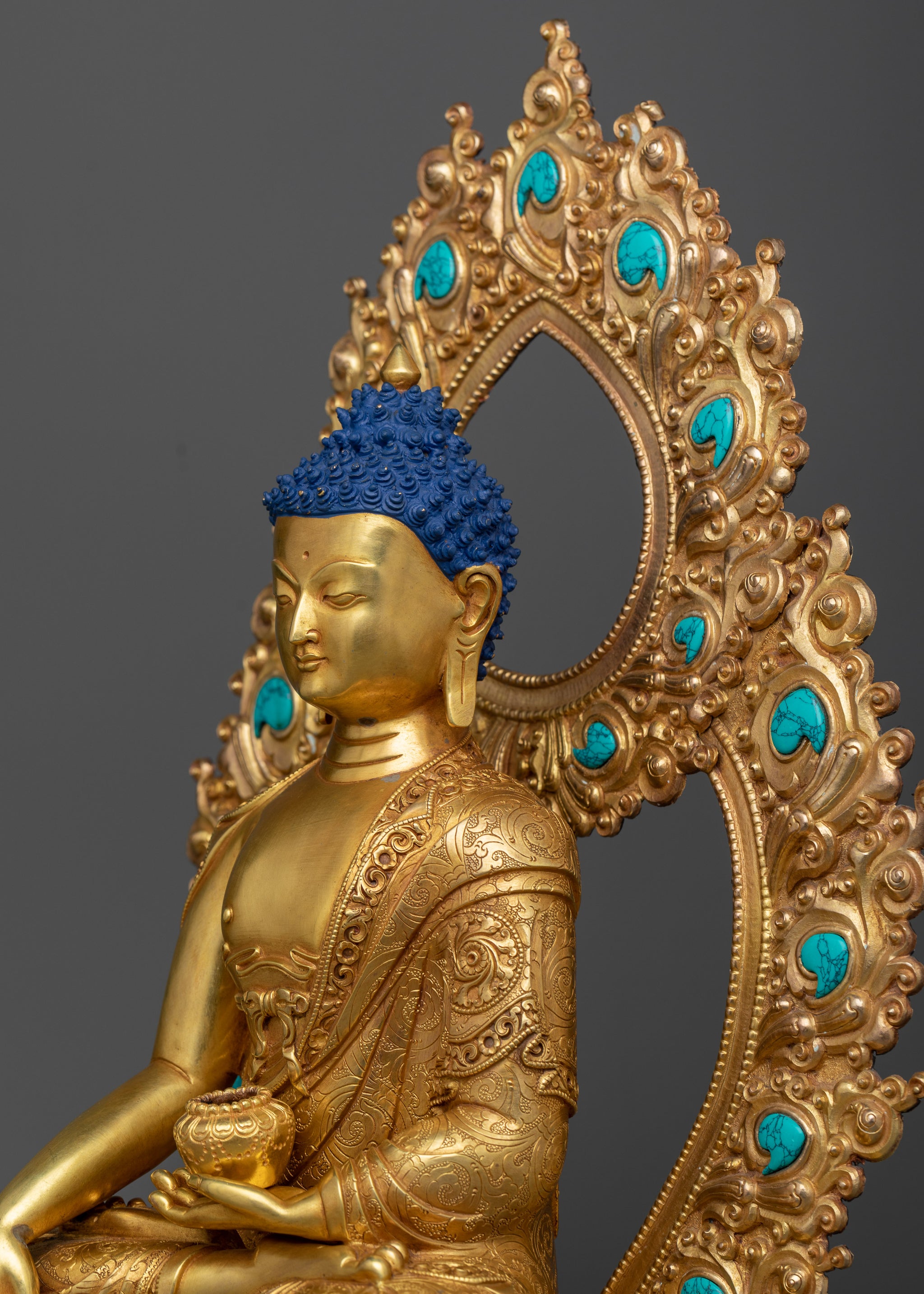This beautifully handmade statue depicts the founder of Buddhism, Shakyamuni Buddha, sitting on a double lotus seat with calm expression. He holds an alms bowl with his left hand and right hand in the earth touching mudara. The halo behind the statue is beautifully hand-carved with perfectly carved blue stones engraved to match the existing carving of the throne. The statue is 17.7 inches tall and weighs 5.65kg.