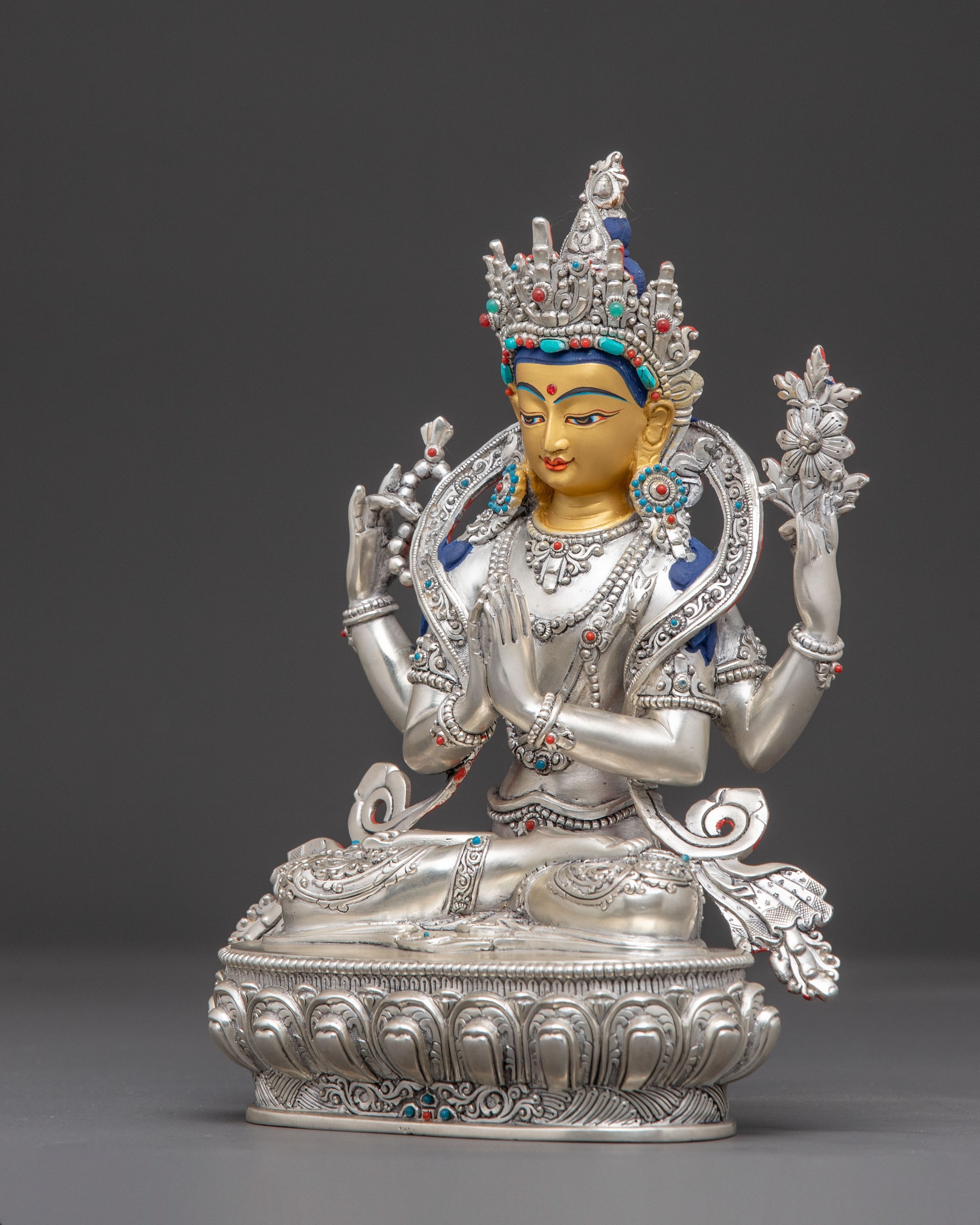 The Handmade Sacred Chenrezig Tibetan Icon for Blessings, representing the embodiment of boundless compassion, embodies boundless love, peace, and a desire to alleviate the suffering of all beings. This handcrafted statue is 8.7" (Height) x 6.5" (Base) and weighs 1.48 kg. It is made of 90% pure silver, adorned with gold and acrylic paintings, and embellished with gemstones. This sculpture, created by expert Nepalese artisans, symbolizes the spiritual traditions of Himalayan Buddhism and makes a meaningful addition to altars, meditation places, or sacred collections.