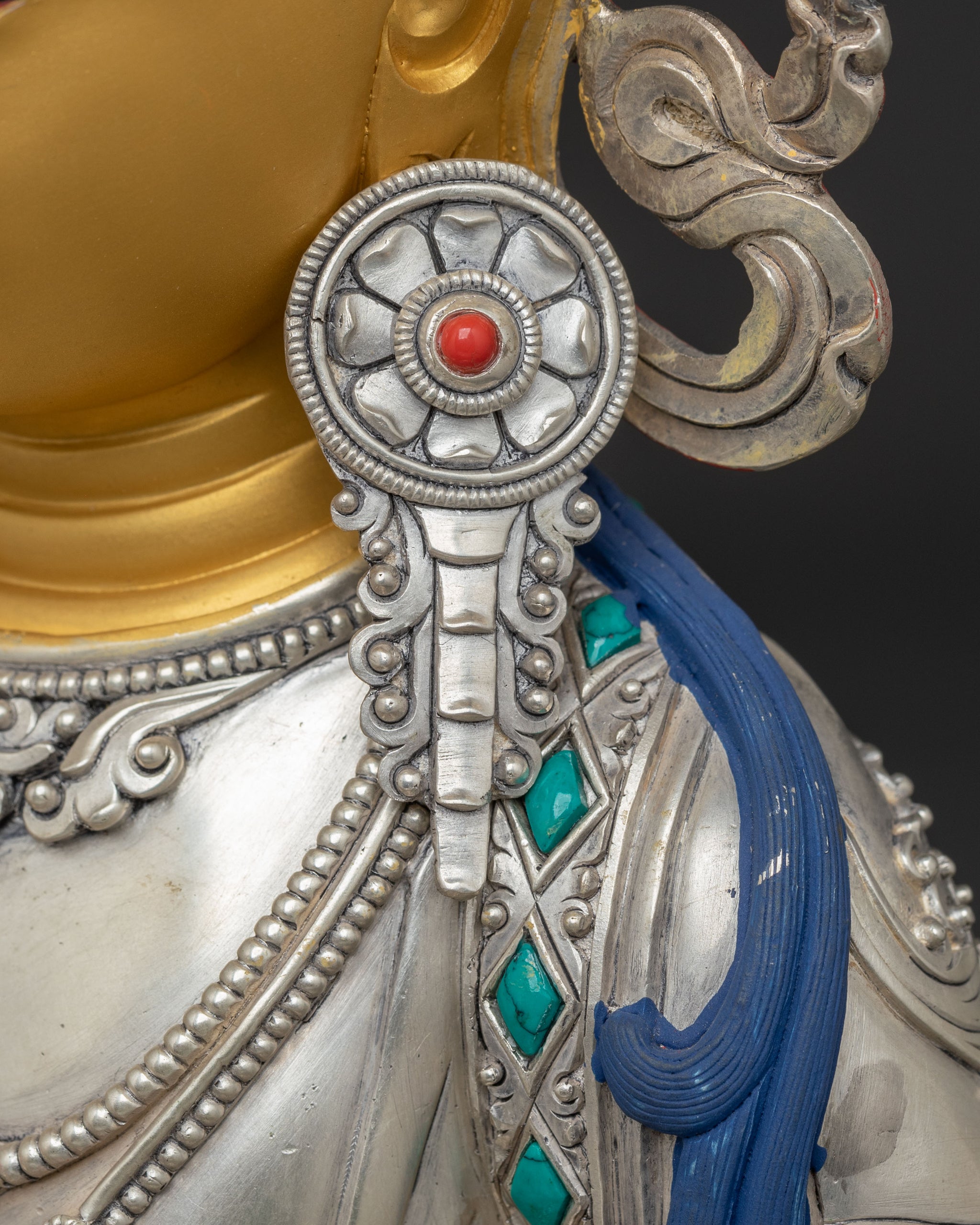 The Statue of Dorje Sempa, Lord of Purification, stands 15.9" (40.5 cm) tall with a 12.0" (30.5 cm) base and weighs 5.14 kg. Crafted from 90% pure silver and adorned with gold and acrylic paintings, this elegant piece radiates purity and spiritual refinement. Handcrafted by skilled Nepali artisans, it beautifully represents the sacred traditions of Himalayan Buddhism, making it an inspiring centerpiece for altars and meditation spaces.