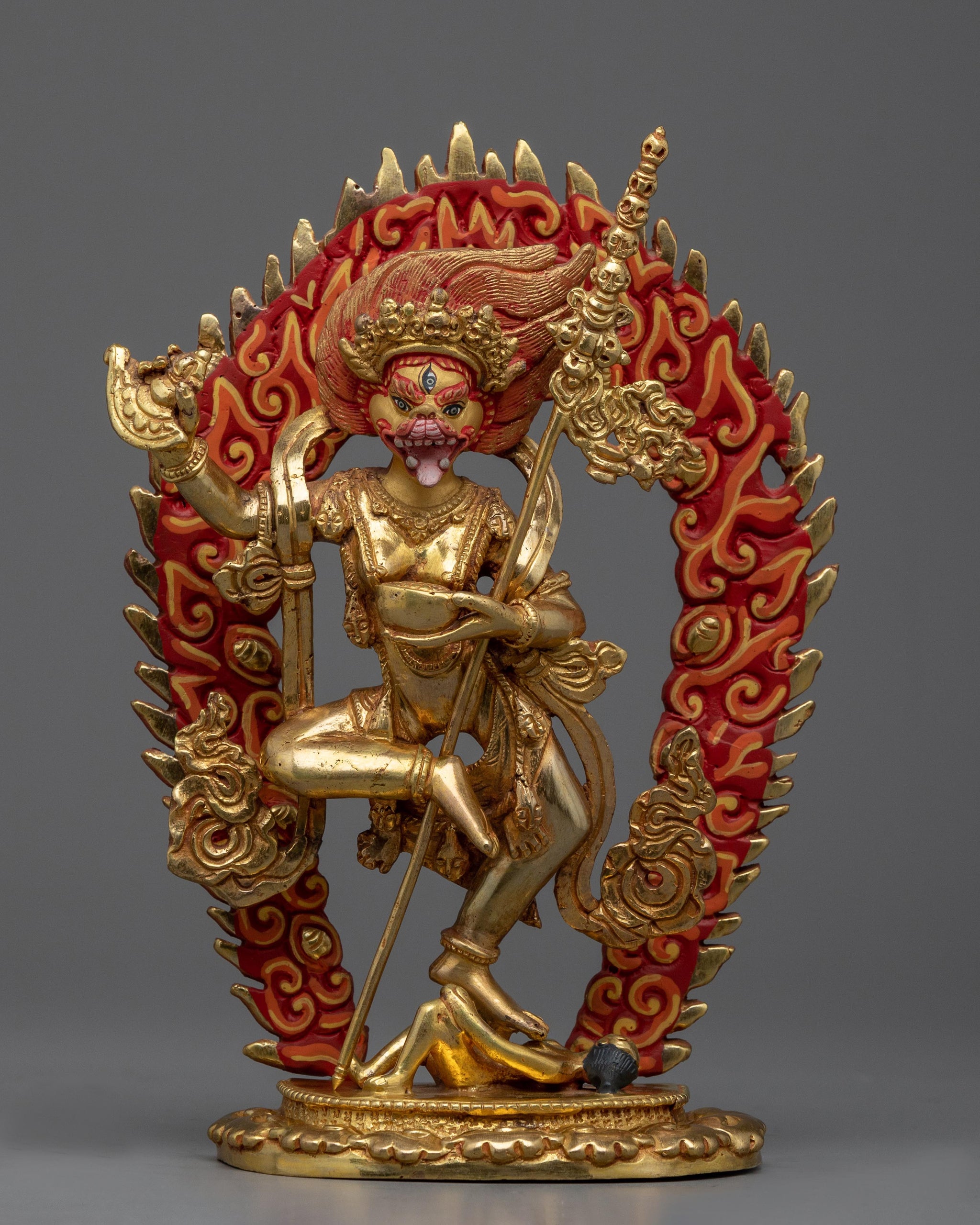 The Simhamukha statue is a beacon of esoteric enlightenment, towering 7.4 inches tall on a 5.1-inch base. It is a big and sturdy depiction of Buddhist art, weighing 1.01 kilogram. The 24k Gold gilding, combined with the vibrant acrylic paintings, highlights every aspect of this interesting figure, making it a great addition to any collection or environment.