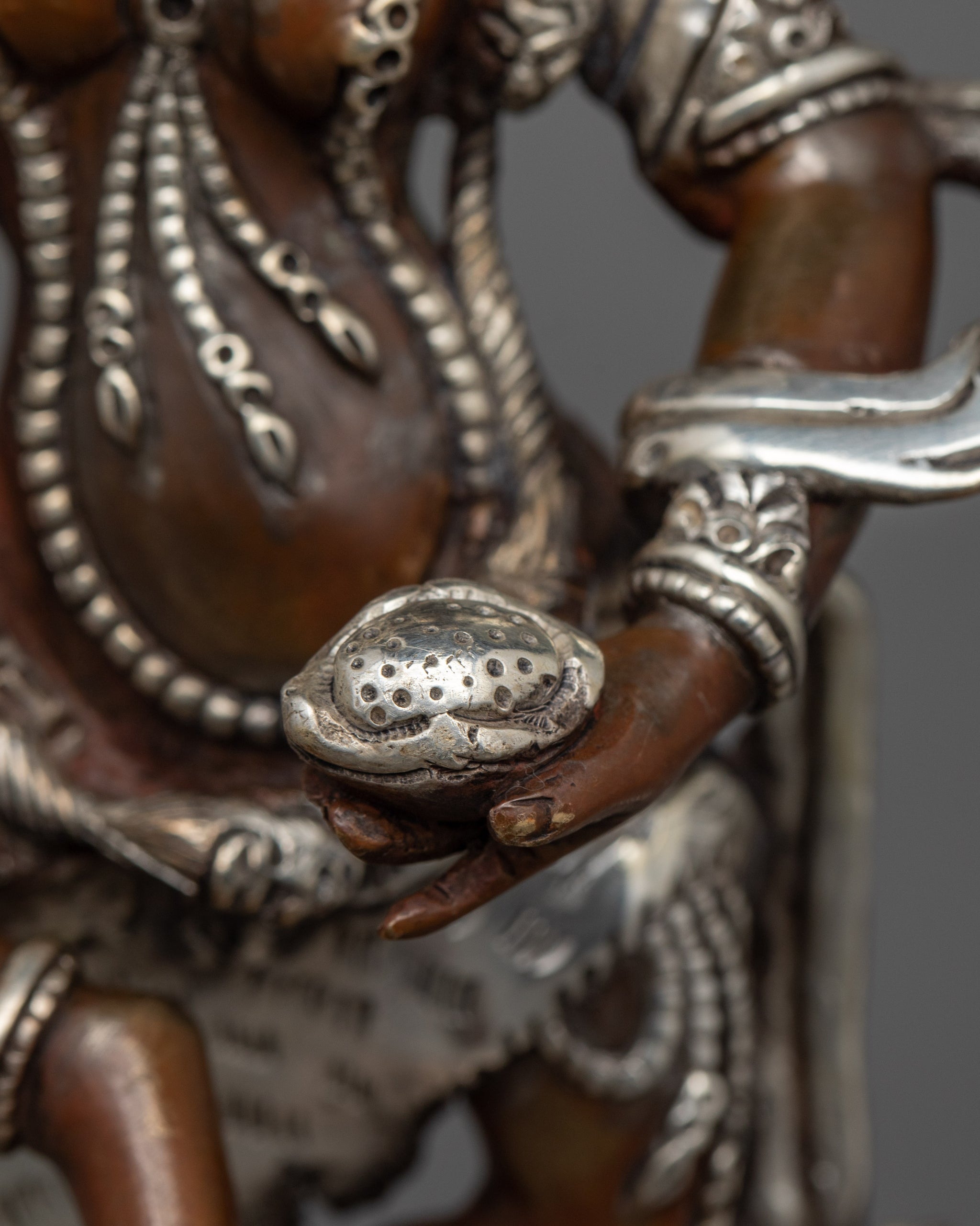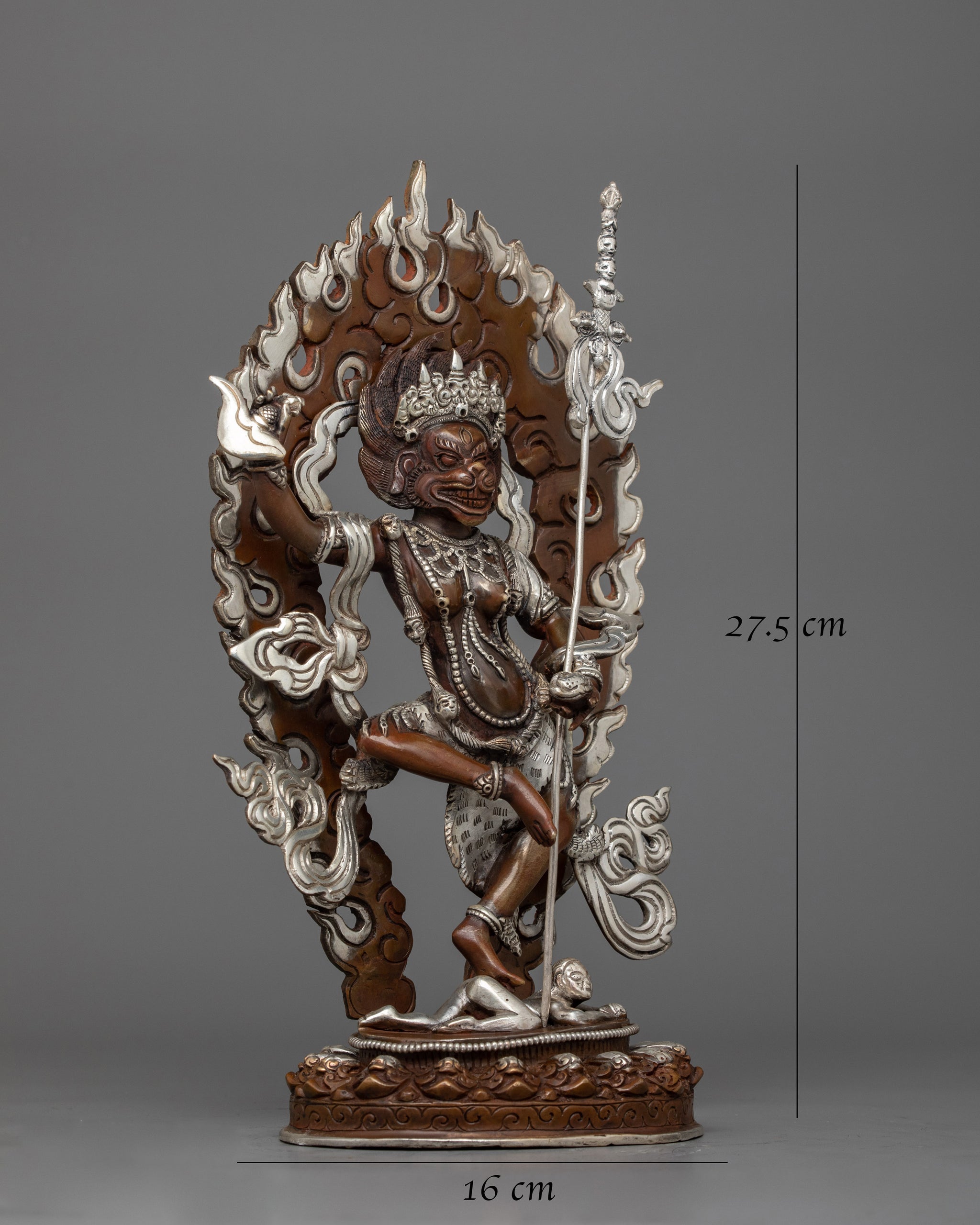This Simhamukha sculpture, known in Tibetan Buddhism as the Lion-Faced Dakini, depicts strong knowledge, spiritual protection, and the ability to overcome negative forces. This handcrafted statue is 10.8" (Height) x 6.3" (Base) and weighs 1.734 kg. It is made of oxidized copper and has a silver-plated finish. The sculpture, created by expert Nepalese artisans, represents the ancient traditions of Himalayan Buddhism, making it a centerpiece for altars, meditation rooms, or collections dedicated to spiritual enlightenment.