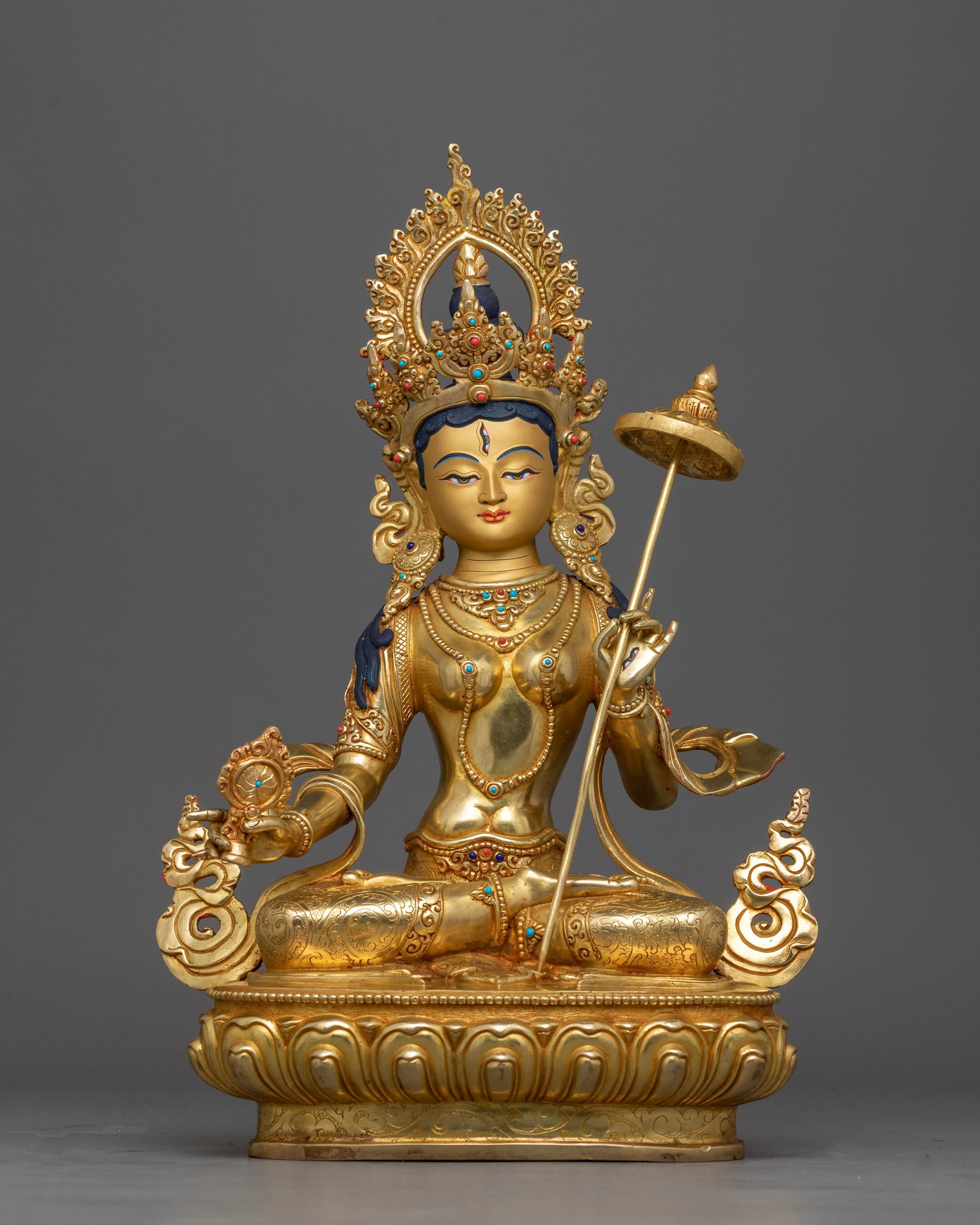 The Sita Atapatra Statue, a protector of spiritual well-being, will elevate your spiritual environment. This statue, which is made of 24K gold gilded copper and stands 14.4 inches tall and weighs 3.72 kg, exhibits beautiful craftsmanship and a shielding atmosphere. The Statue is evidence of the utmost care and attention to detail. The heavenly presence of Sita Atpatara is shown in every little detail, from the finely carved features to the nuanced expressions. This statue exudes a sense of spiritual safety and well-being whether it is positioned near a sacred altar or in a meditation area.