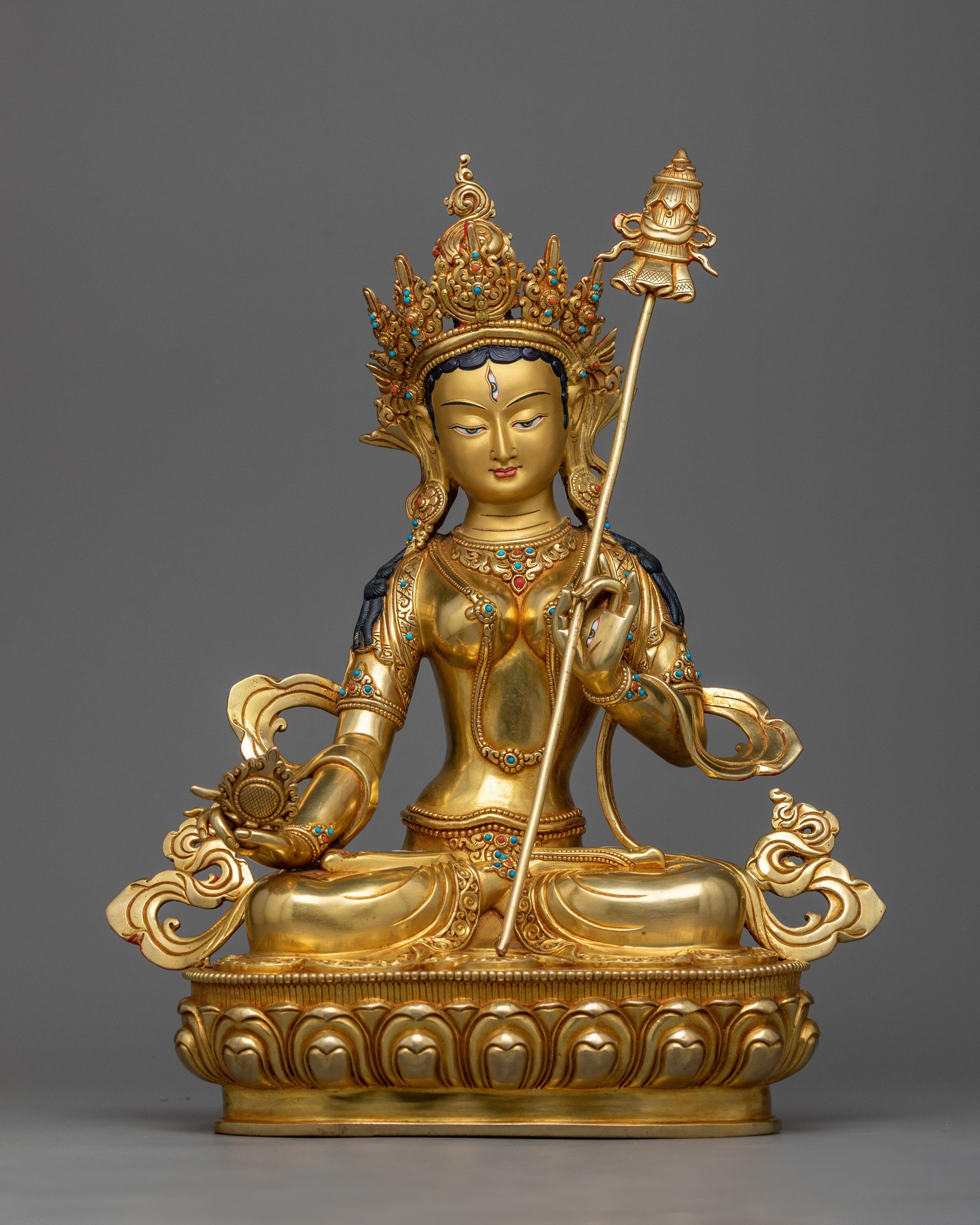 The 24K gold gilding adds a stunning brilliance, symbolizing Sitatapatra's heavenly protective powers. The gold and acrylic paintings add bright details to the statue, from the deity's tranquil yet determined look to the intricate decorations on crown, each of which emphasizes her numerous protective abilities.