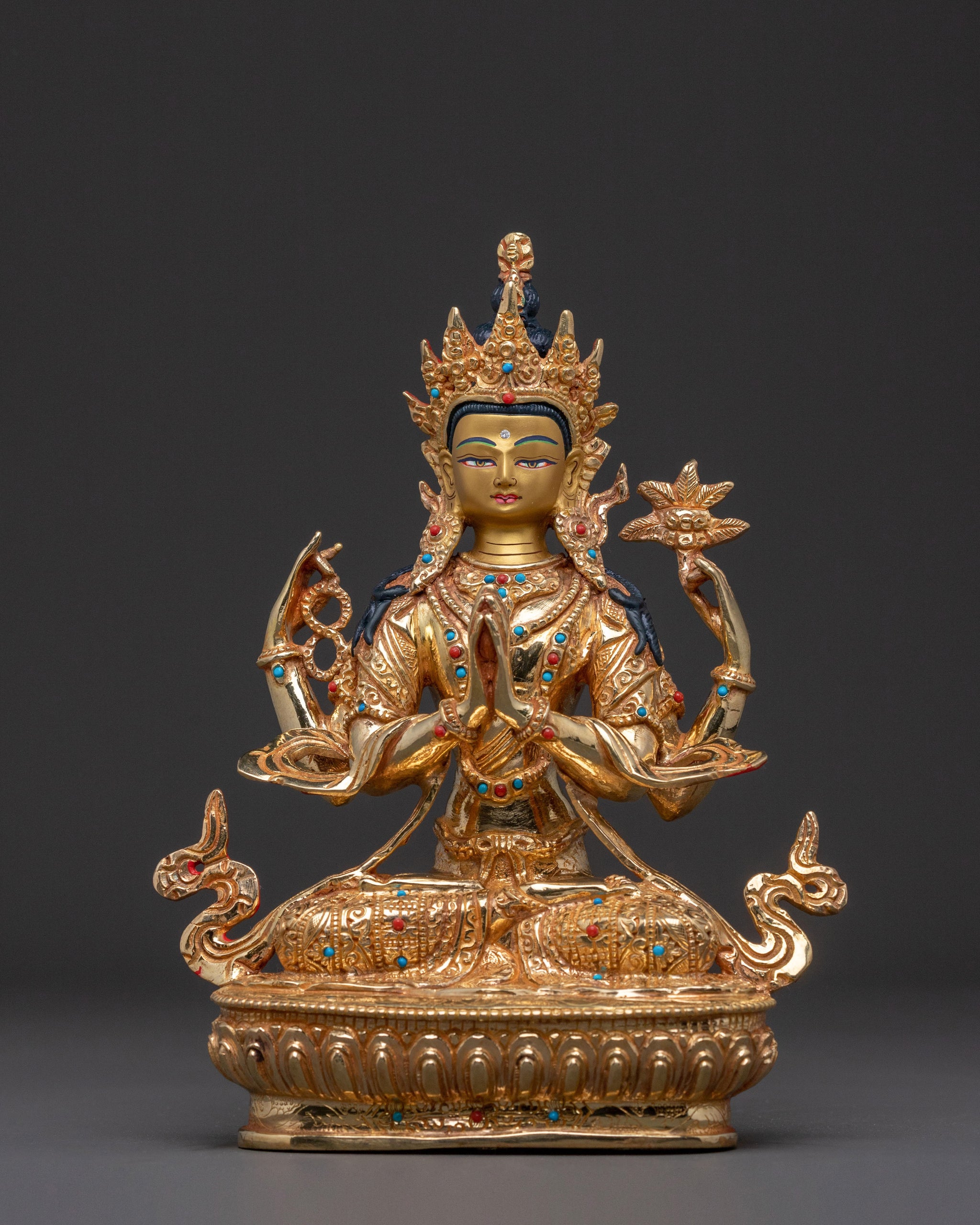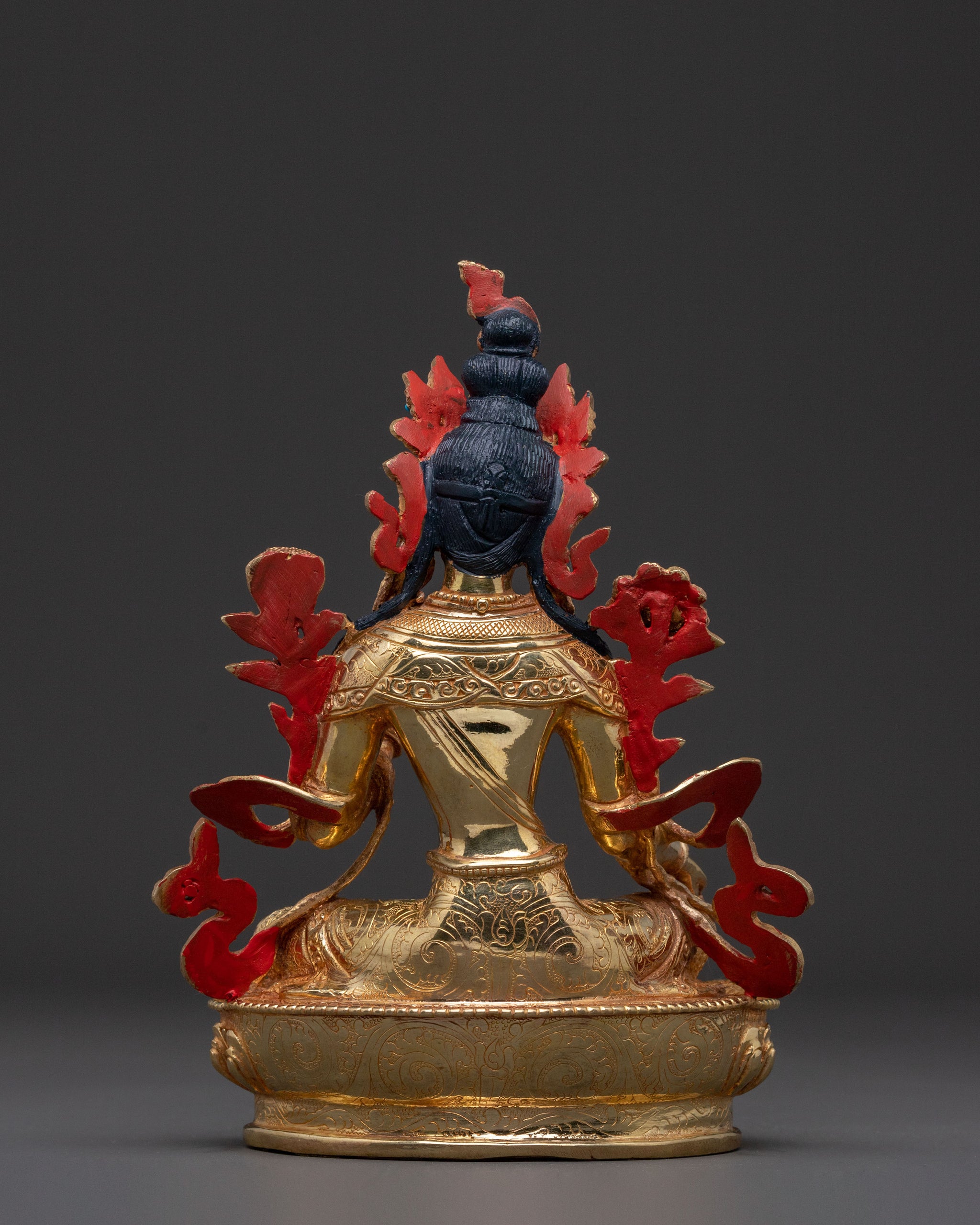 A magnificent Six Bodhisattva set emanates collective grace, crafted with devoted precision to embody the enlightened qualities of these revered figures. Each statue, standing at 9.06 inches (23 cm) tall with a base measuring 7.09 inches (18 cm), is a testament to profound spiritual artistry, bringing peace to any sacred space. Handcrafted in Nepal, this set invites a warm, devotional presence, enhancing any spiritual decor. Covered with a triple layer of 24K gold gilding and carved with deeply engraved designs that produce a magnificent 3D-like effect, it weighs 8.39 kg and radiates both beauty and spiritual depth.