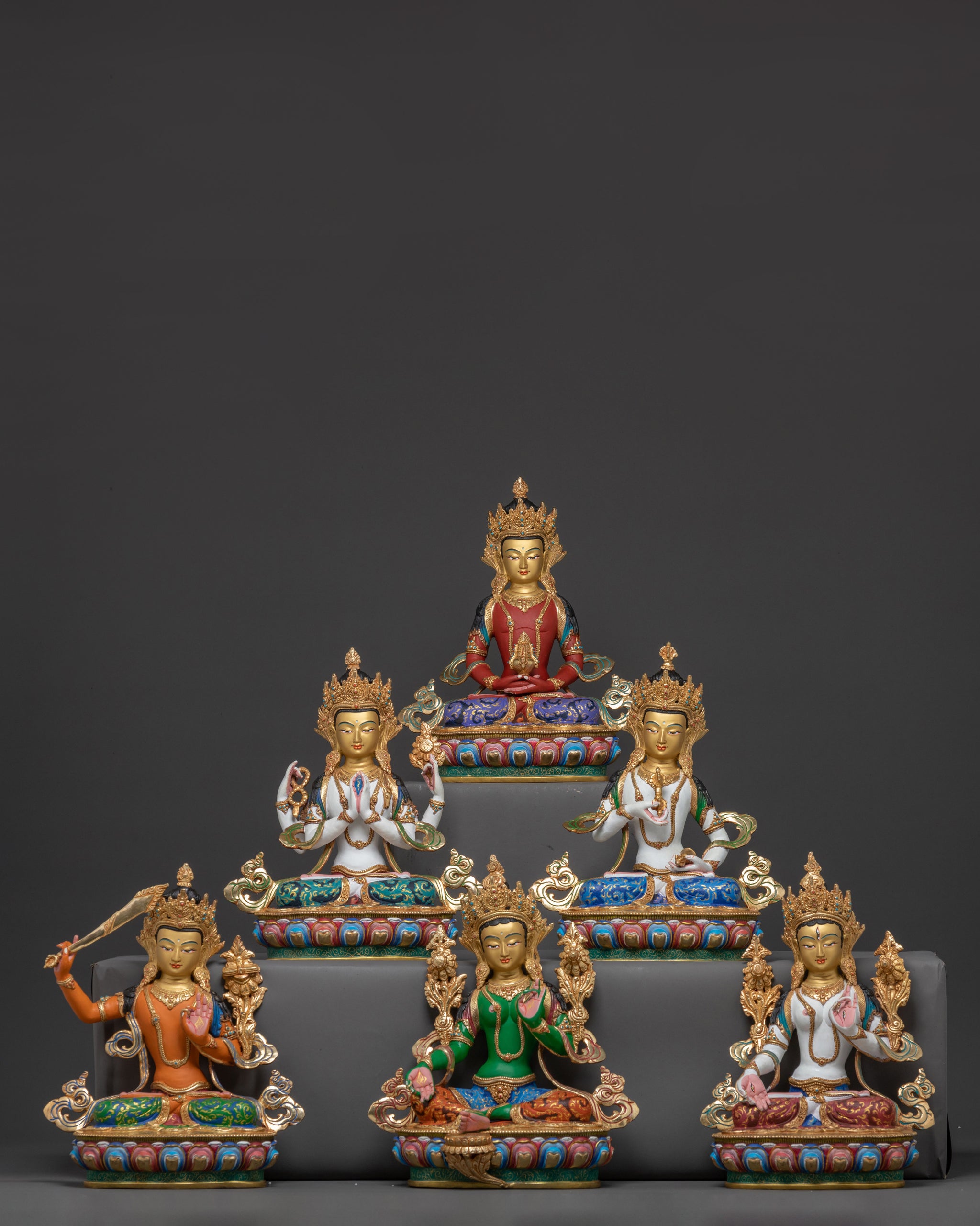 The combined presence of these six Bodhisattvas symbolizes a holistic path to enlightenment. From the boundless compassion of Avalokiteshvara to the sharp wisdom of Manjushri and the unwavering vows of Samantabhadra, this meditation statue set serves as a powerful reminder of virtues essential for spiritual growth. Their collective energy fosters inner peace, mindfulness, and a deep connection to the Bodhisattva ideal.