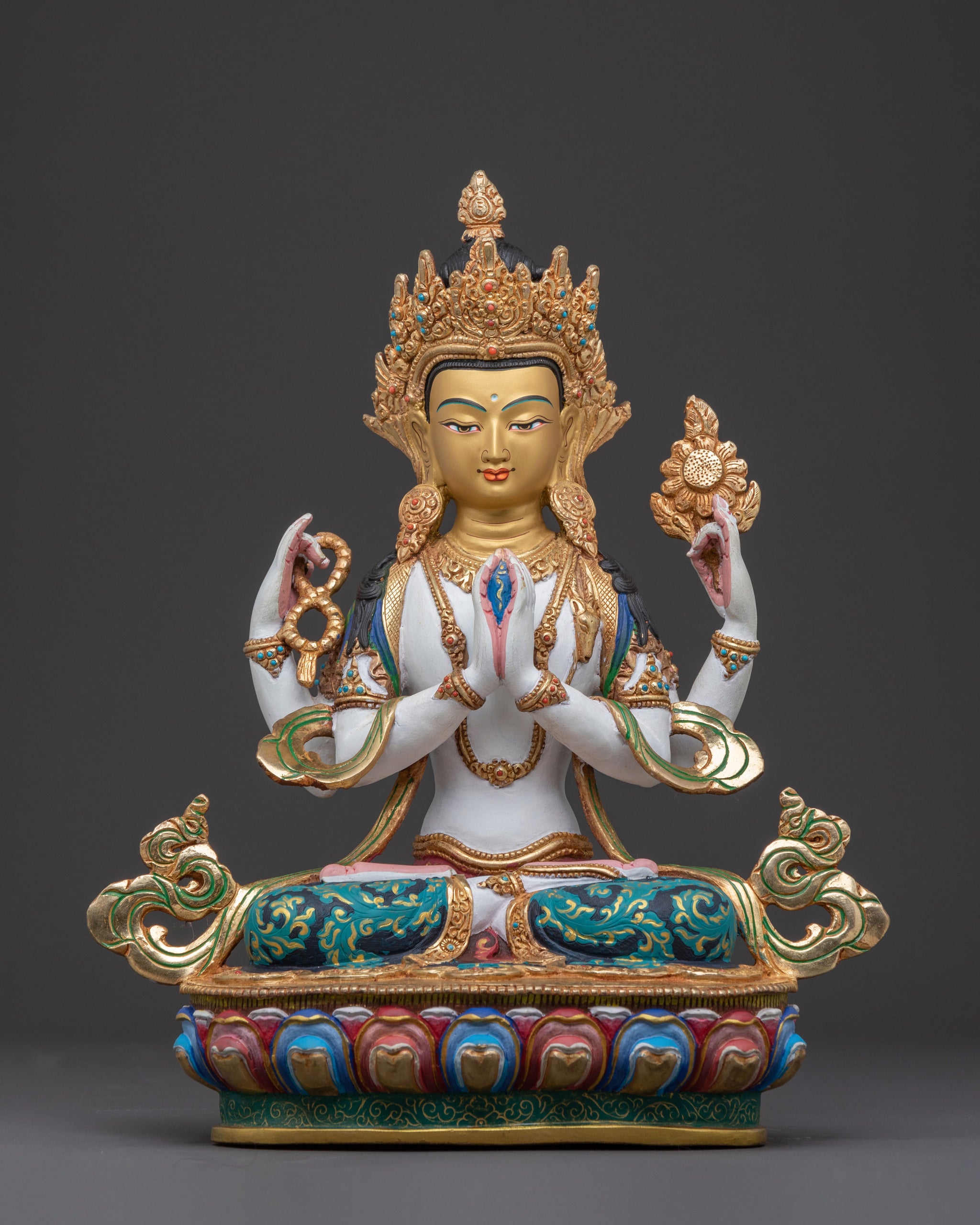 This radiant six-bodhisattva statue, ideal for altars, is meticulously handcrafted in Nepal and gilded with 24K gold, exuding a profound spiritual presence. Standing at 13.39 inches (34 cm) tall and with a base measuring 11.02 inches (28 cm), each figure is sculpted from copper and adorned with vibrant acrylic paintings and gemstone inlays. These figures embody compassion and wisdom, making them an exceptional addition to any spiritual sanctuary. Reflecting generations of Nepali craftsmanship, this exquisite Buddhist art seamlessly blends tradition with timeless beauty. It weighs 23.96 kg, further adding to its presence.