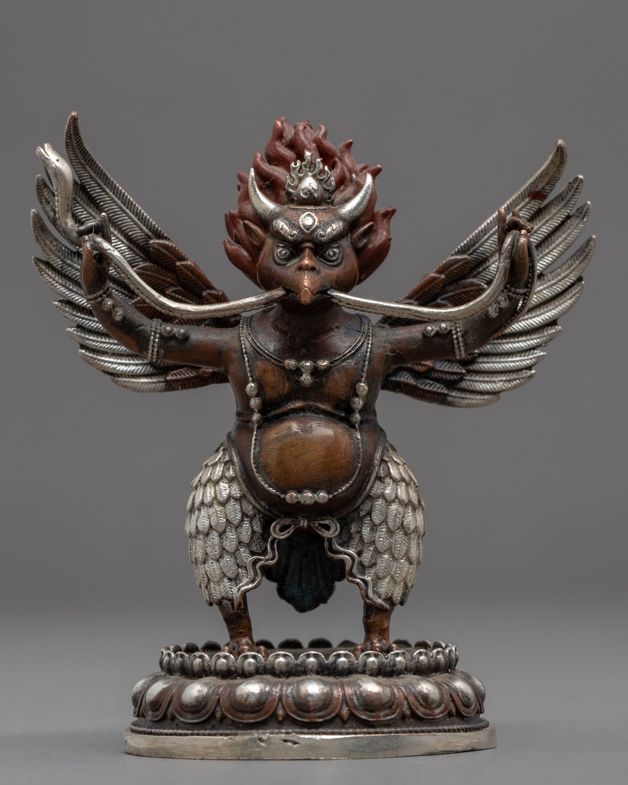 This Small Garuda Sculpture was crafted on a copper body in the machine and plated with bronze and silver. We depicted him standing atop of moon disc of lotus holding a snake in both of his hands. His flowing hair elegantly illuminates his finely hand-carved face, which is wrathful in expression.