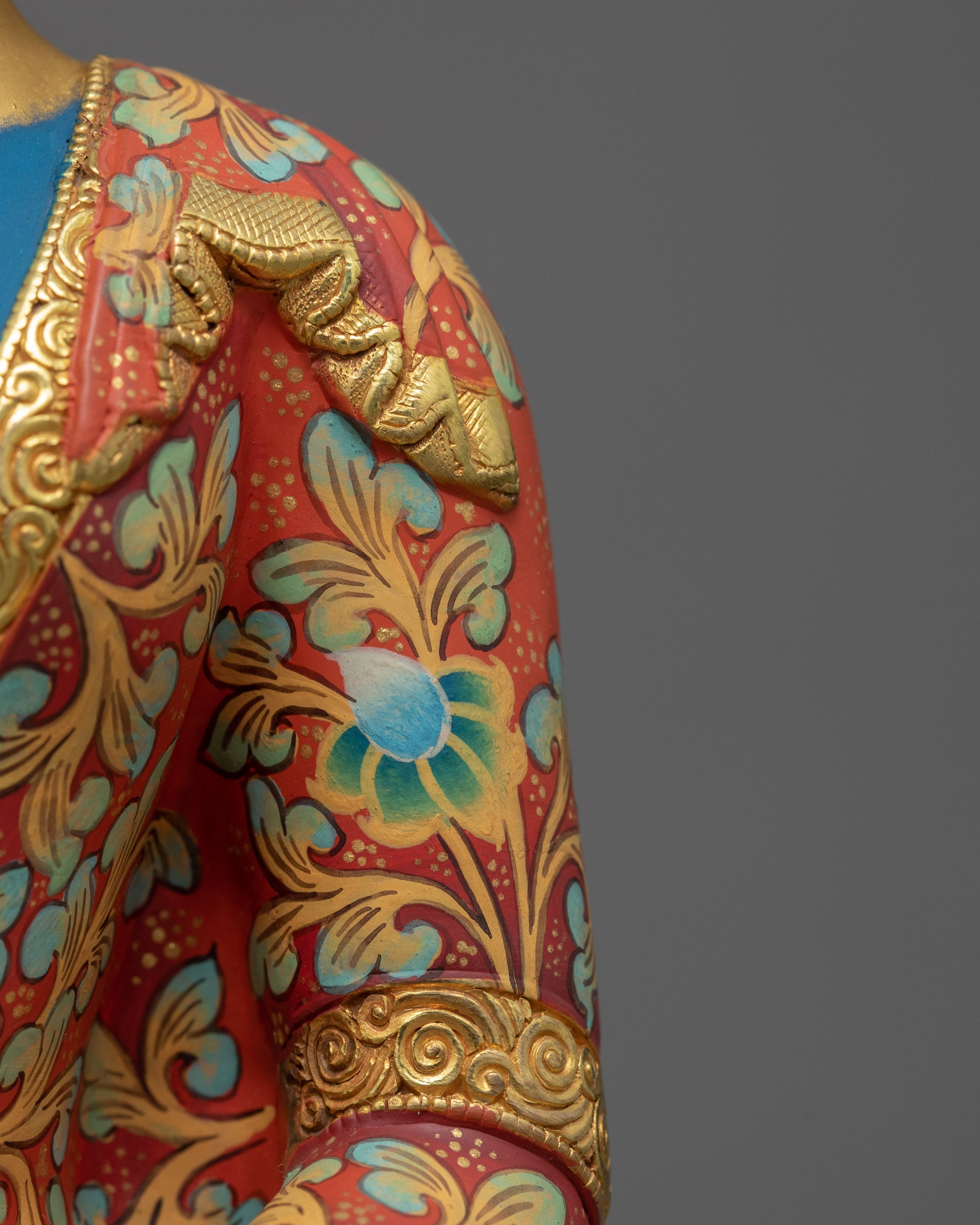 We have elegantly hand-carved the small statue of Medicine Buddha in a traditional Himalayan Art of Nepal. We have depicted a deity on a top of a moon disc lotus seat holding a medicinal herb in his right hand while his left-hand holds a vase. Beautifully designed robe and the ornaments embellished with precious jewels are mesmerizing and hand-painted by us. The materials used in this statue are of high quality and will last for many years. This auspicious healing Buddha figurine will be a tremendous gift from Nepal to a practitioner like you.