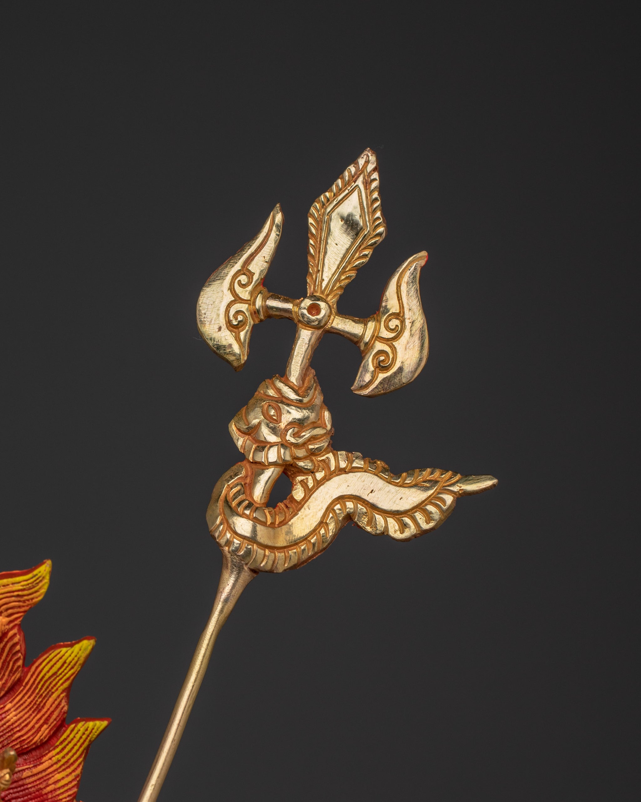 Begtse stands on a sun disc, with his right foot on the corpse of a horse and his left on the corpse of a man, a typical stance for wrathful deities that symbolizes his conquest over worldly and spiritual enemies. He wears protective armor reminiscent of a Tibetan warrior’s mail coat, reflecting his origin as a war deity. His crown is made of five skulls, symbolizing the transformation of the five poisons into wisdom, and he wears a necklace of fifty freshly severed heads, signifying his power over enemies and obstacles. His right hand wields a scorpion-handled sword, a weapon to cut through ignorance and evil. His left hand clutches a fresh human heart, symbolizing the death of ego and dominance over earthly life. In the crook of his left arm, he holds a bow and arrow with a banner, and a long lance rests on his shoulder, reinforcing his warrior aspect. Despite his terrifying appearance, Begtse Chen’s wrath is compassionate and purposeful - it protects the Dharma and practitioners by frightening away demons and obstacles.