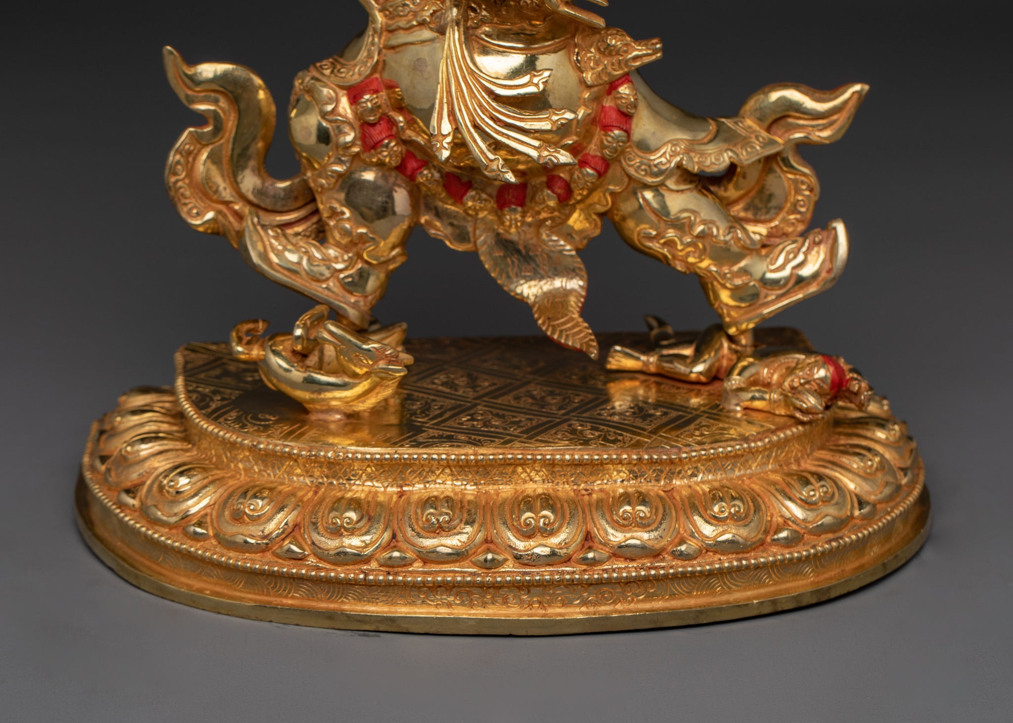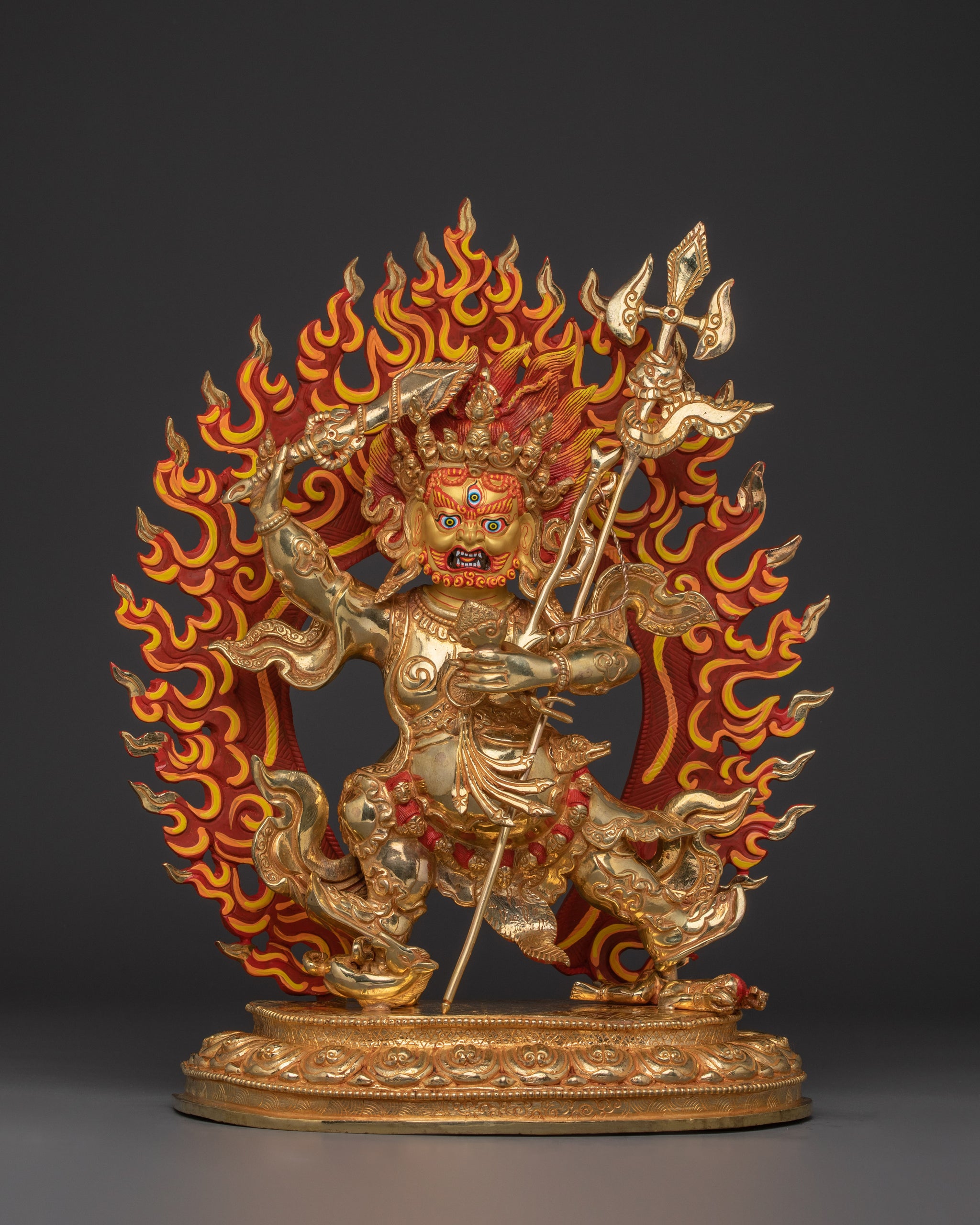 Spiritual Defender Begsten Chen Statue is 15.2 inches (38.5 cm) in height with a base measuring 12.2 inches (31 cm) and weighs 5.71 kilograms. It is handcrafted from a copper body, 24K gold gilding, and gold and acrylic paintings, showcasing exceptional Nepalese artistry. This sculpture radiates power and sacred presence, ideal for a meditation altar or spiritual space.