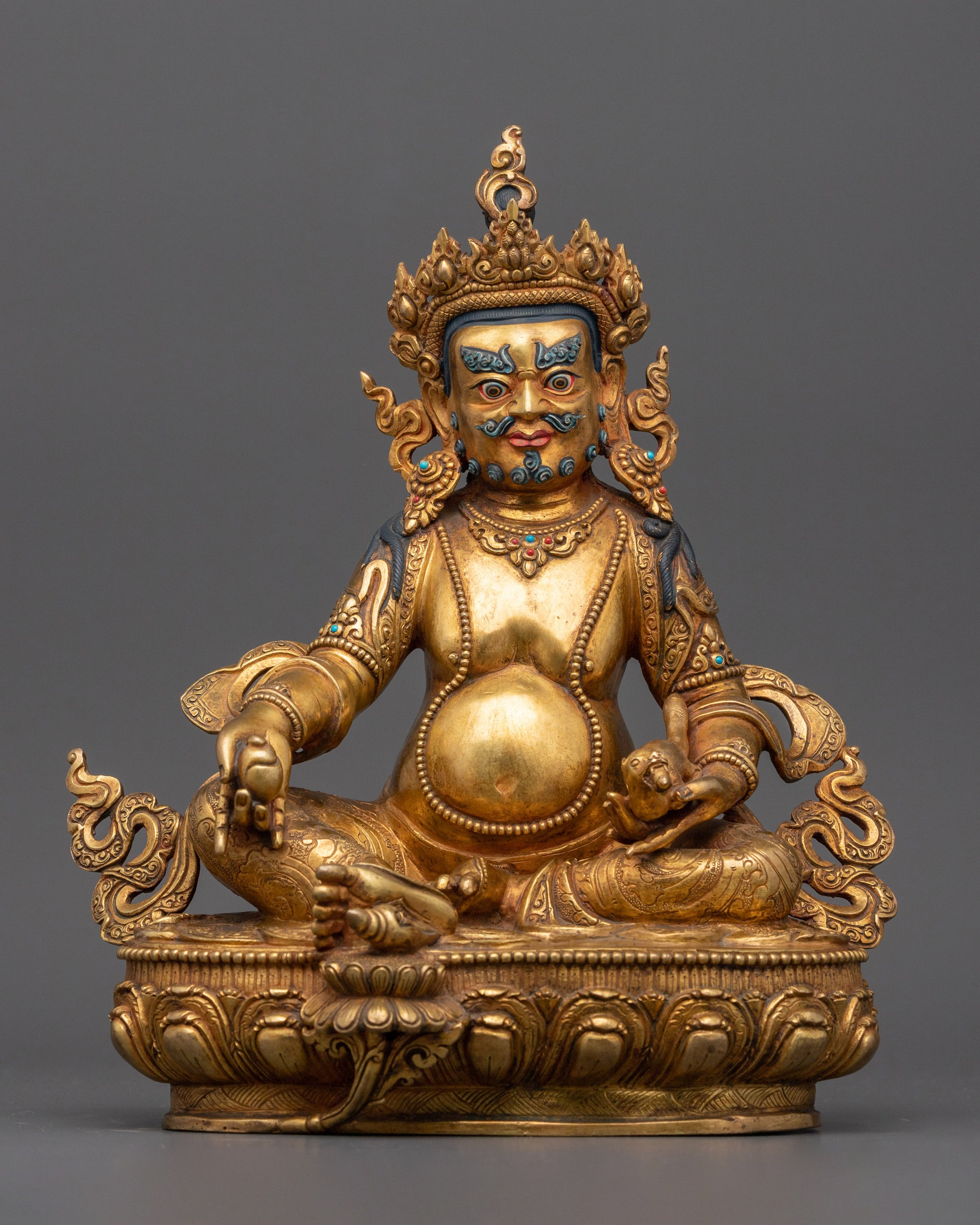 With the magnificent Spiritual Dzambhala Sculpture, you may deepen your spiritual practice and attract riches. This finely wrought figure has accents of 24K gold and is composed of gilded copper. In our studio, we have a handmade Buddhist wealth deity of the Gold Dzambhala Statue in traditional Himalayan art of Nepal. We have sculpted sacred deities of Buddhism for generations and always adhere to their authentic iconography while depicting them in the statue. Dzamabhala, also known as Kubera in Sanskrit, is sitting on the moon disc of the Lotus seat with a wrathful expression. He holds a mongoose in one hand and citron fruit in the other.