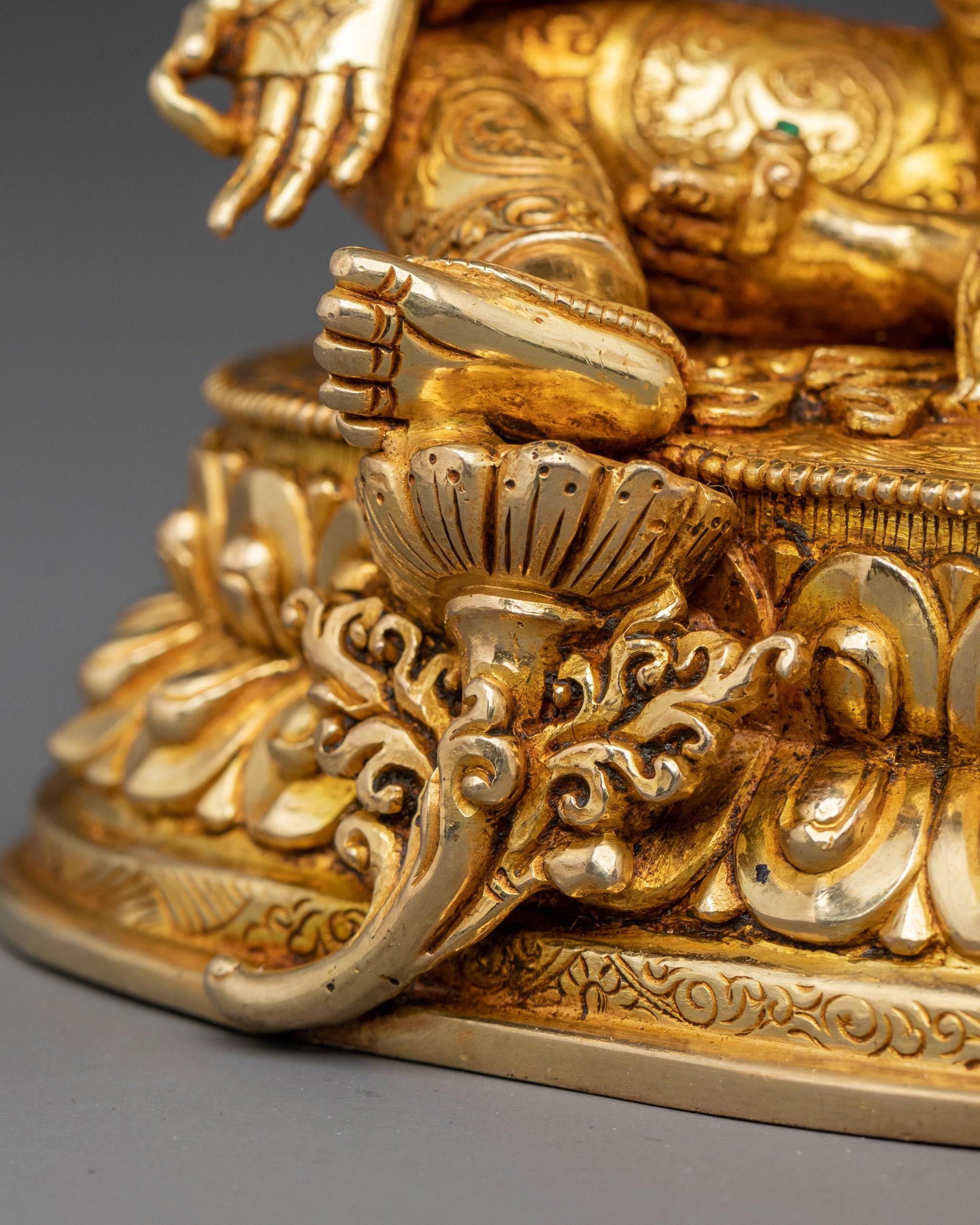 Radiating swift liberation and profound serenity, this spiritual Green Tara compassion statue embodies vibrant presence. Born from the revered traditions of Nepalese craftsmanship, it is meticulously handcrafted from a solid copper body, adorned with a triple layer of 24K gold gilding and intricate acrylics. It stands 19 cm (7.48”) tall with a 14.5 cm (5.71”) base, weighing 1.28 kg. Deeply engraved carvings create a stunning 3D effect, making it a serene focal point for contemplation and spiritual décor.