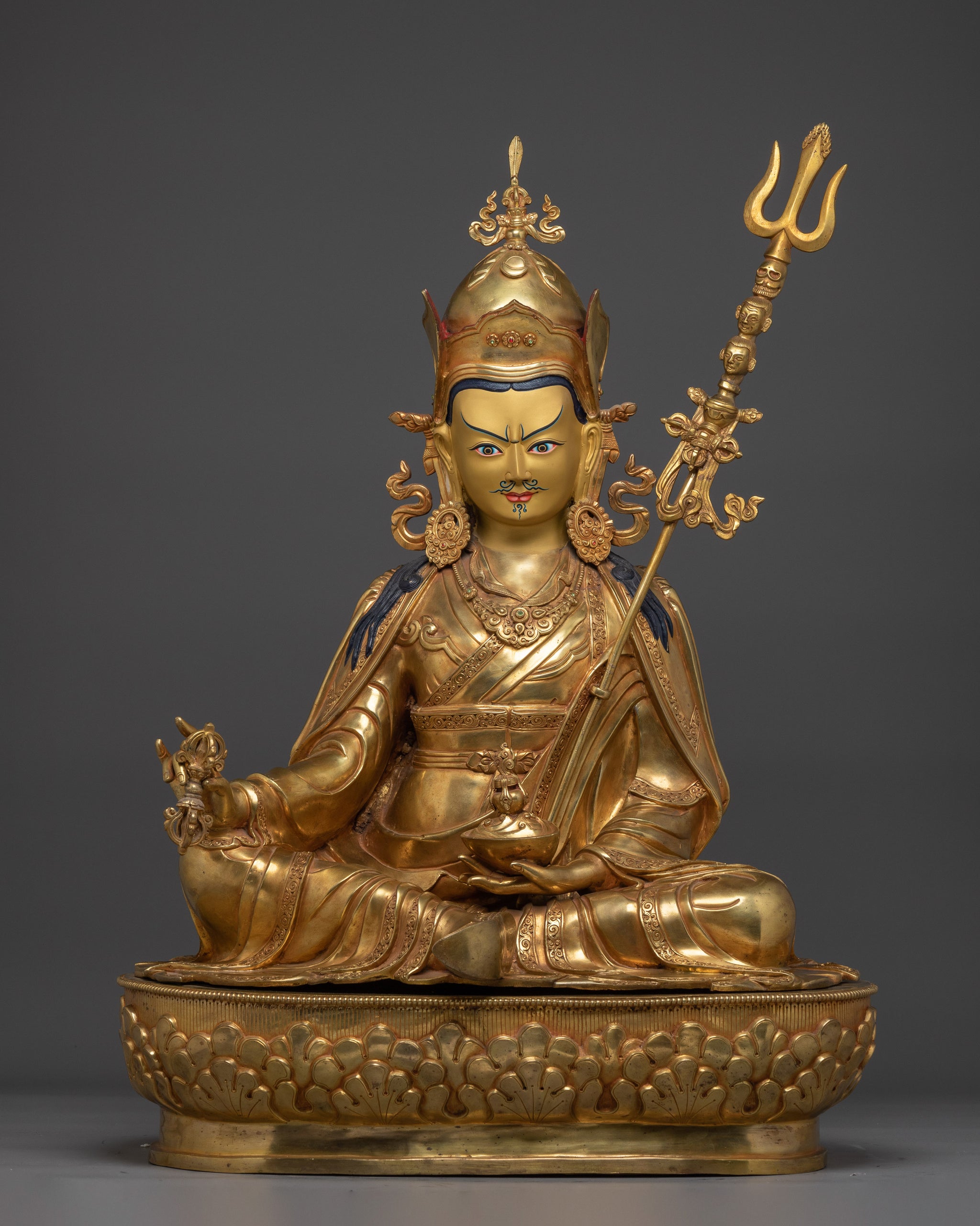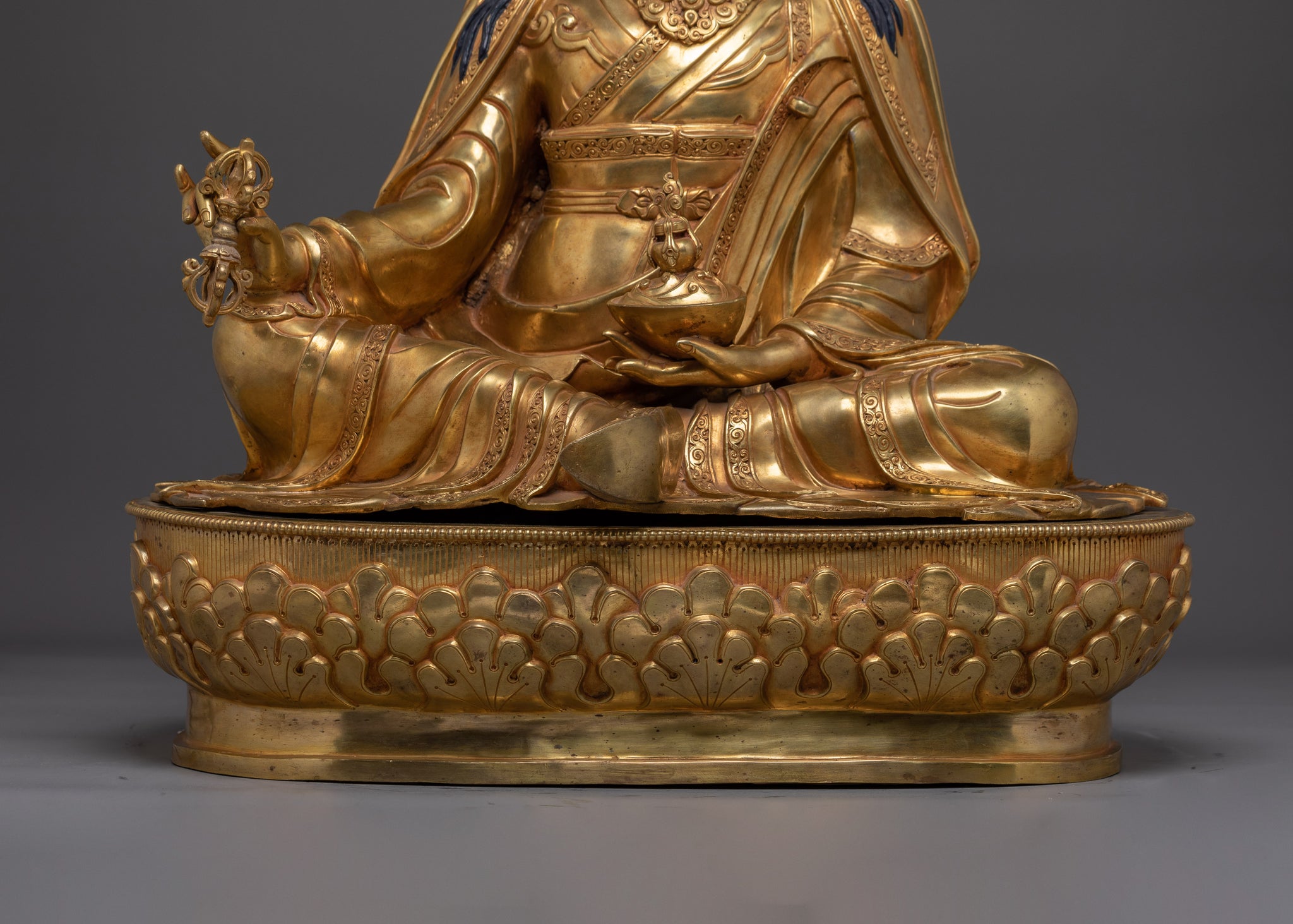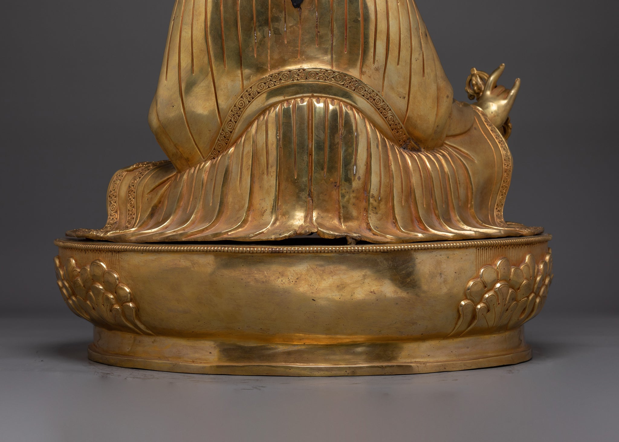 The Spiritual Protector Guru Rinpoche Figurine, also known as Padmasambhava, the founder of Tibetan Buddhism, represents enlightenment, compassion, and spiritual mastery. This handcrafted statue is 29.3" (Height) x 19.7" (Base) and weighs 27.98 kg. It is made of copper, covered with a triple layer of 24K gold gilding, and carved with deeply engraved carvings that produce a magnificent 3D-like effect. This sculpture, handcrafted by expert Nepalese artisans, elegantly symbolizes Himalayan Buddhism's sacred traditions, making it an appropriate addition to altars, meditation places, or sacred collections.