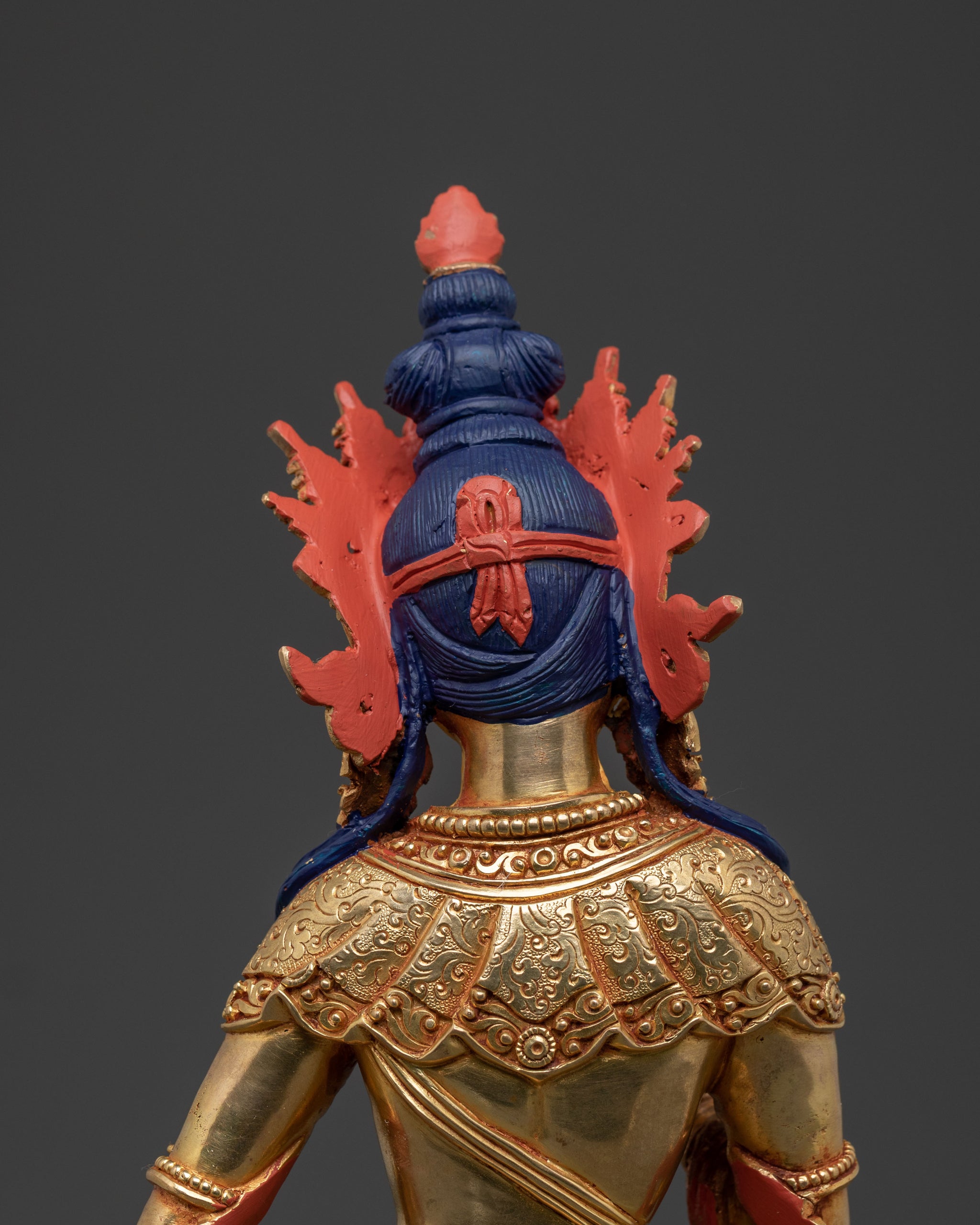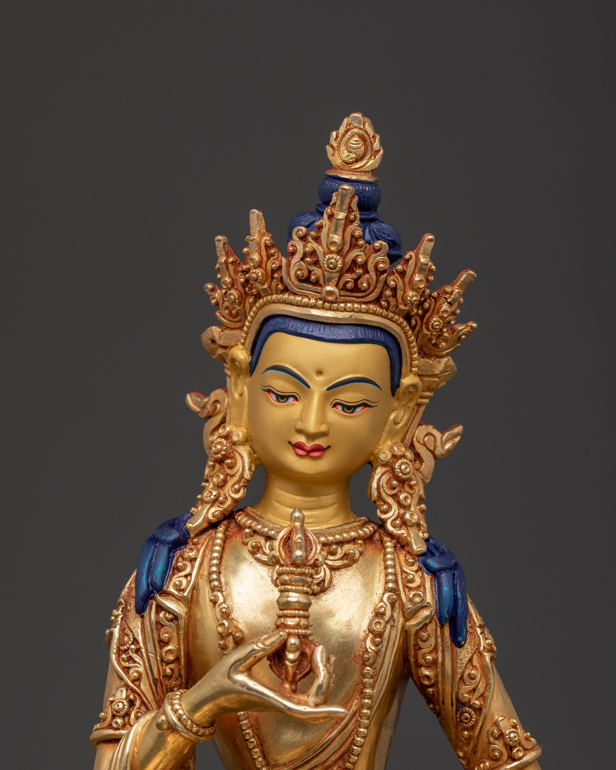 A Vajrasattva statue embodies the essence of purification, gracefully rendered here in a serene 28 cm form. Handcrafted with meticulous detail, this solid copper body sculpture is covered with a triple layer of 24K gold gilding and carved with deeply engraved details that create a magnificent 3D-like effect, further enhanced by vibrant acrylic paintings. Its refined presence offers a tranquil focal point, inviting introspection, clarity, and spiritual cleansing within any sacred space.
