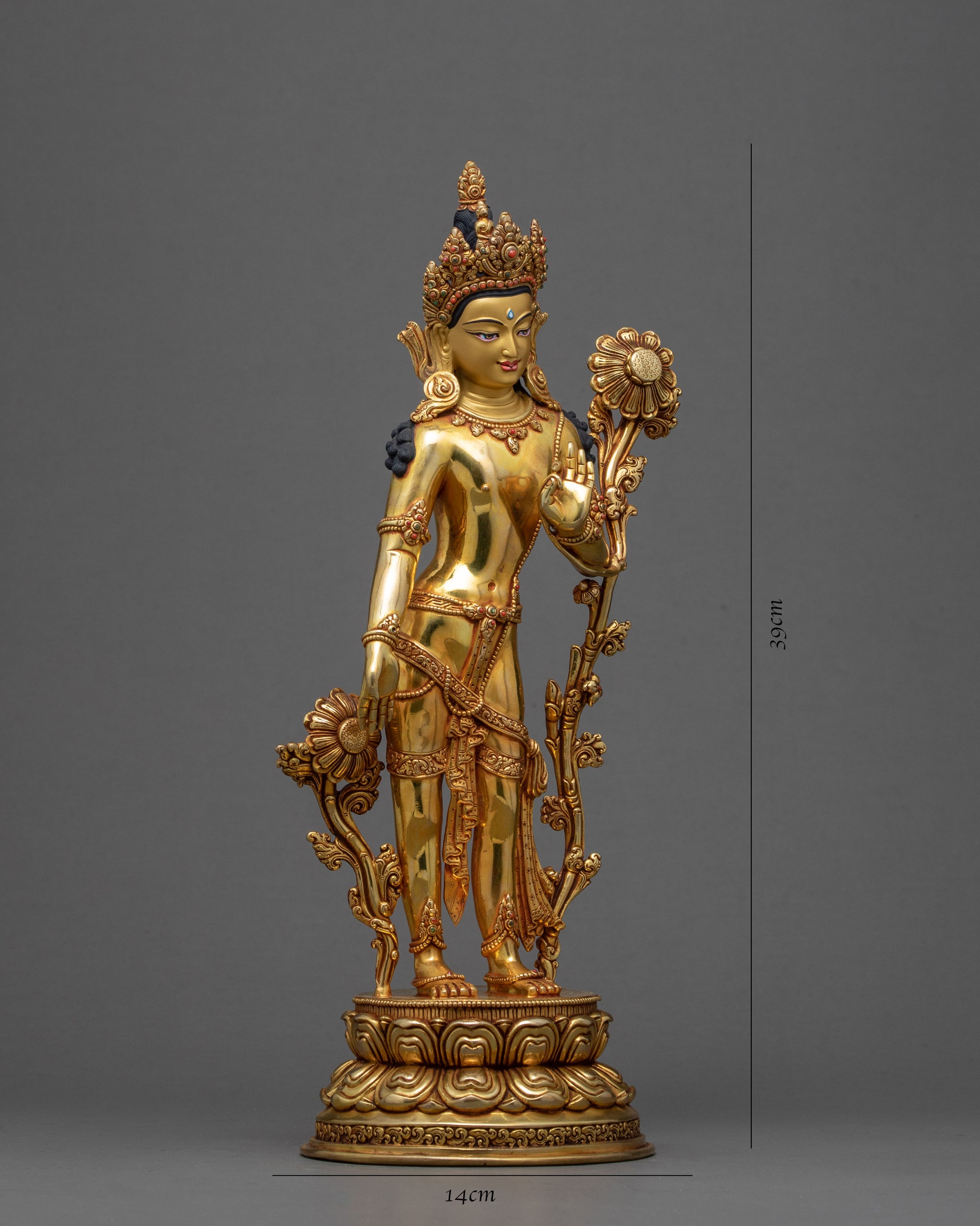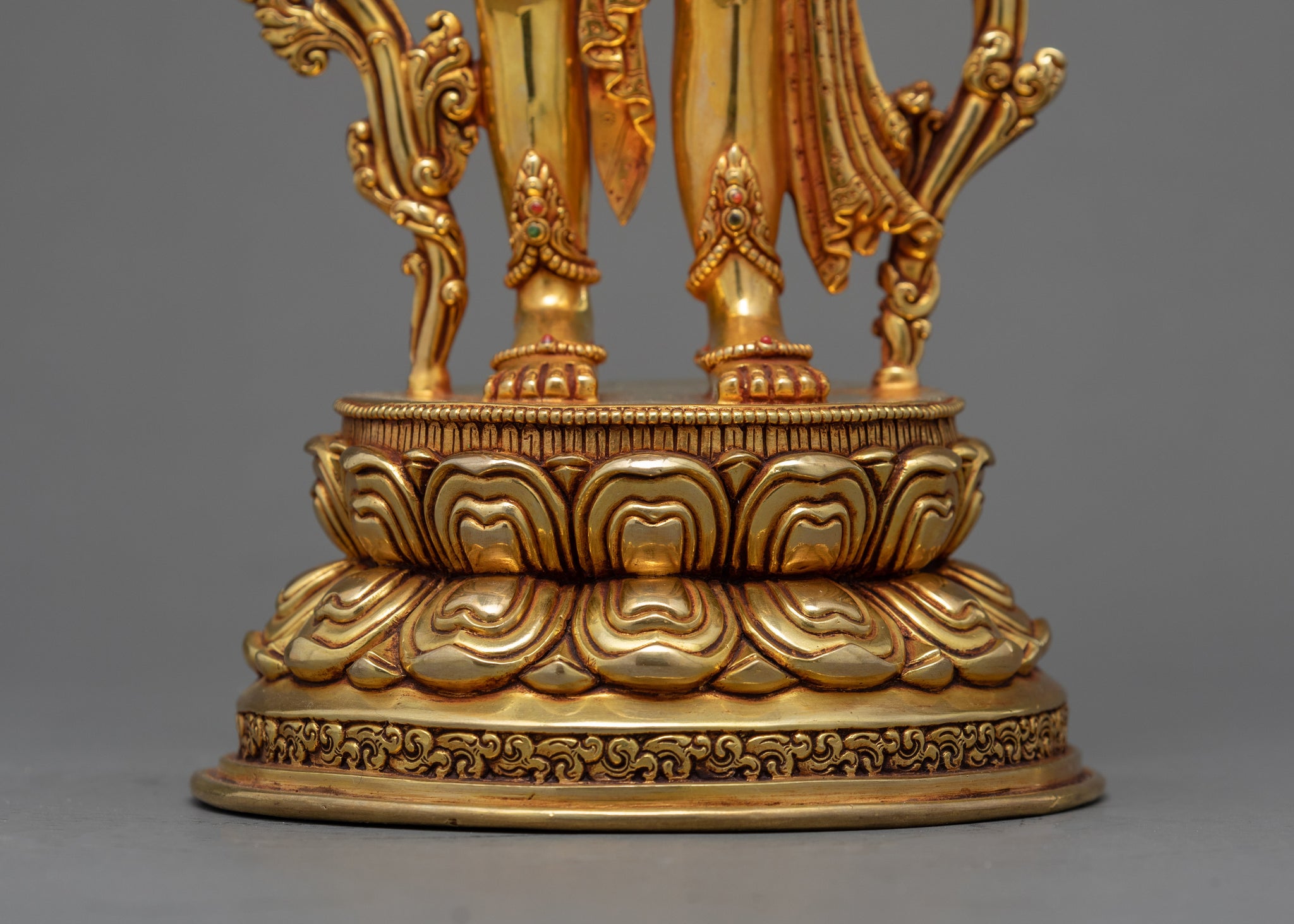 Chenrezig, also known as the Deity of compassion, statue is in standing posture, is wonderfully carved on a copper body and gilded in 24k gold, reflecting his peaceful and persistent look. His one hand is in granting mudra, and the other is holding the stem of lotus. He is represented standing on a lotus and adorned in beautiful ornaments and a bodhisattva crown, with all the appropriate attributes and emblems to assist you in your meditation practice.
