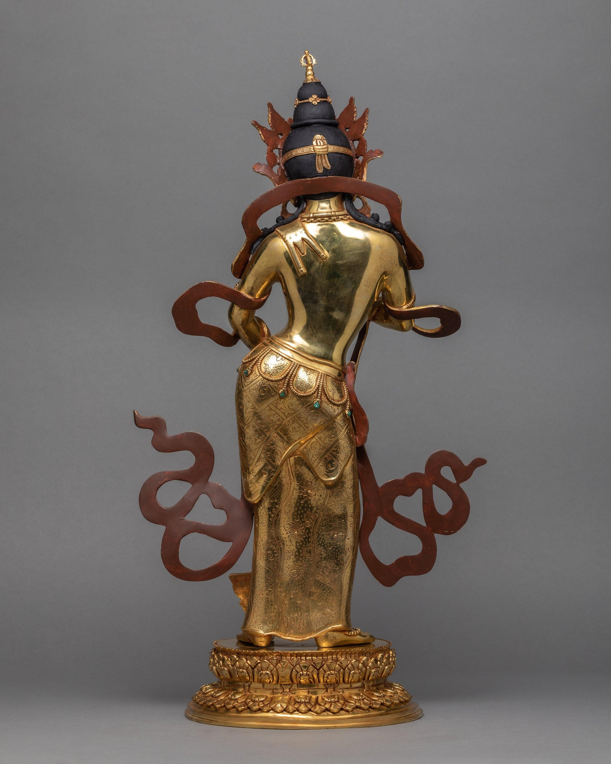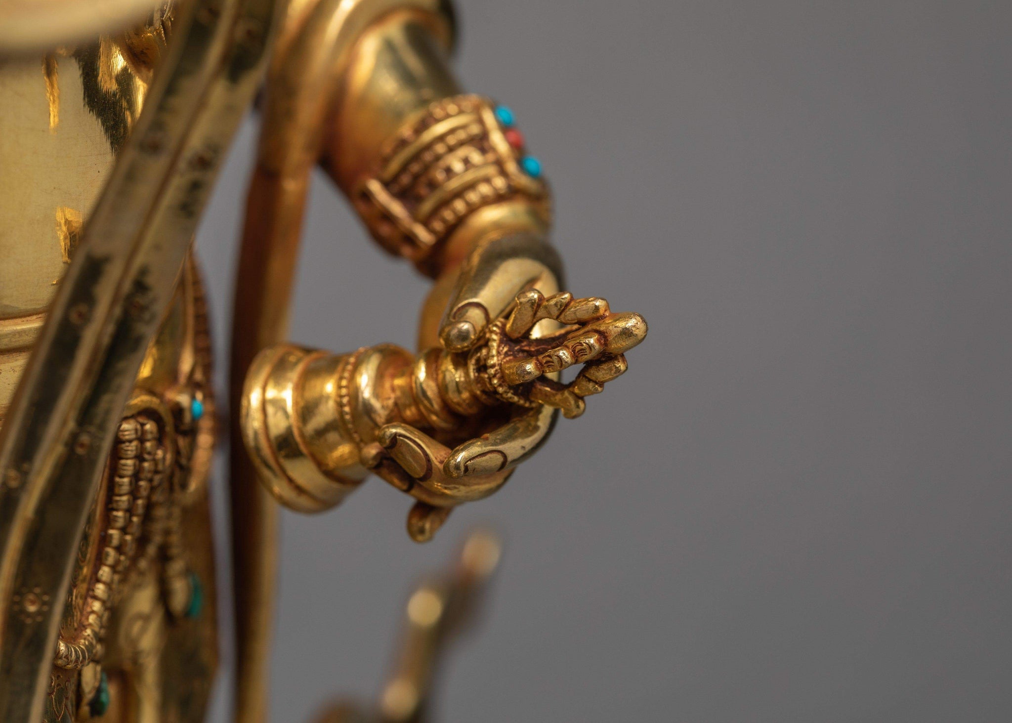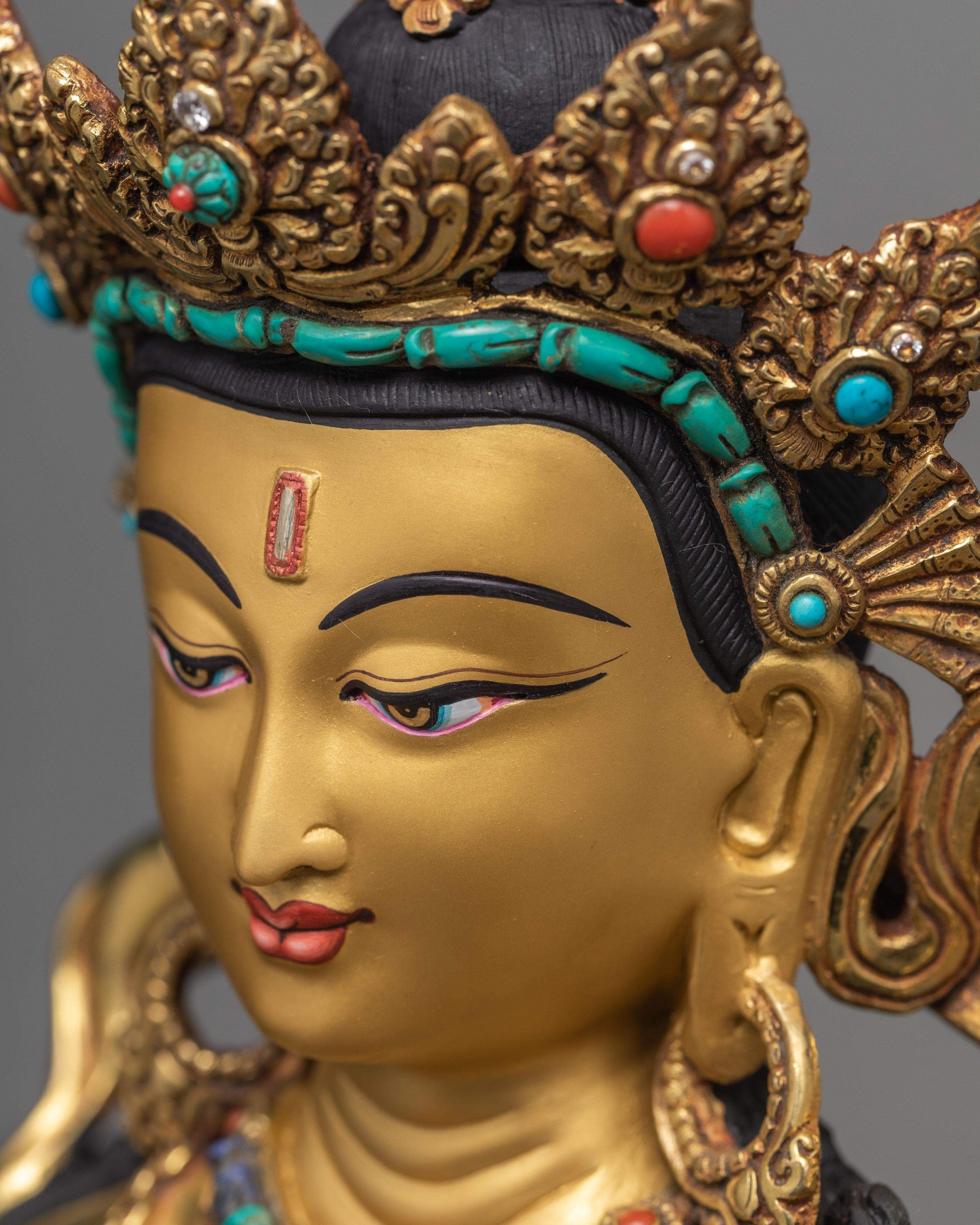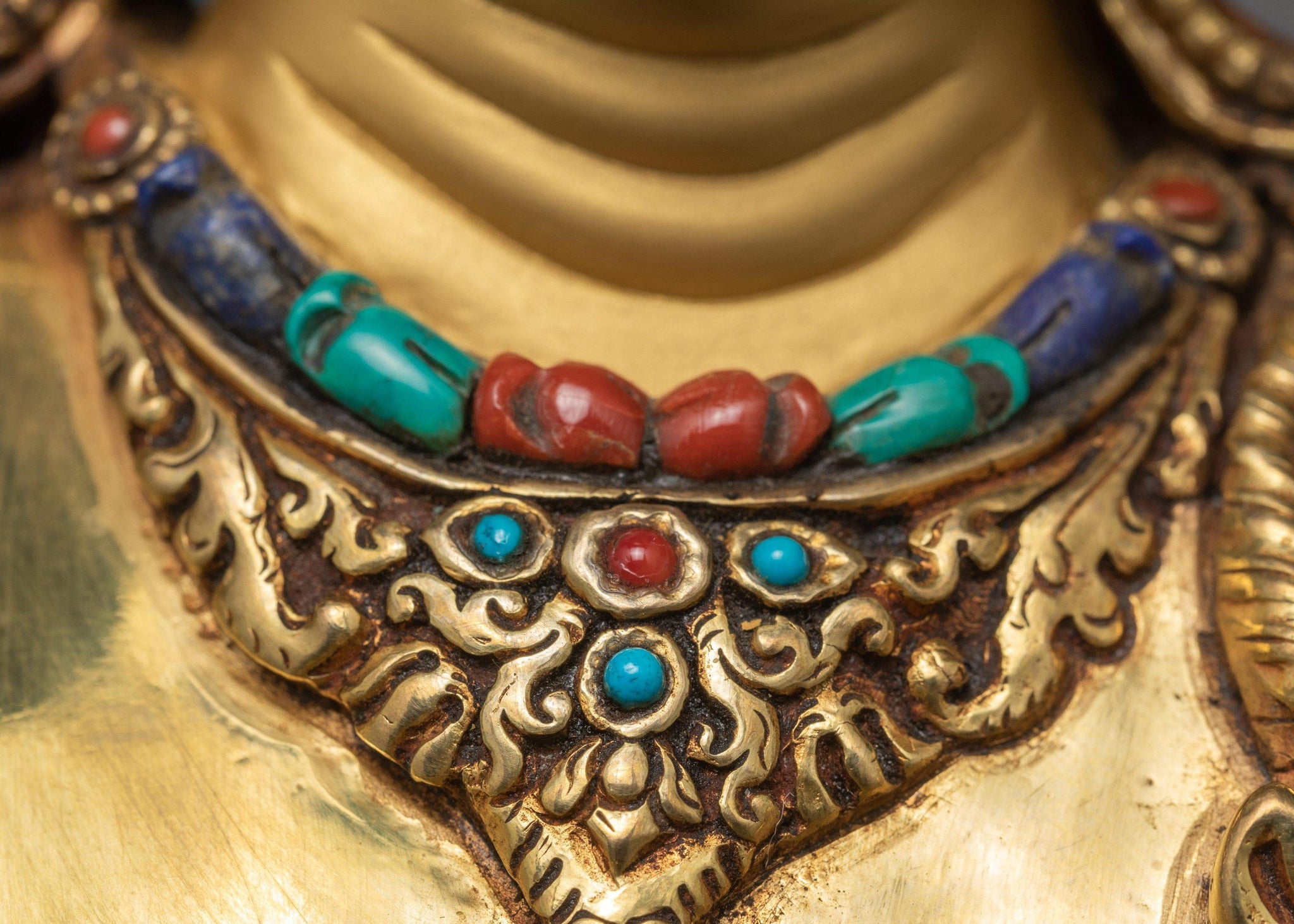 Hand-carved Vajrasatta with turquoise and coral small inlays shows an intricate work. A beautifully calm expression on the face, gilded with pure 24K Gold.