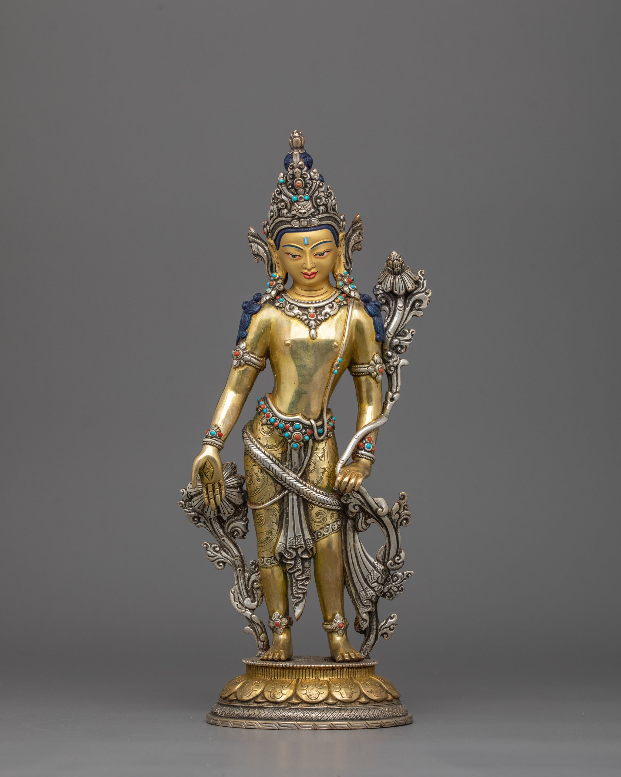 Lokeshwor is depicted standing gracefully, radiating calm and compassion. His serene expression and royal stance symbolize his divine authority and his boundless compassion for all beings. This statue is an ideal addition to any Buddhist altar, meditation area, or home décor because of its silver-plated finish, which heightens its holy appeal. The statue of Lokeshwor is a powerful representation of heavenly protection, regardless of whether you are a Buddhist or someone looking for spiritual serenity.