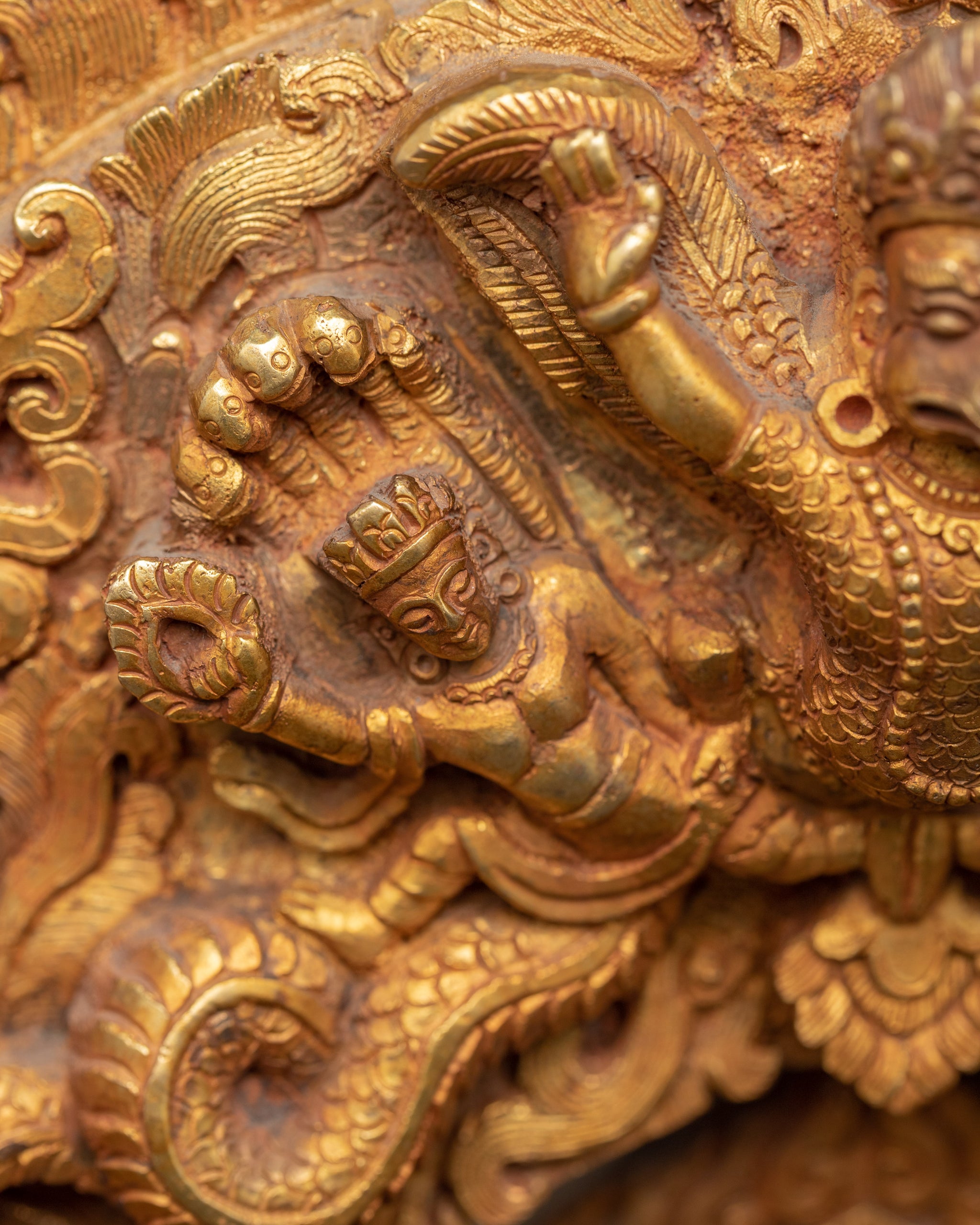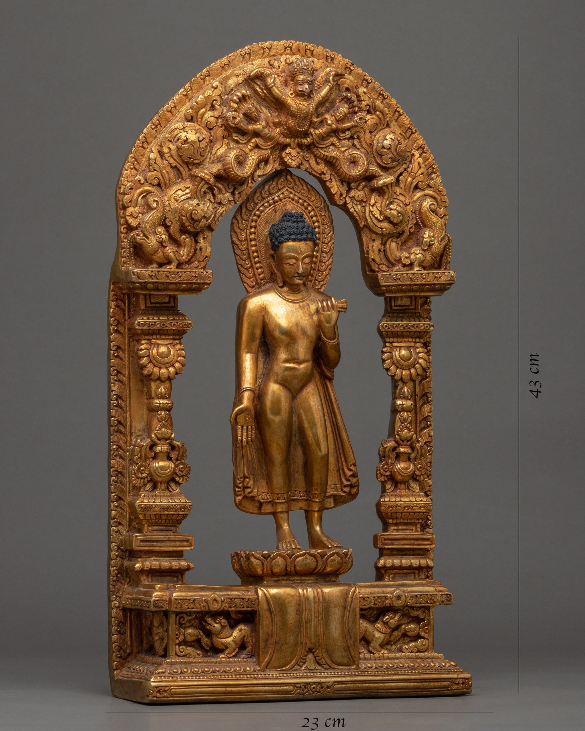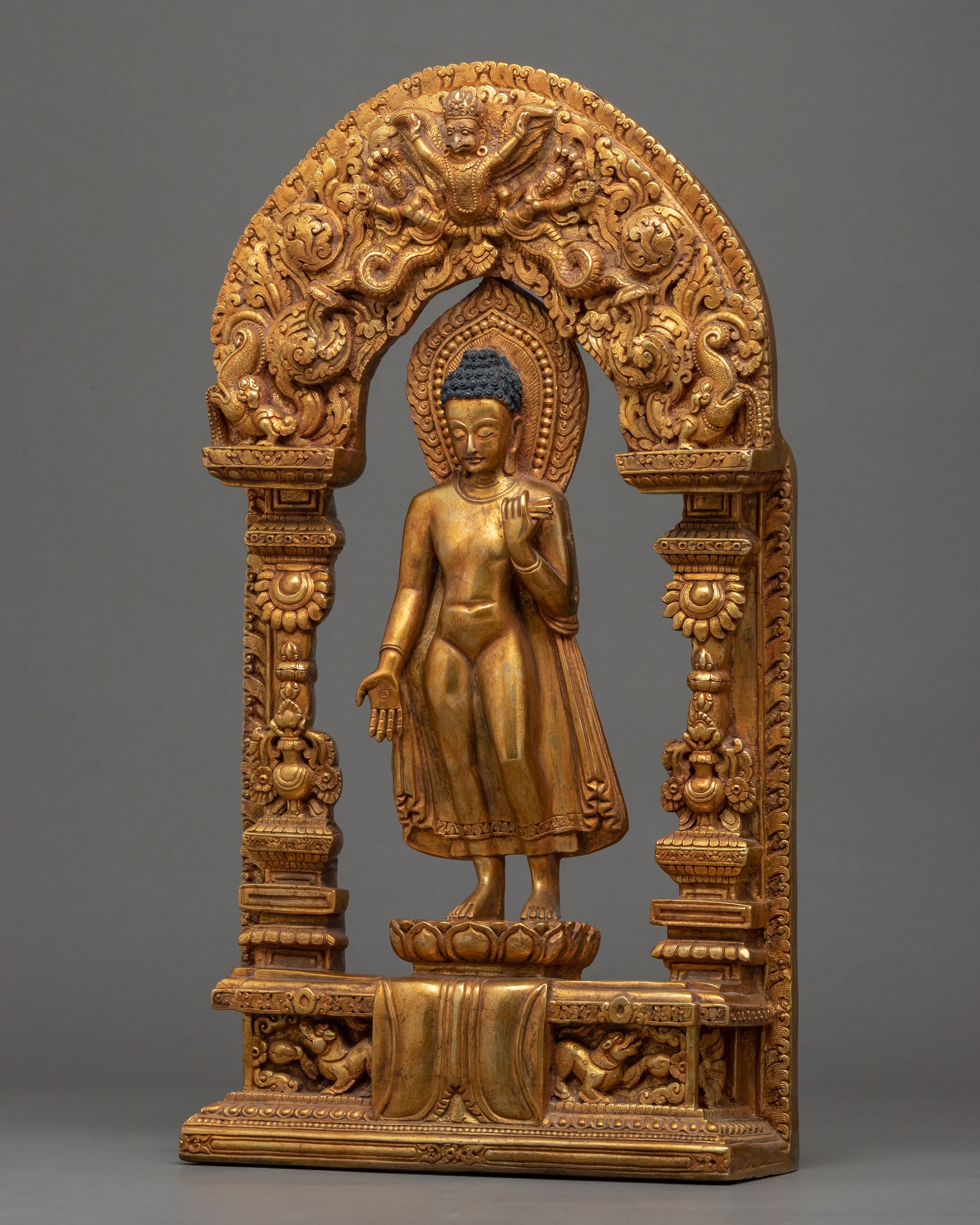 This beautifully hand-carved Buddhist figure of Shakyamuni Buddha was created in our studio, and our artisans have given it an antique finish. We have depicted him standing atop a lotus moon disc with a peaceful expression. We have intricately hand-carved the throne of the statue in the traditional Himalayan art of Nepal. You can use the figure for regular meditation, yoga, and even in a different Buddhist ritual.