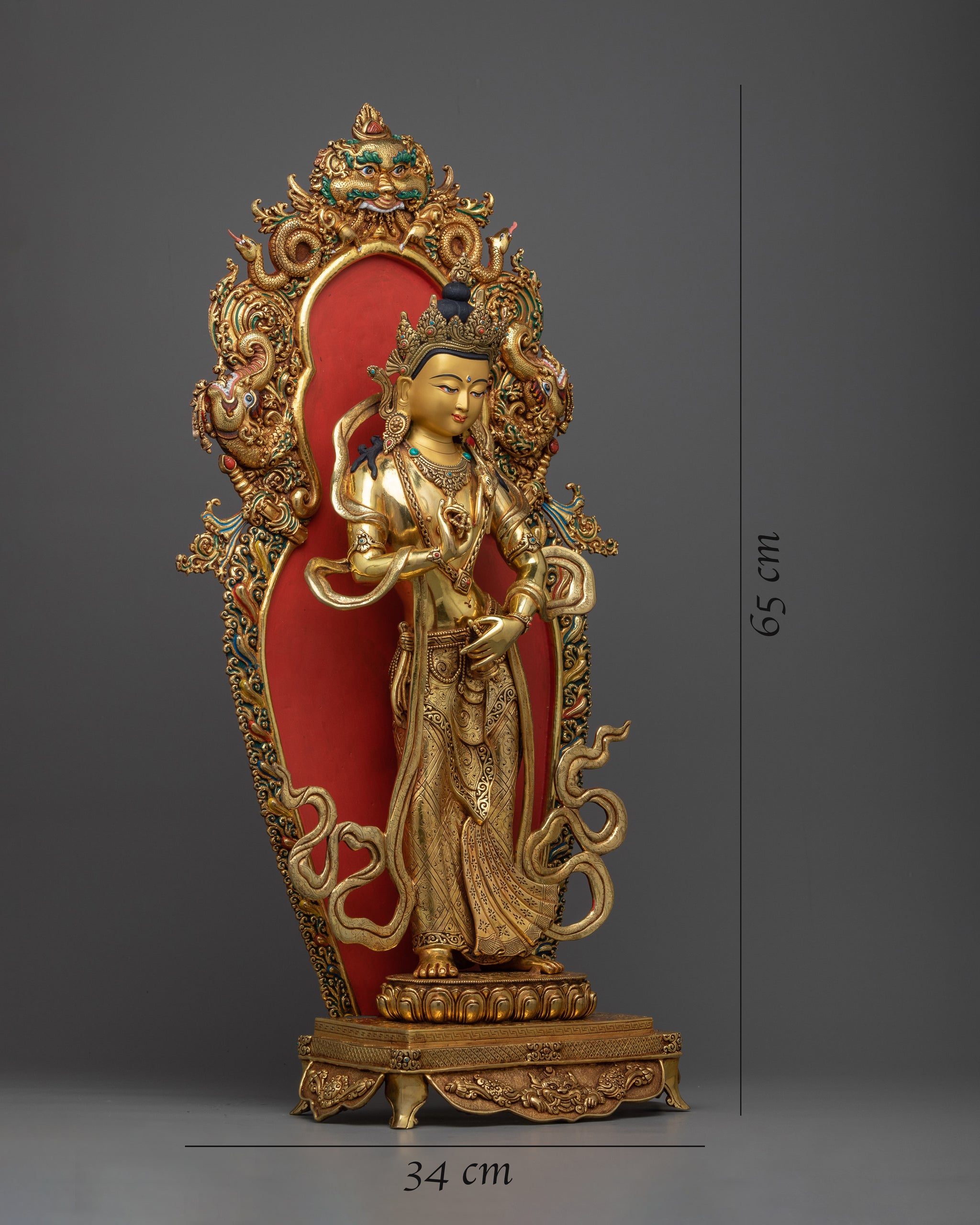 This Vajrasattva statue stands 25.5 inches tall and is supported by a strong 13.3-inch base. It weighs 7.32 kg. The complex characteristics of Vajrasattva, holding the vajra and the bell, symbols of compassion and knowledge, are revealed by the fineness of the gold gilding and the acrylic work. This high-quality spiritual tool is more than just a work of art; it is a beacon of spiritual transformation and cleansing.