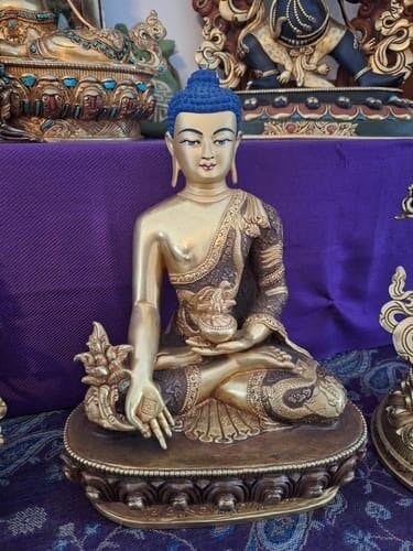 We are Nepali artisans who used methods handed down to us through the years to hand-carve this exquisite Statue for Medicine Buddha Practice. The Statue is a copper body with a 24K gold gilded and Acrylic painting. The artist has crafted the different designs on the monastic robe, which are highlighted with gold plating.