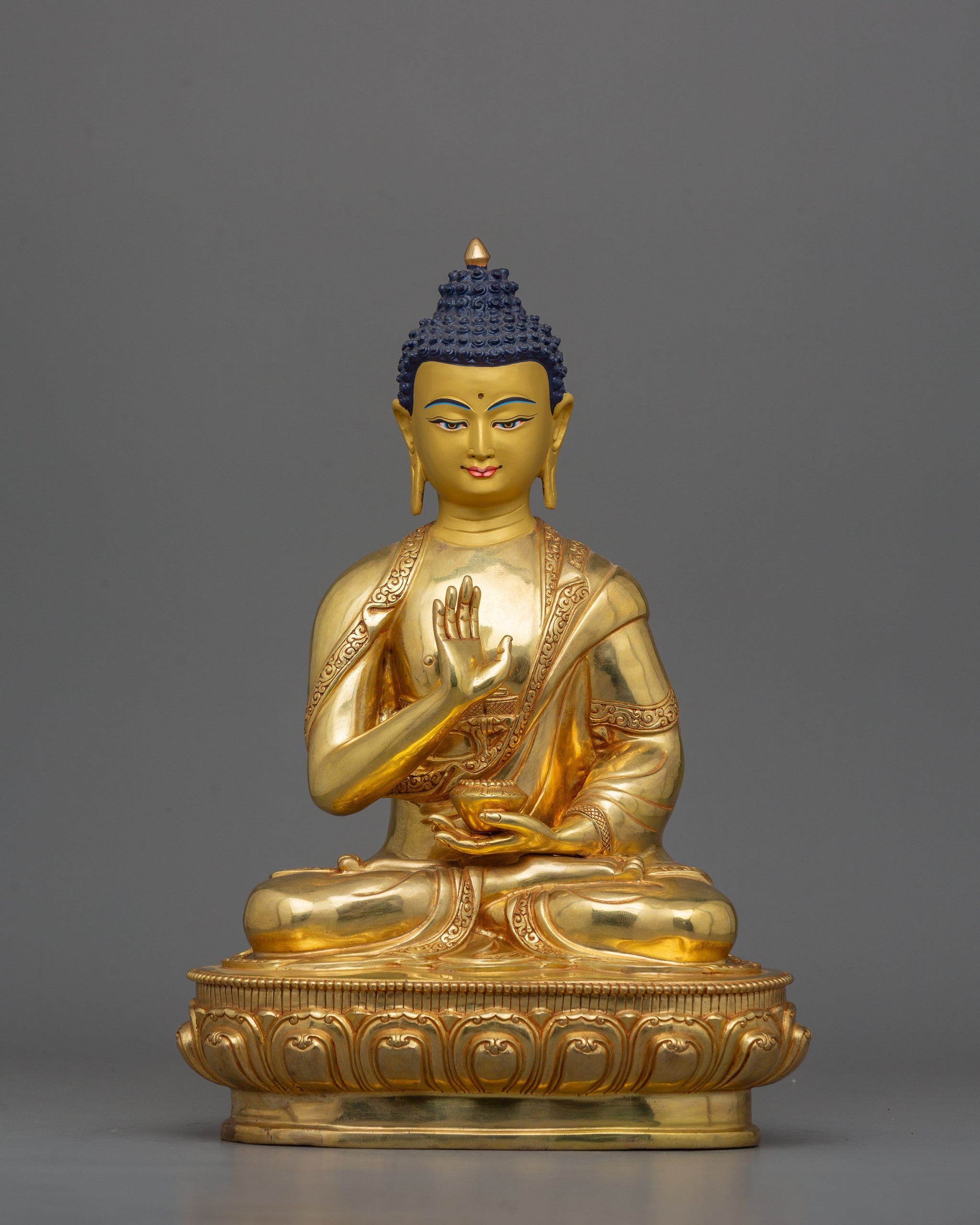 The Buddha is depicted seated atop a moon disc lotus seat. His right hand forms the "Abhaya mudra," or the mudra of fearlessness, symbolizing his protection and dispelling of fear, and his left-hand carries an alms bowl, an indication of the monastic life he led. The intricate details done by our artists for several months on this statue will catch the eye and imbue any space with a sense of calm and serenity.