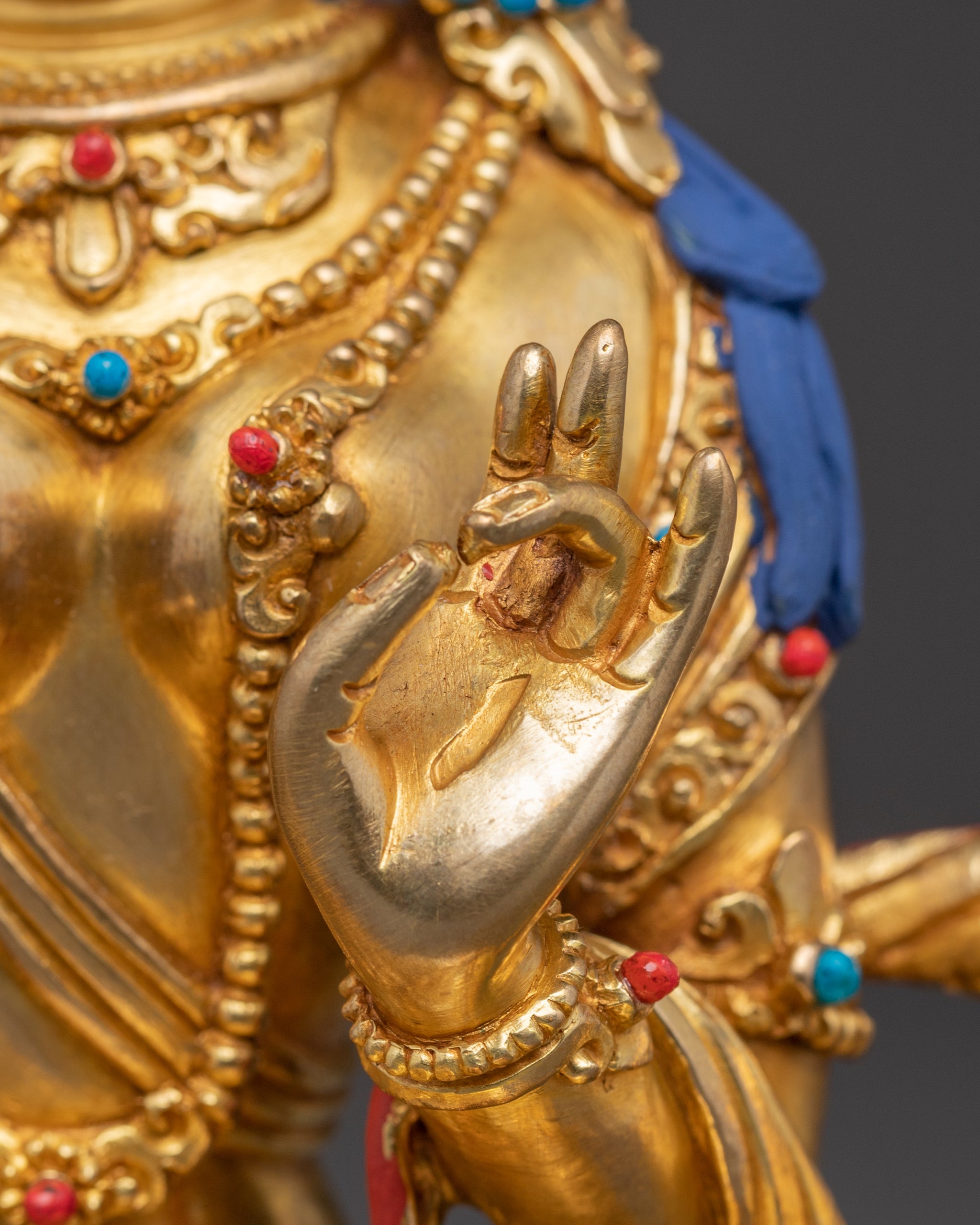 The statue of Bodhisattva Dukar stands 9.4 inches (24 cm) tall, with a 7.1-inch (18 cm) wide base, and weighs 1.65 kilograms. Crafted from a solid copper body, it features 24K gold gilding, acrylic paintings, and carefully inlaid gemstones that enhance its spiritual and visual appeal. The combination of fine materials and skilled craftsmanship creates a radiant and sacred piece ideal for altars, meditation areas, or as a meaningful decorative item that brings both artistic beauty and spiritual significance to any setting.