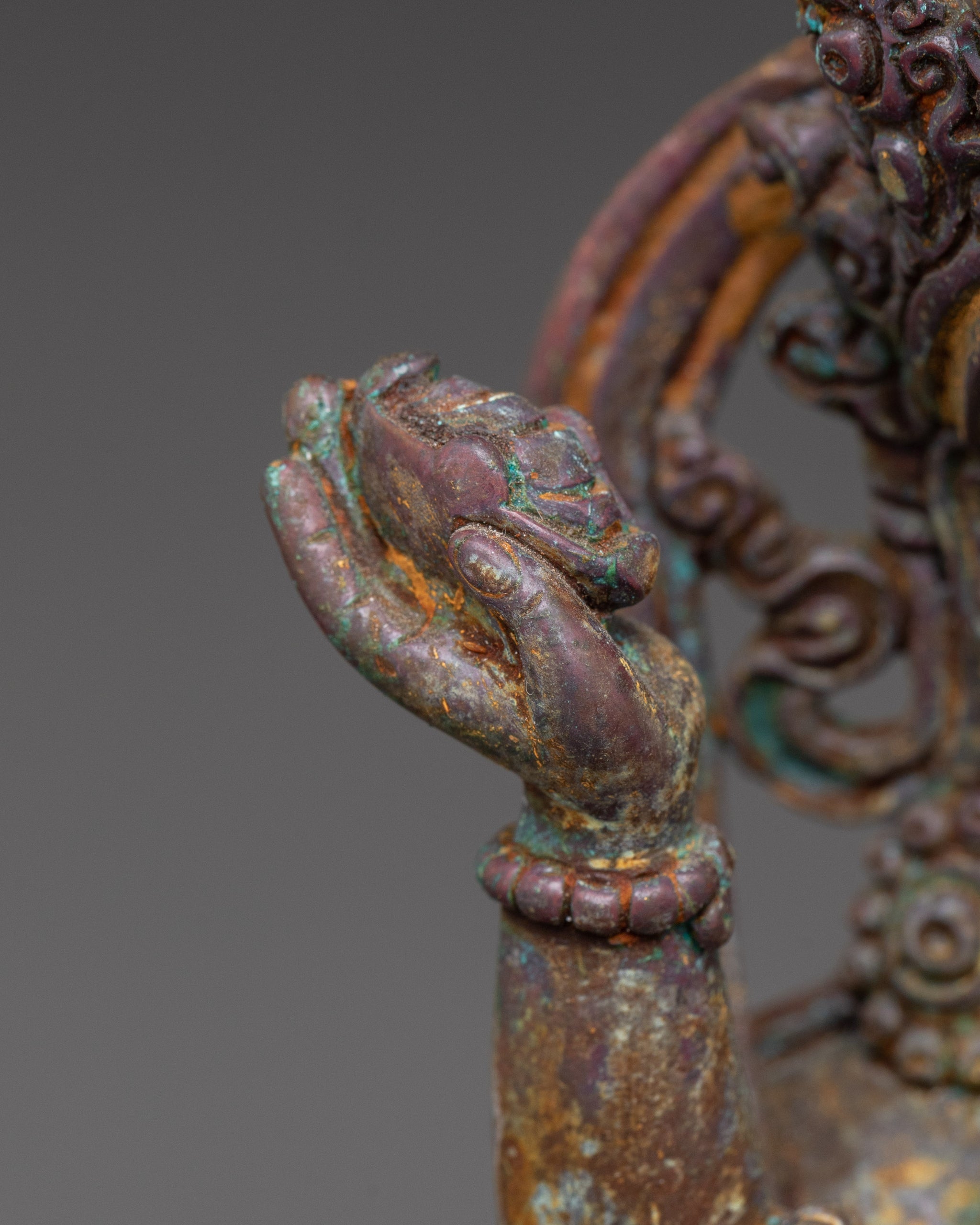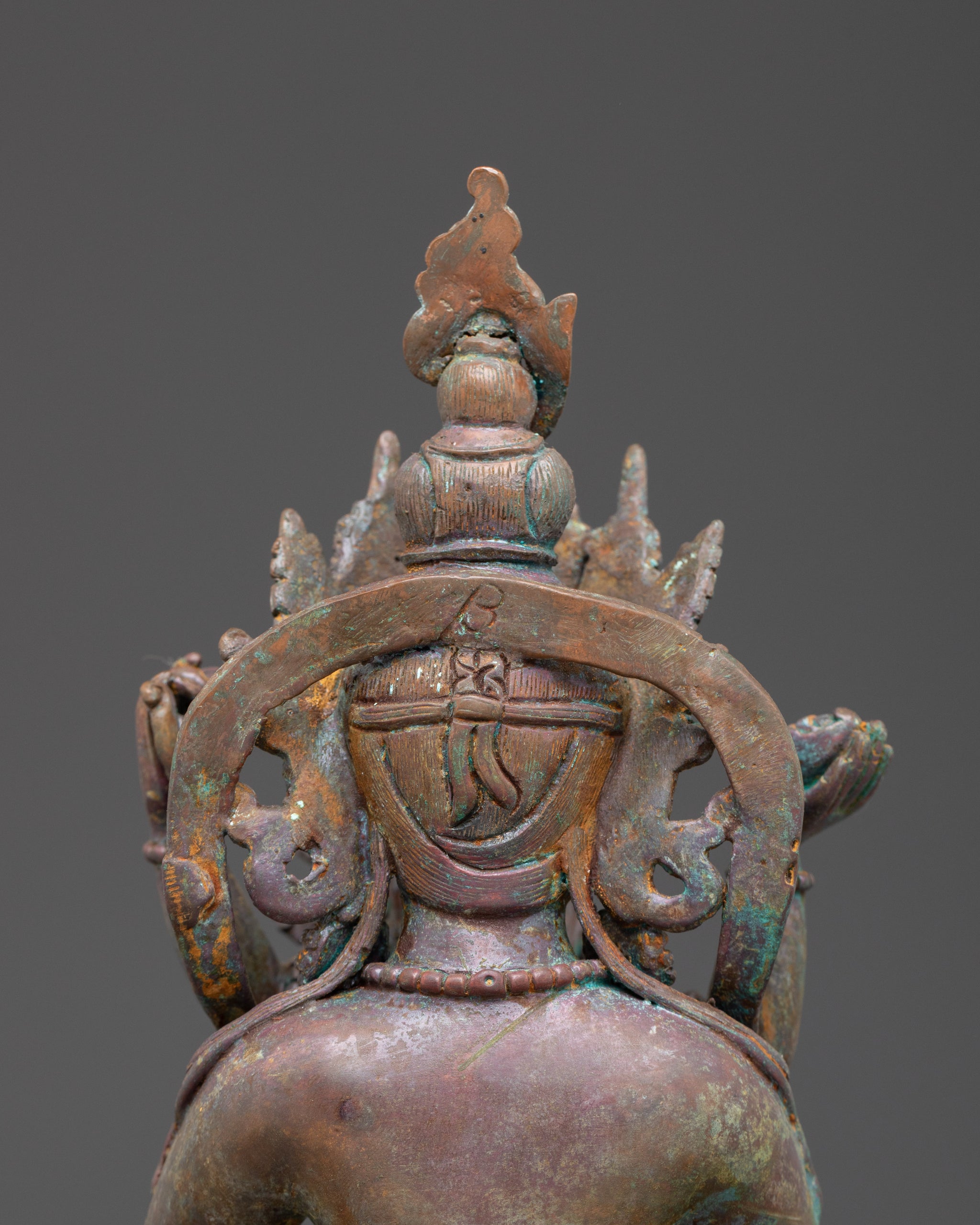 This handmade statue of Buddha Amitayus with Consort is standing at 8.9”/22.5cm (Height) and 5.9”/15cm (Base). This statue is made up of an oxidized copper body. Designed by talented Nepalese artisans, this detailed sculpture is ideal for altars, meditation areas, or as a meaningful decor item for individuals seeking awareness in their daily lives.