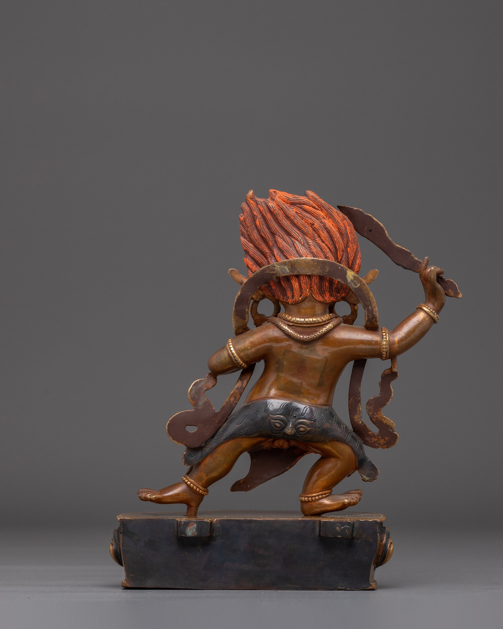 Spiritually, Mahakala embodies the fierce energy of protection, the destruction of obstacles, and the safeguarding of practitioners on the path to enlightenment. His wrathful appearance is not malevolent but serves as a forceful manifestation of compassion, eliminating ignorance, delusion, and negative influences. Displaying this Mahakala statue inspires courage, mindfulness, and devotion, making it both a potent spiritual tool and a striking artistic centerpiece.