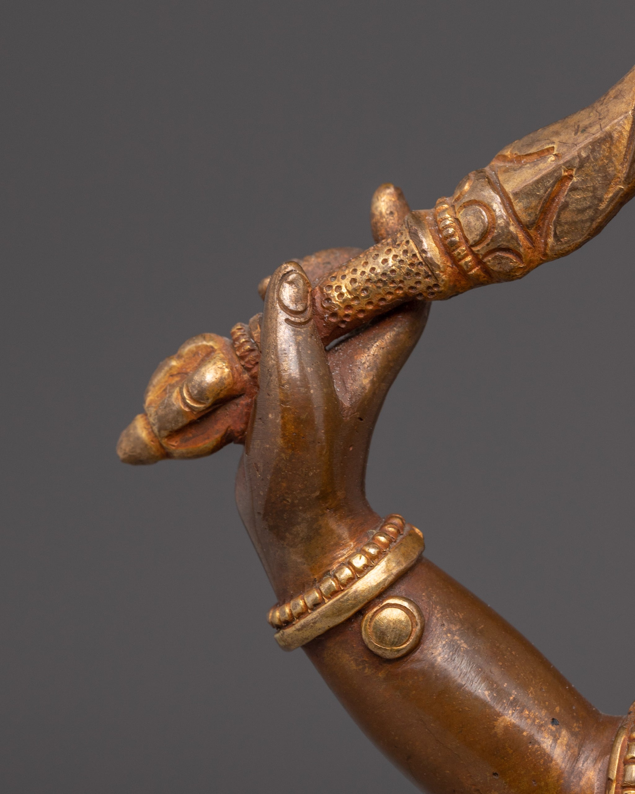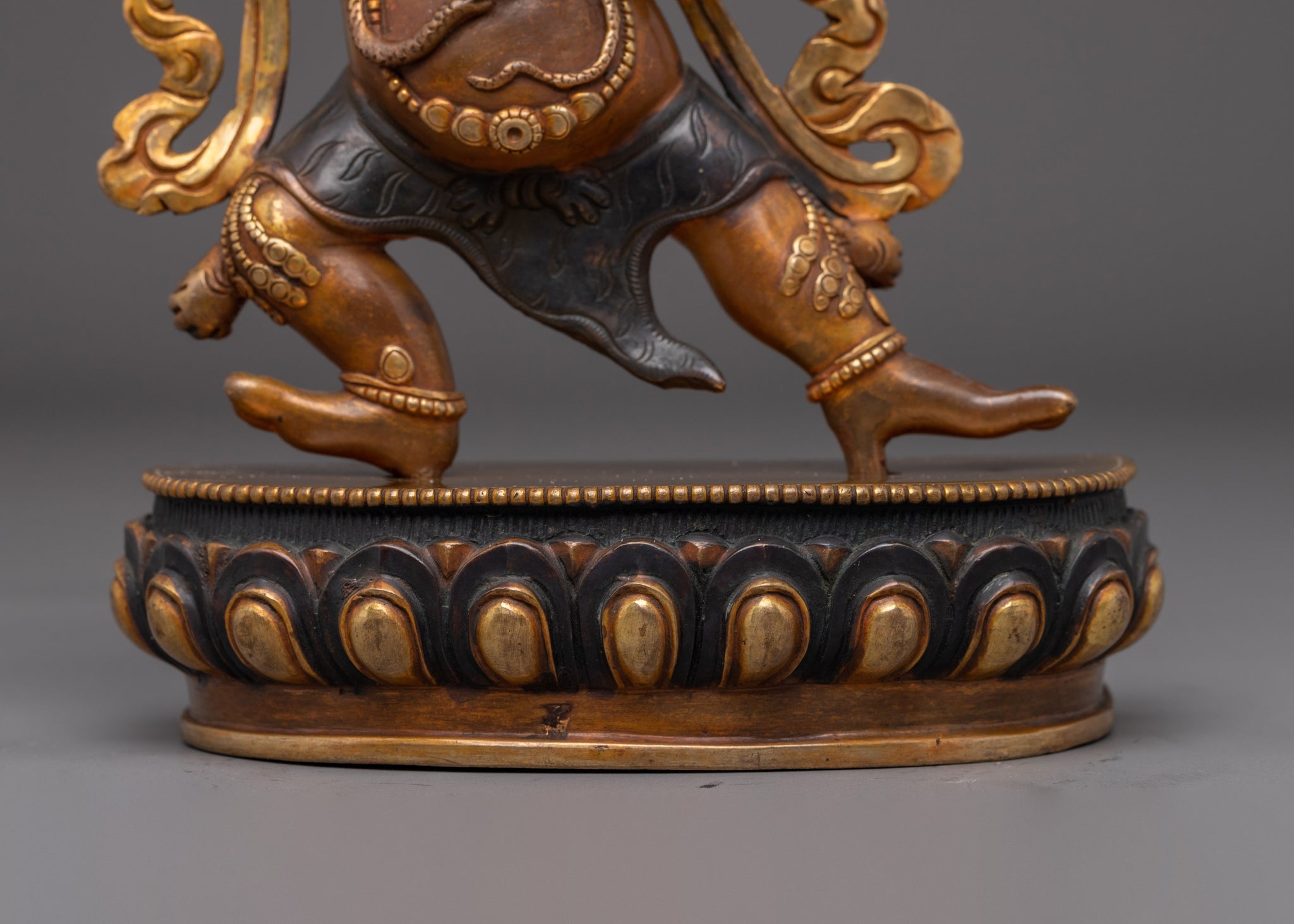The Handcrafted Mahakala Statue stands 10.8 inches (27.5 cm) tall with a base measuring 8.7 inches (22 cm) and weighs 2.35 kg. Made from a copper body with 24K gold gilding, detailed gold and acrylic paintings enhance the fierce and protective presence of this wrathful deity. Expertly crafted by skilled artisans, this statue is ideal for meditation spaces, personal altars, or as a meaningful gift for practitioners seeking protection and spiritual strength.