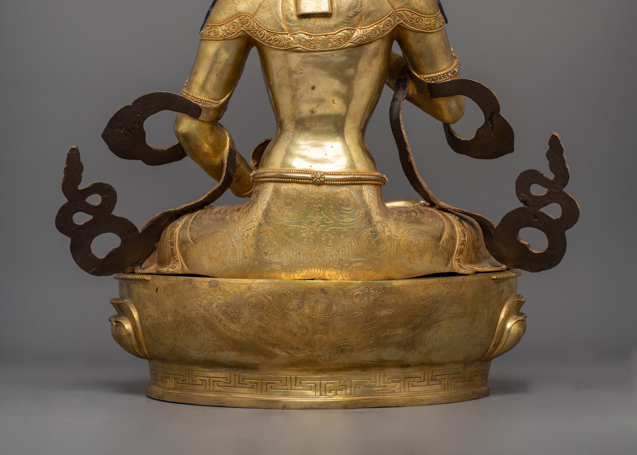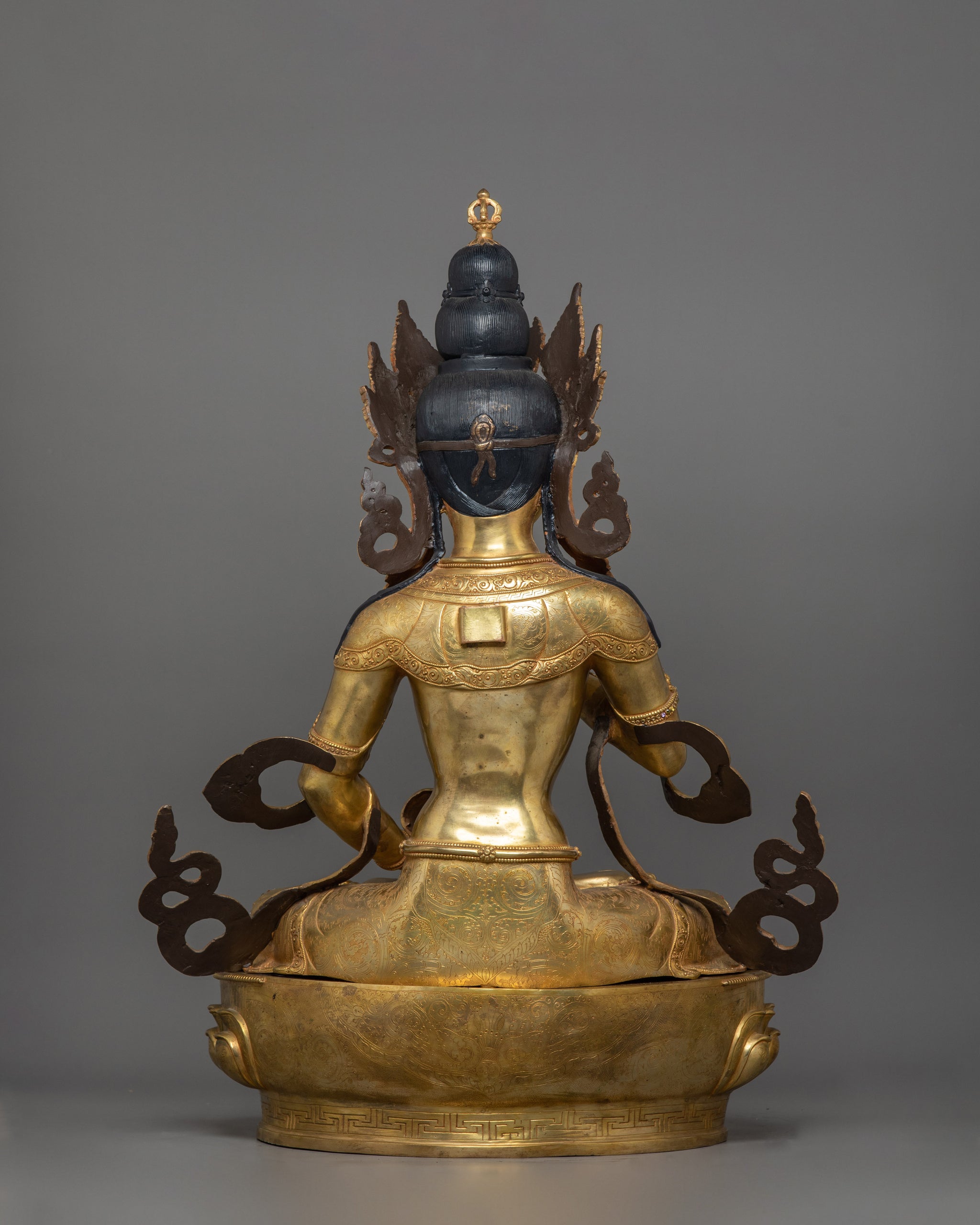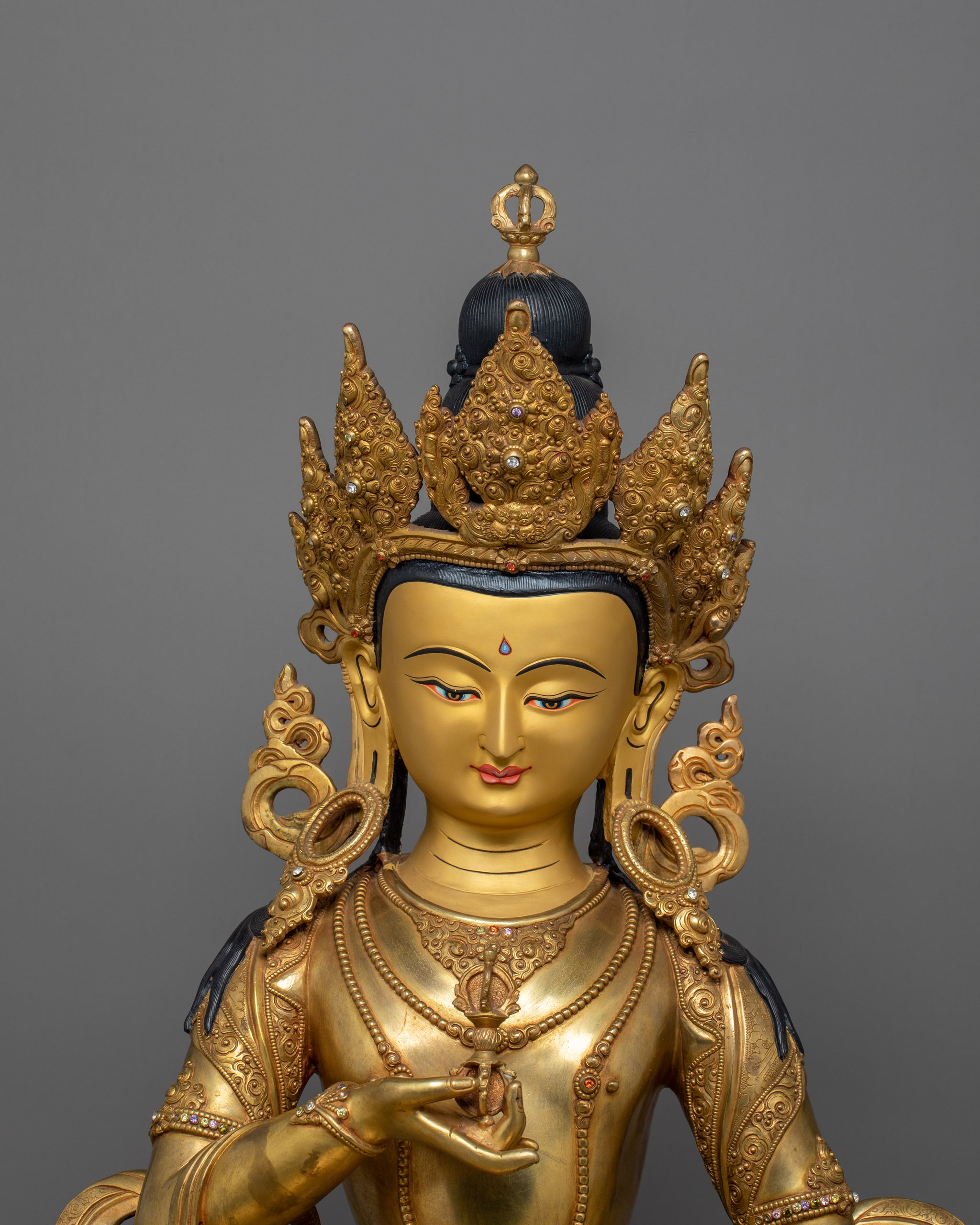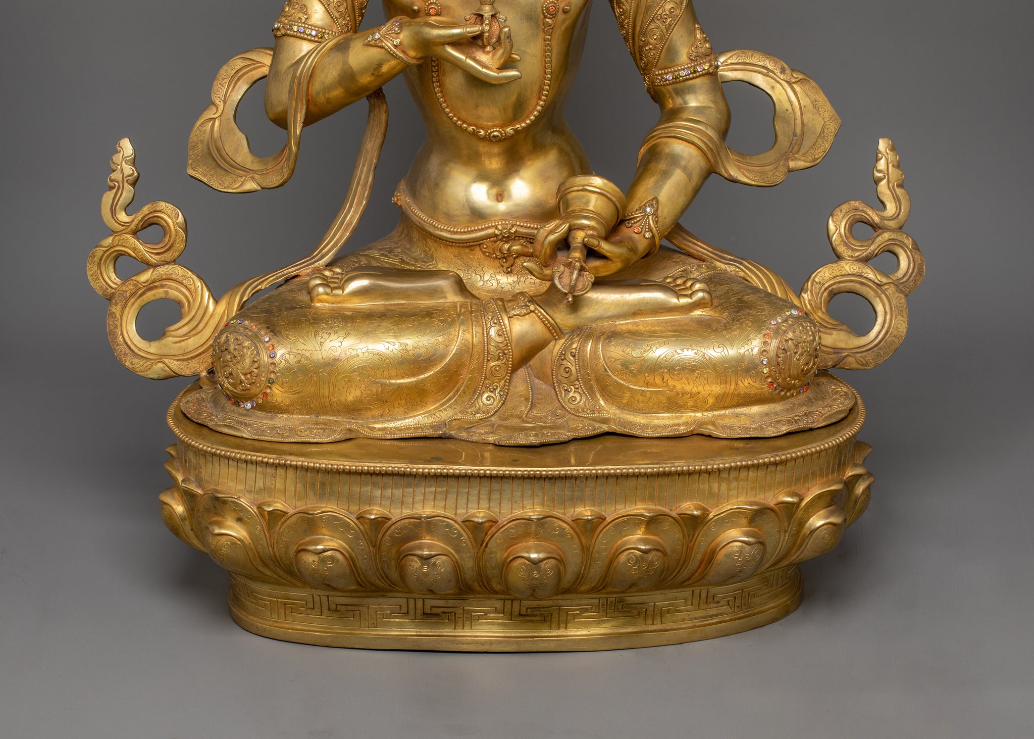 The Statue of Dorje Sempa (Vajrasattva) is a sacred Buddhist sculpture standing 28.7 inches (73 cm) tall with a 20.3-inch (51.5 cm) base, embodying the essence of purification and wisdom in Vajrayana Buddhism. This Statue is made from 24K gold gilded, copper body and gemstones. Designed by talented Nepalese artisans, this detailed sculpture is ideal for altars, meditation areas, or as a meaningful decor item for individuals seeking awareness in their daily life.