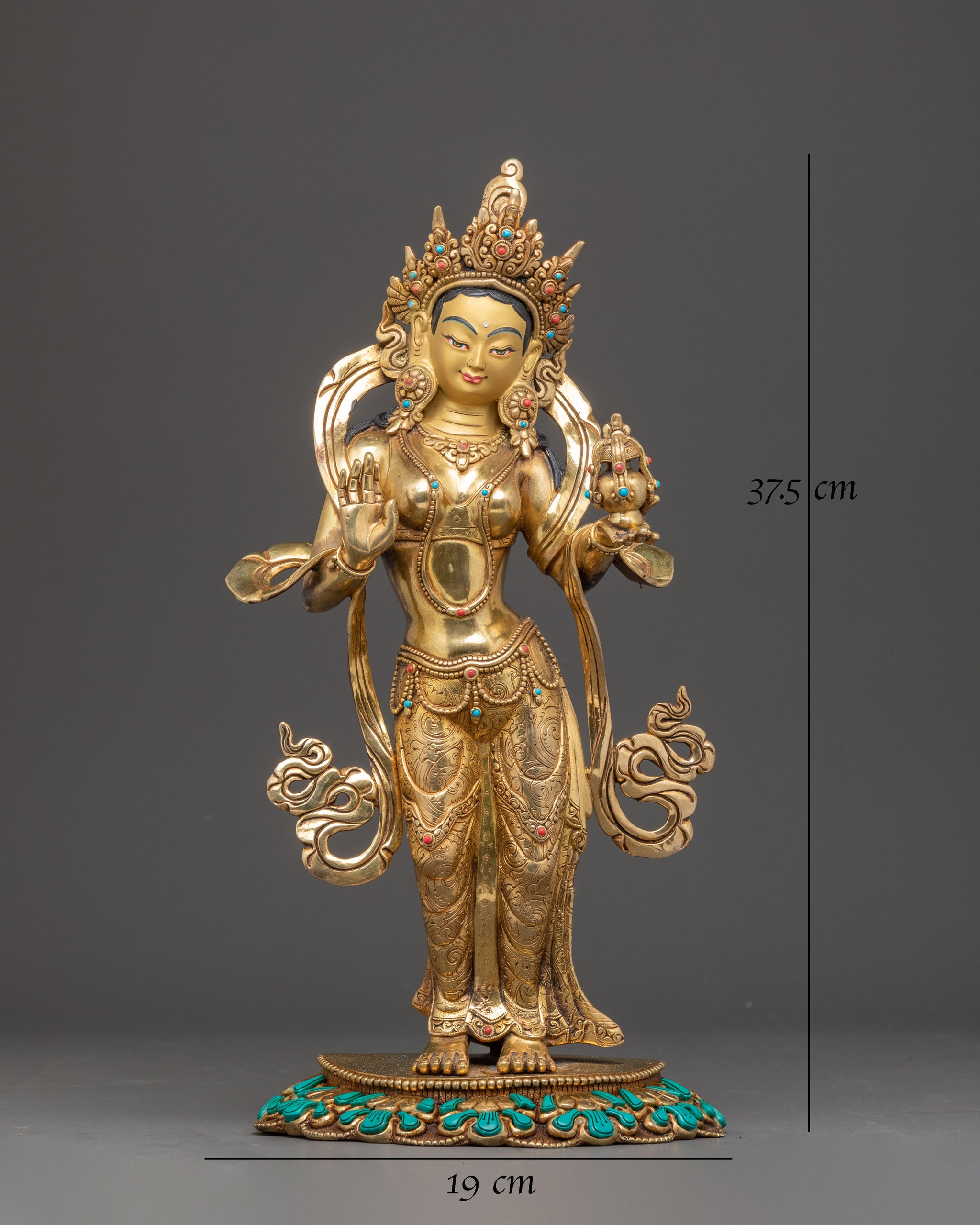 The statue is very beautiful. The craftsman who crafted it clearly shows the care and heart he put into it. It is a true dharma jewel on the altar. Shipping was quick, considering the recent events in Nepal. It was carefully packed and filled in a wooden box. If you're buying for shipping to the European Union, please note that customs duties on items from outside the EU are as high as 23 percent of the value.