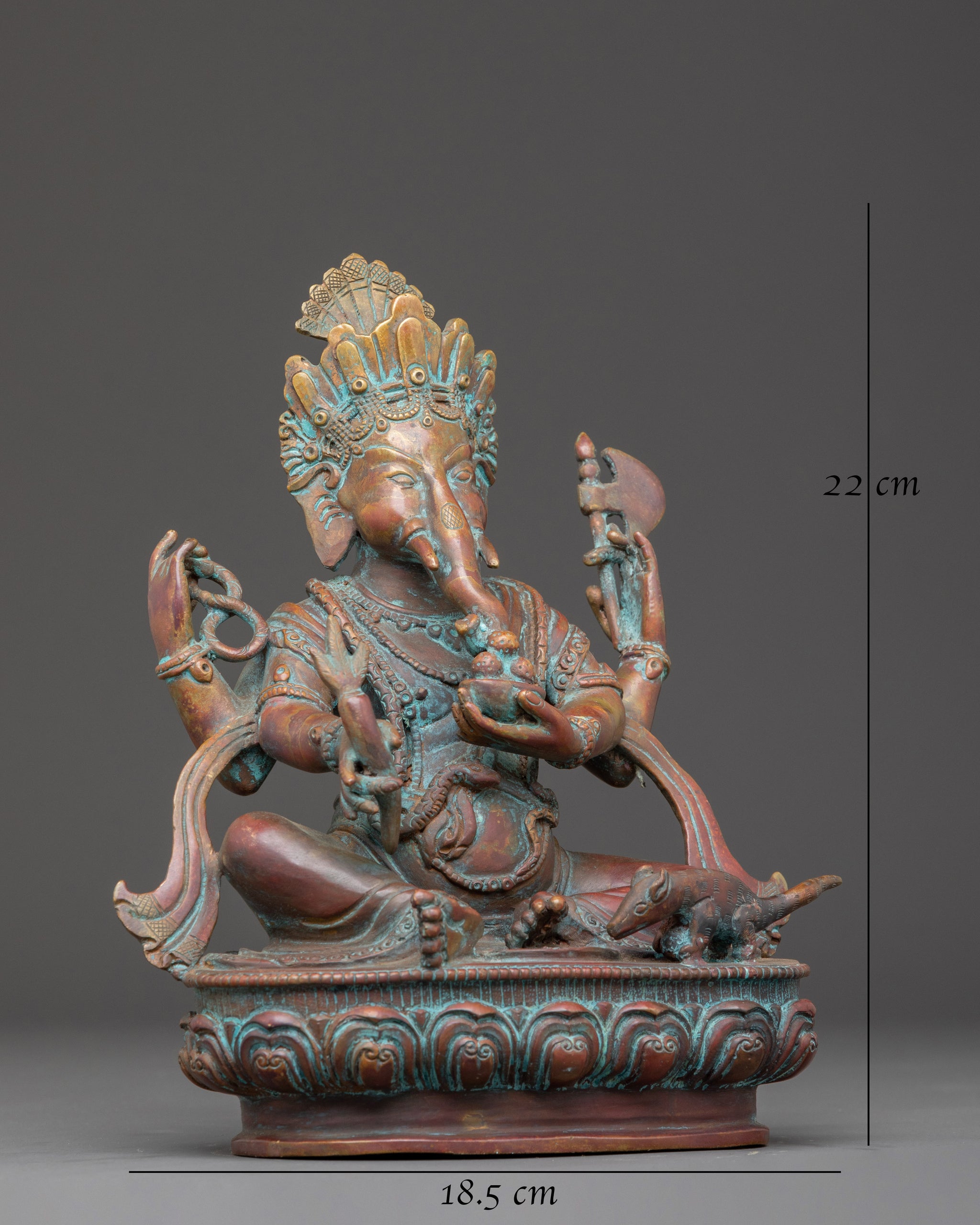 The Handmade Statue of Lord Ganesha stands at 8.7” (22 cm) in height with a base width of 7.3” (18.5 cm) and weighs 1.91 kg. Expertly crafted from an oxidized copper body. This statue reflects the divine presence of Lord Ganesha, symbolizing wisdom, intellect, and success. Ideal for home altars, meditation spaces, or as a meaningful spiritual gift, it serves as a powerful reminder of blessings and prosperity.