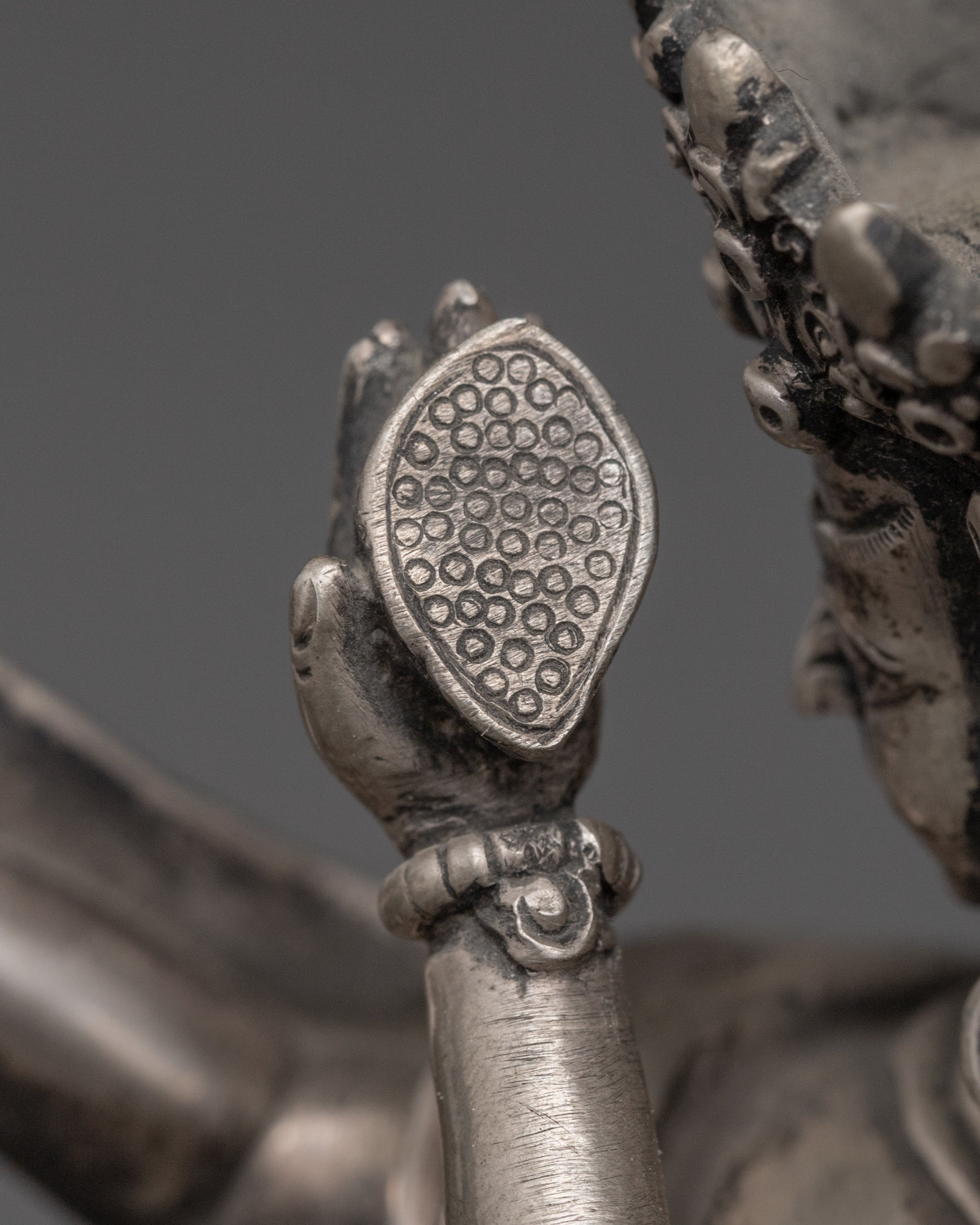 Vajrayogini is stunning. The details are amazing. It's easy to make out her facial expressions, skulls, feet, and the ring of fire around her. You can tell she's handmade. There is a consecration hole in her back.