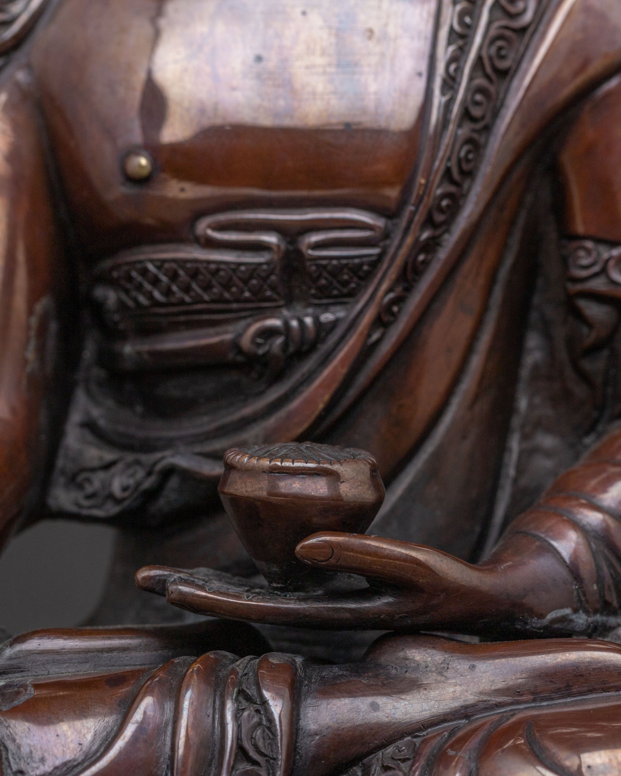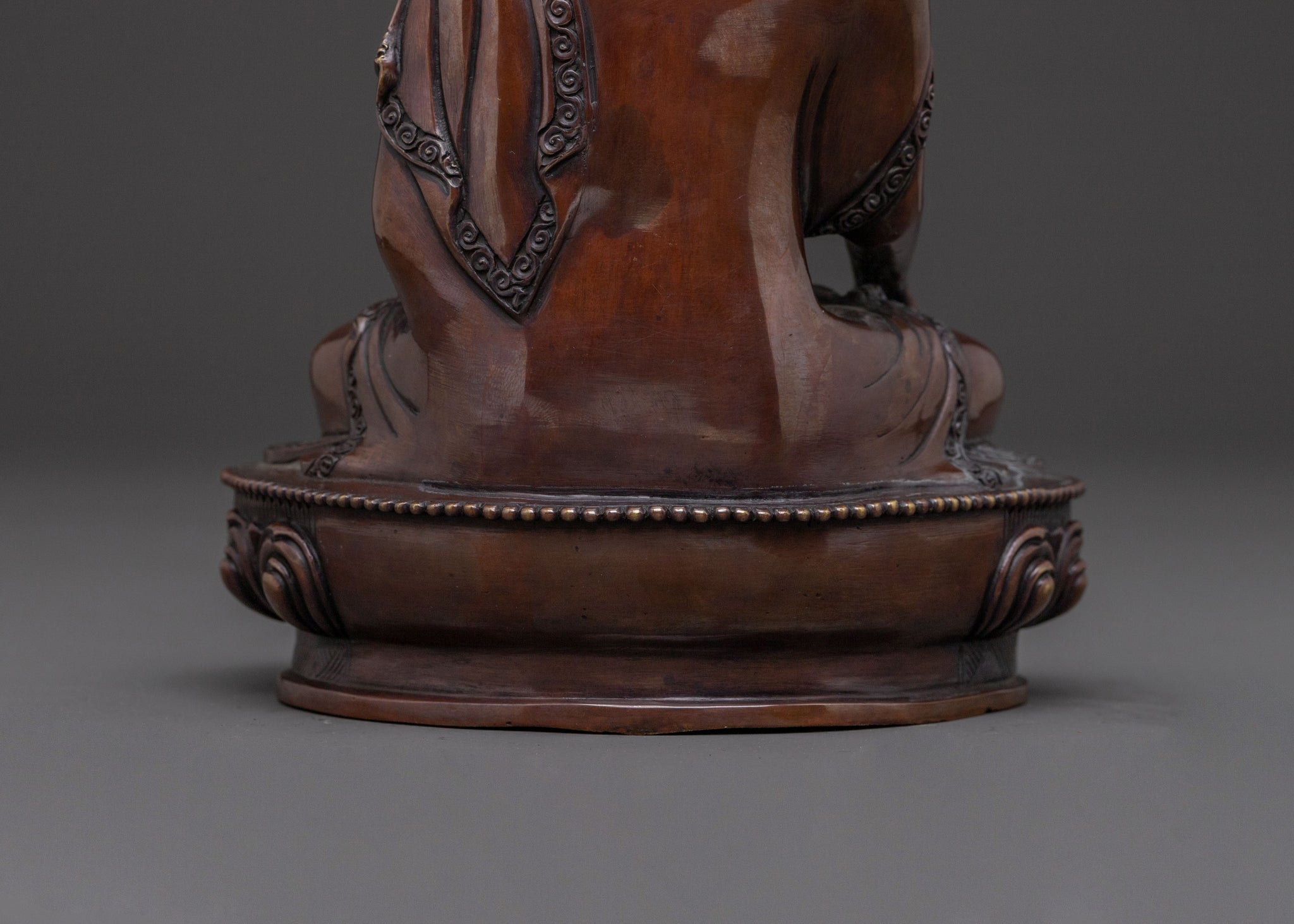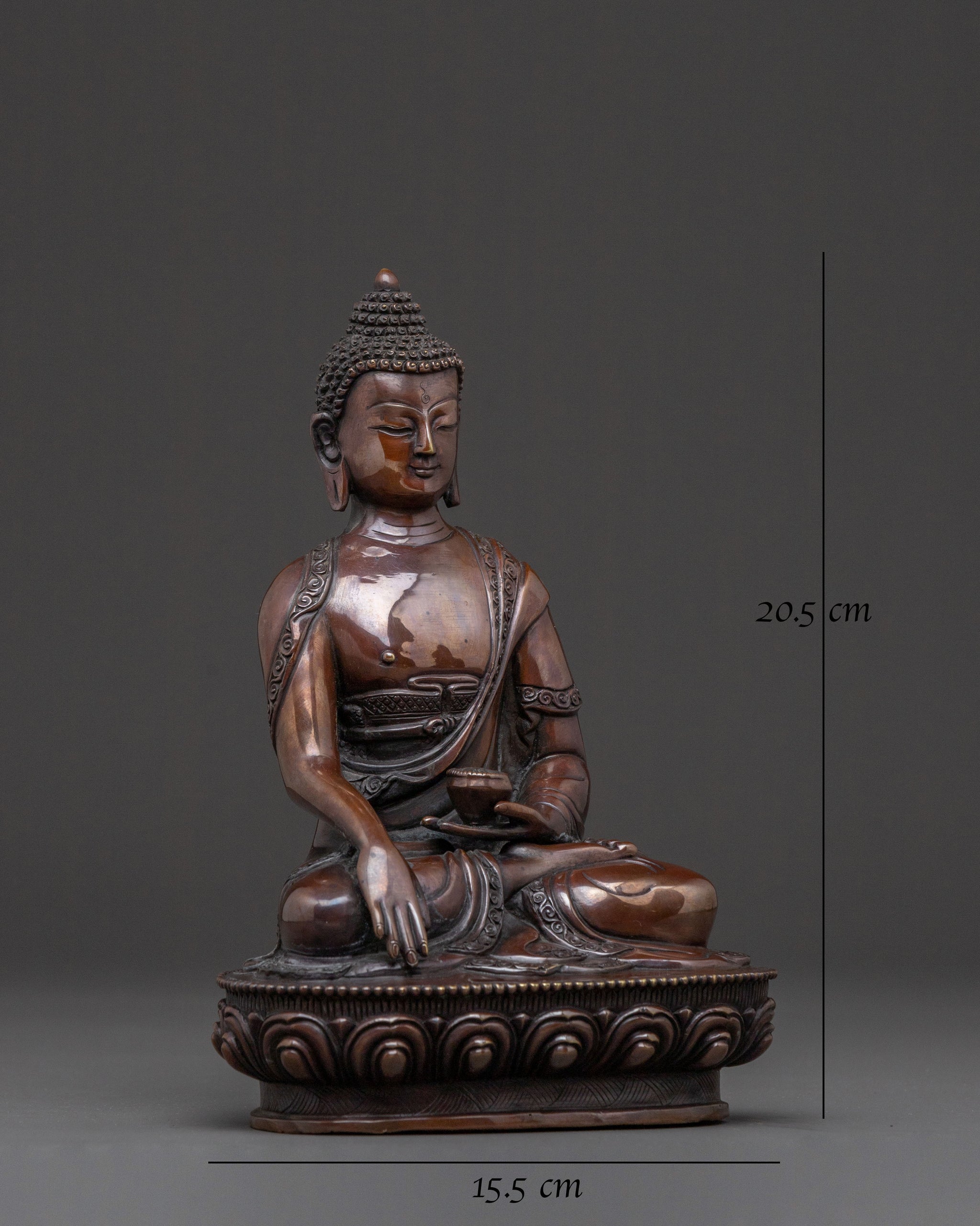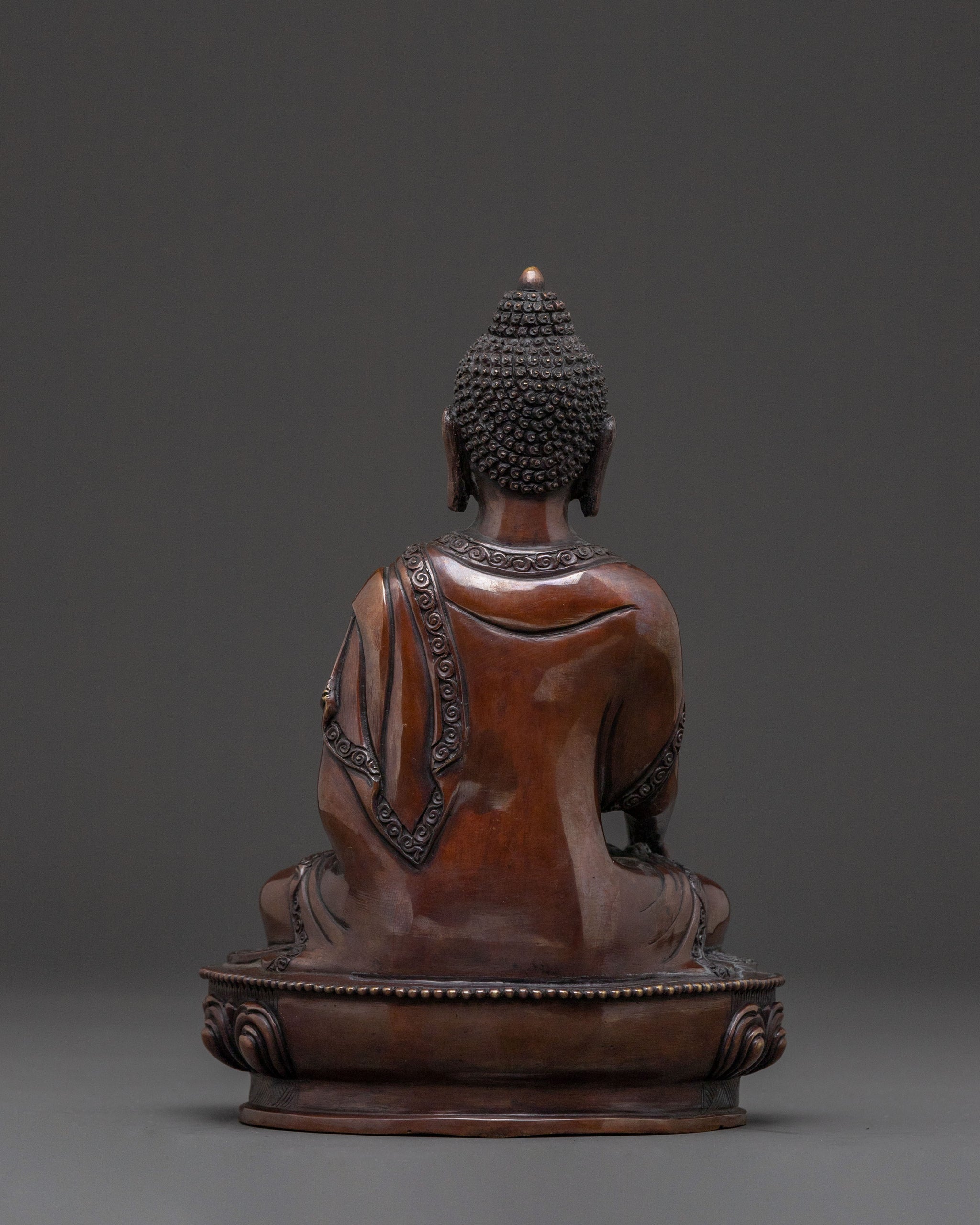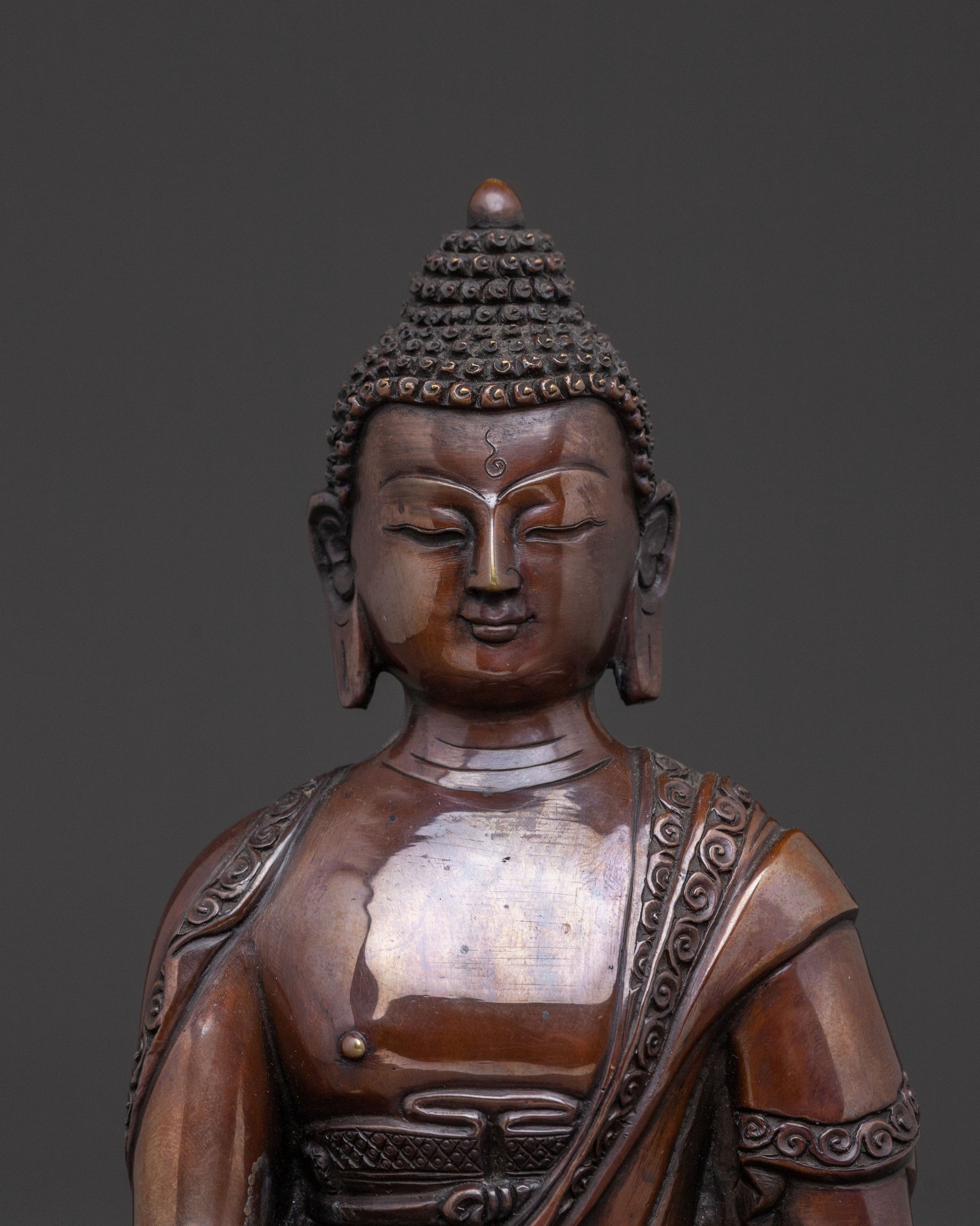 A profound statue of the historical Shakyamuni Buddha emanates tranquil wisdom, inviting serene contemplation into any space. Emerging from the heart of Nepal, this handcrafted piece stands 20.5cm (8.1") tall with a 15.5cm (6.1") base, sculpted from an oxidized copper body that lends it an ancient, earthy presence. Its gentle aura encourages a deep sense of inner calm, making it a perfect centerpiece for any sacred space.