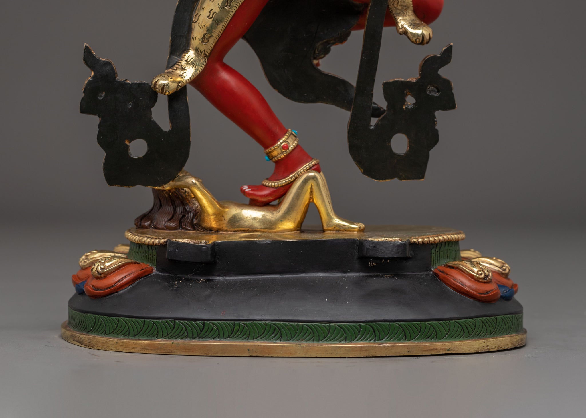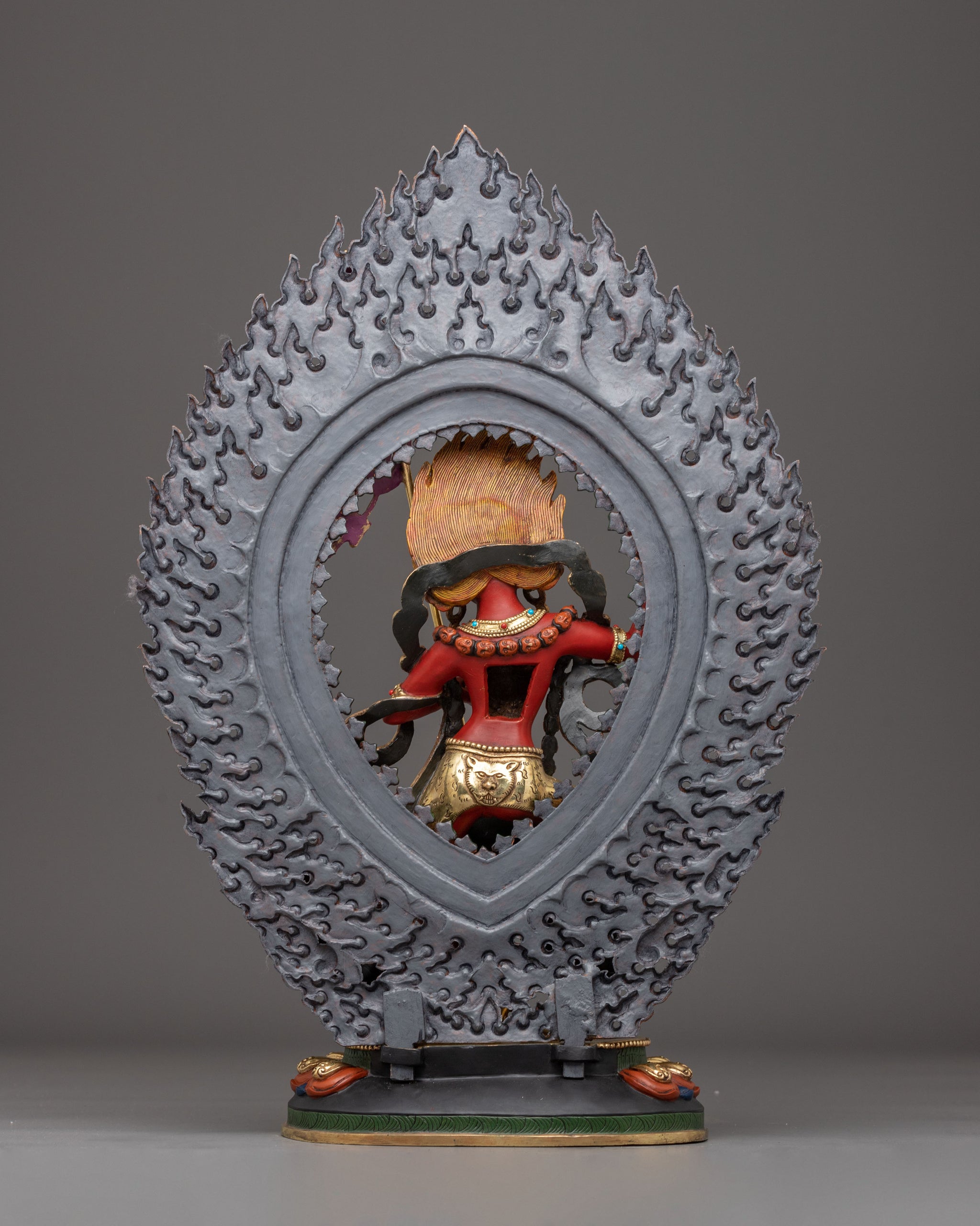 Vajrayogini is stunning. The details are amazing. It's easy to make out her facial expressions, skulls, feet, and the ring of fire around her. You can tell she's handmade. There is a consecration hole in her back.