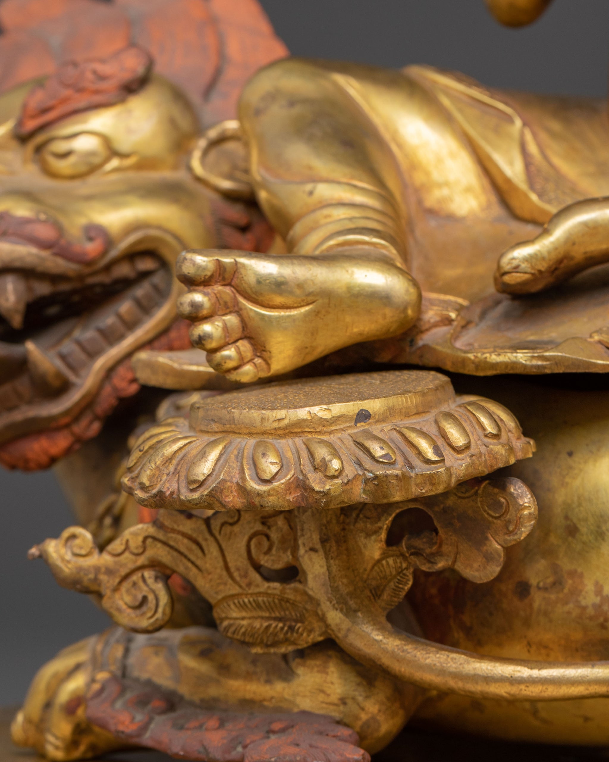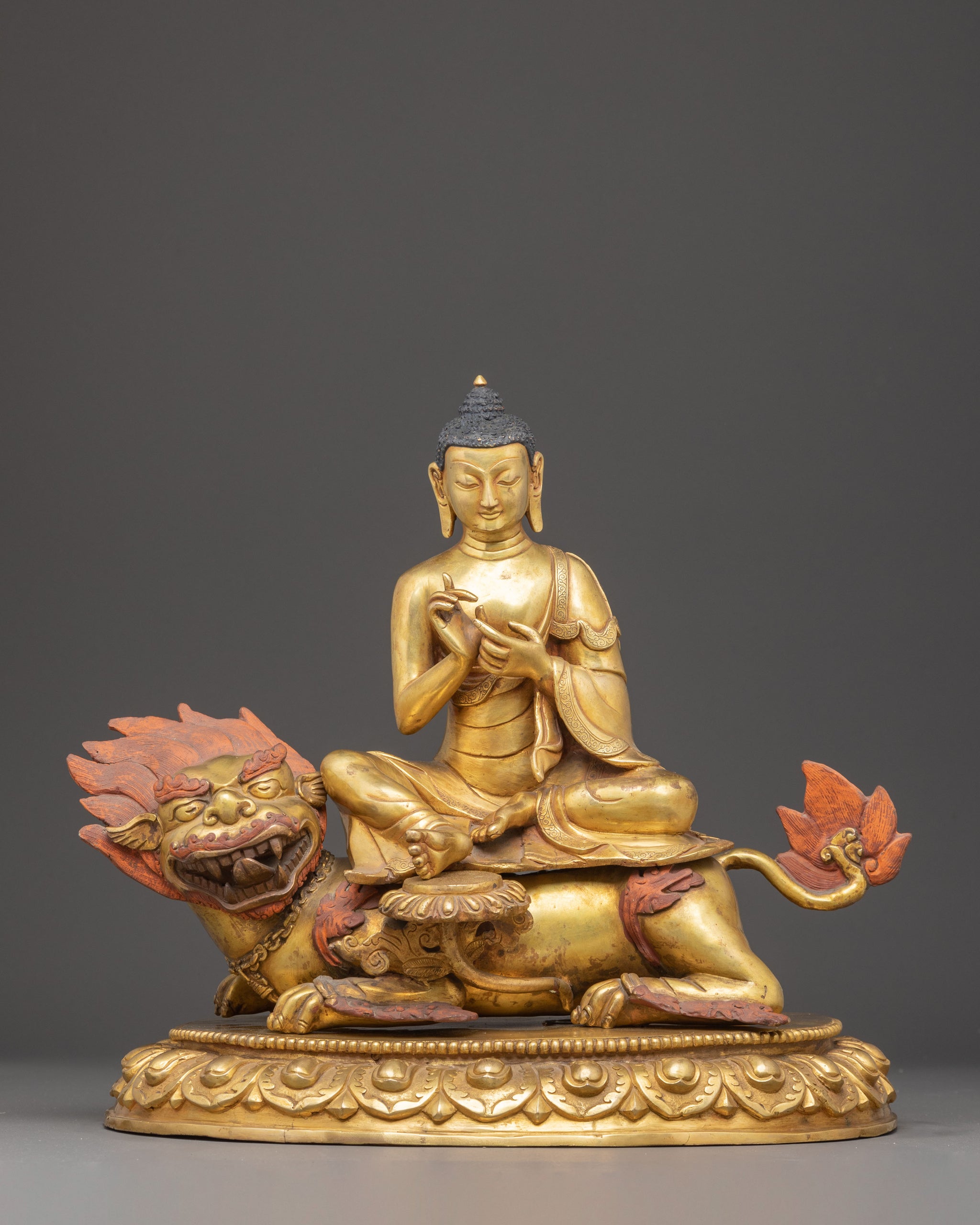 This magnificent Statue of Vairocana on a Snow Lion is a masterful representation of cosmic wisdom and spiritual power in Tibetan Buddhism. Measuring 13.4” (34 cm) in height with a 15” (38 cm) base and weighing 9.27 kg, it is crafted from copper, adorned with 24K gold gilding, and enhanced with detailed acrylic paintings. Expertly handcrafted by skilled Nepali artisans, this sacred piece brings a commanding and inspiring presence to altars, meditation spaces, or personal spiritual collections.
