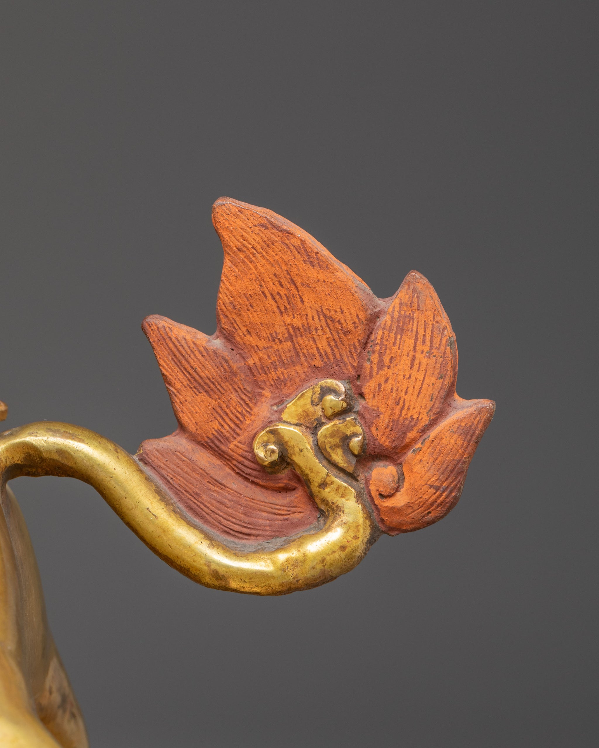 In its iconography, Vairocana is depicted riding on a snow lion, symbolizing fearlessness and the triumph of wisdom over ignorance. He wears an ushnisha, representing his enlightened mind, and his middle hands are in the Dharmachakra mudra, symbolizing the turning of the Wheel of Dharma. Seated on a lotus base, his right leg steps on a lotus flower, reflecting spiritual purity and the manifestation of enlightened energy. This depiction embodies Vairocana’s role as the cosmic Buddha, representing the essence of all Buddhas and the principle of universal wisdom.