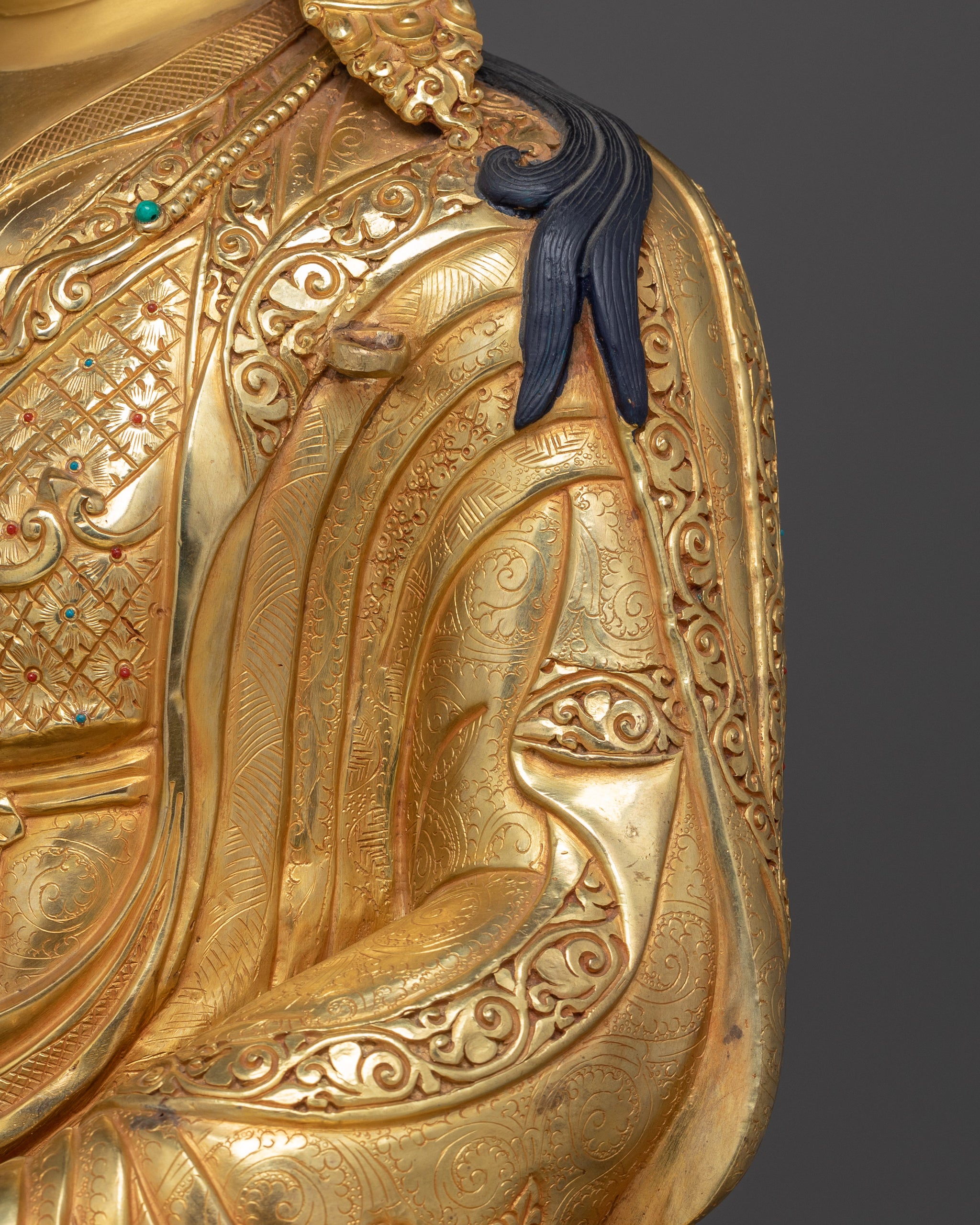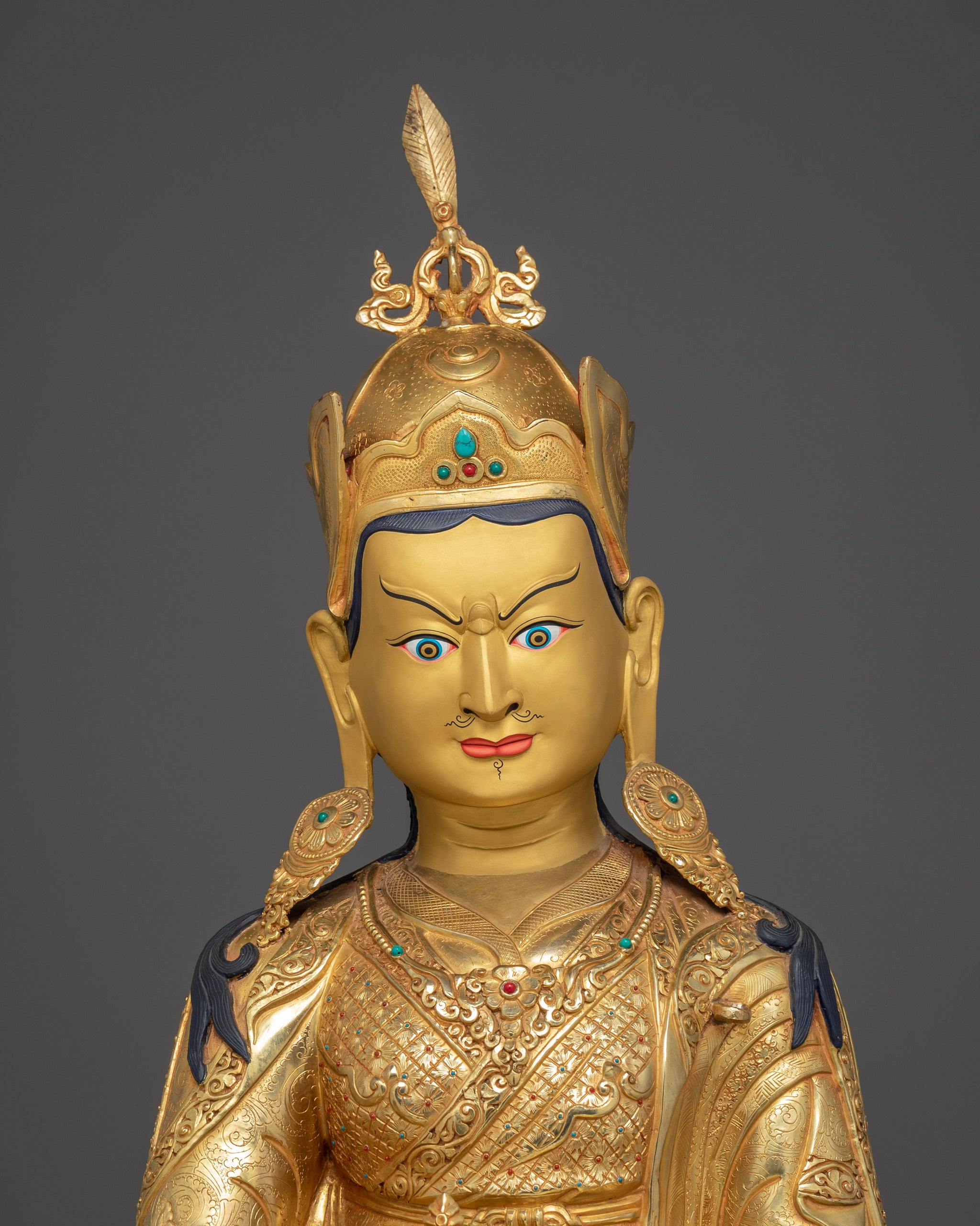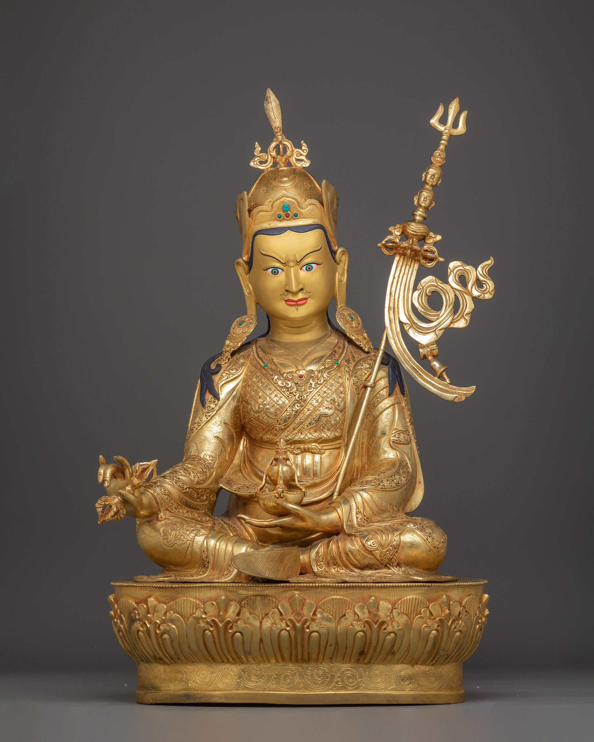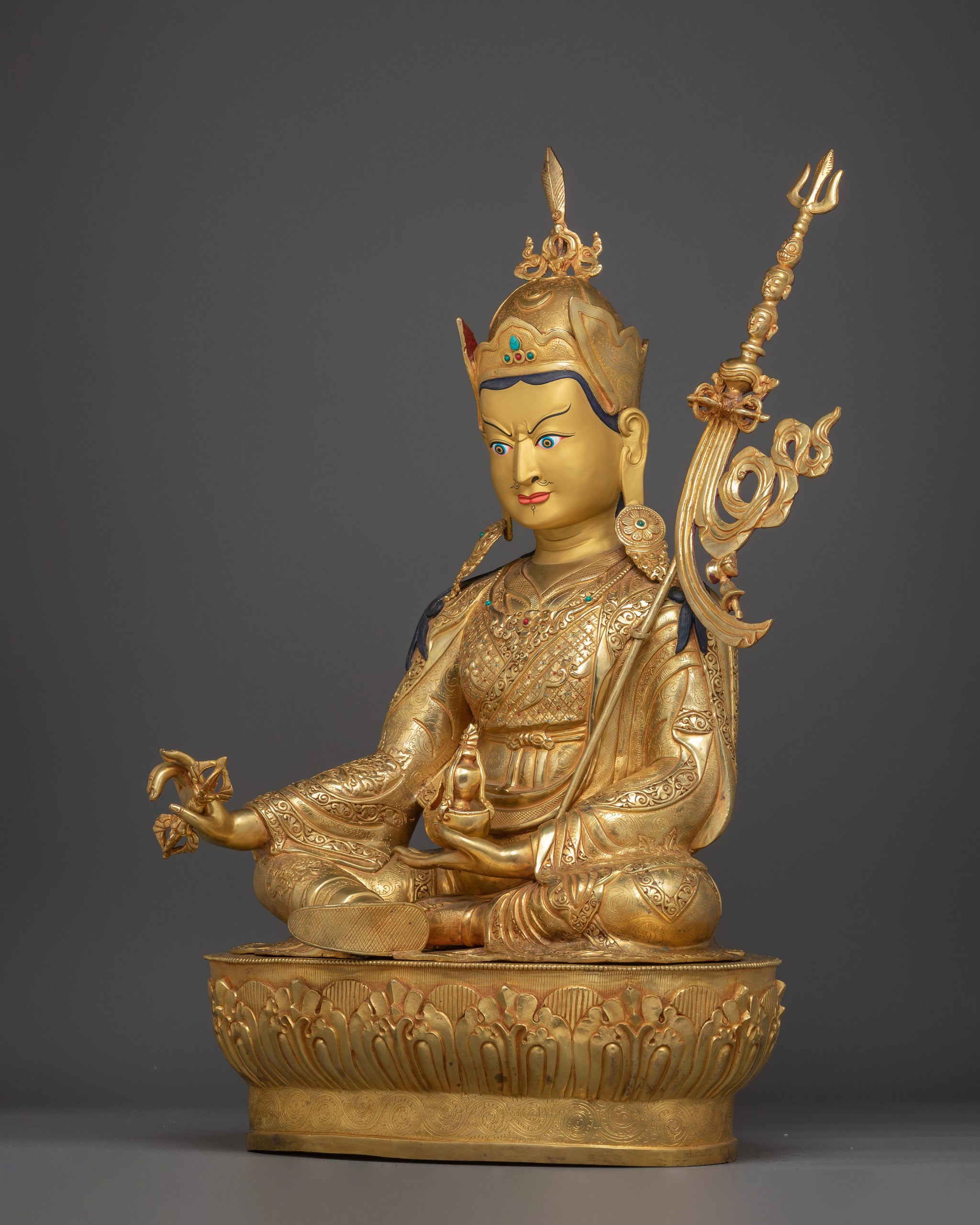 Vajra Master Guru Rinpoche, also known as Padmasambhava, is a highly revered master in Tibetan Buddhism. He is credited with bringing Vajrayana Buddhism to Tibet and establishing its monastic and tantric traditions. Known as the “Lotus-Born One,” Guru Rinpoche embodies wisdom, compassion, and spiritual power, often depicted as a master of esoteric practices who subdues negative forces and guides beings toward enlightenment. He is considered a protector and transformer, capable of removing obstacles, granting blessings, and helping practitioners achieve spiritual realization.