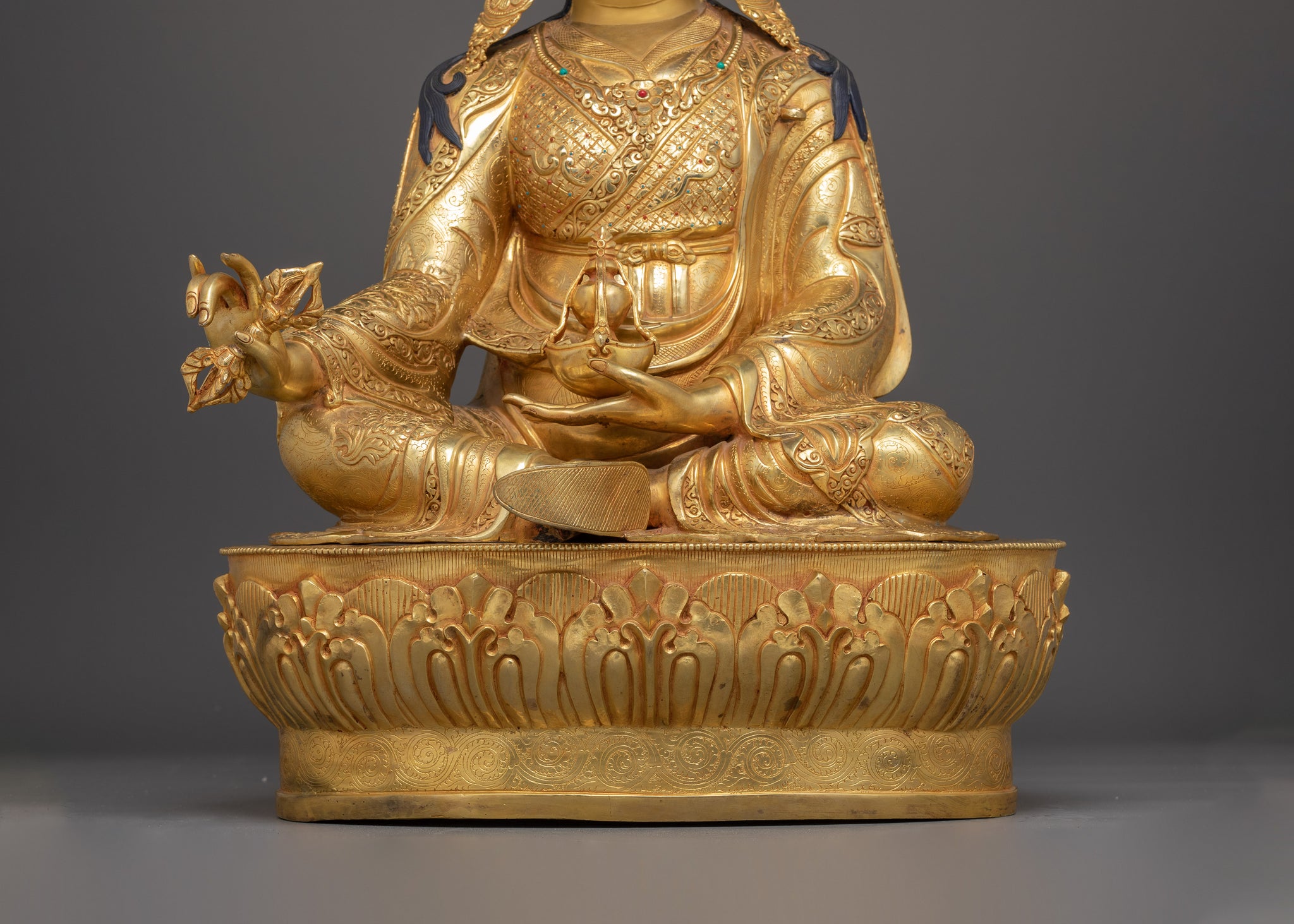 In terms of iconography, Guru Rinpoche is depicted in a regal posture, exuding spiritual authority. His right hand holds a vajra, symbolizing indestructible wisdom, while his left hand carries a skull cup containing the vase of immortality, representing transformation and longevity. He wears a lotus hat adorned with feathers, highlighting his enlightened and sacred status.