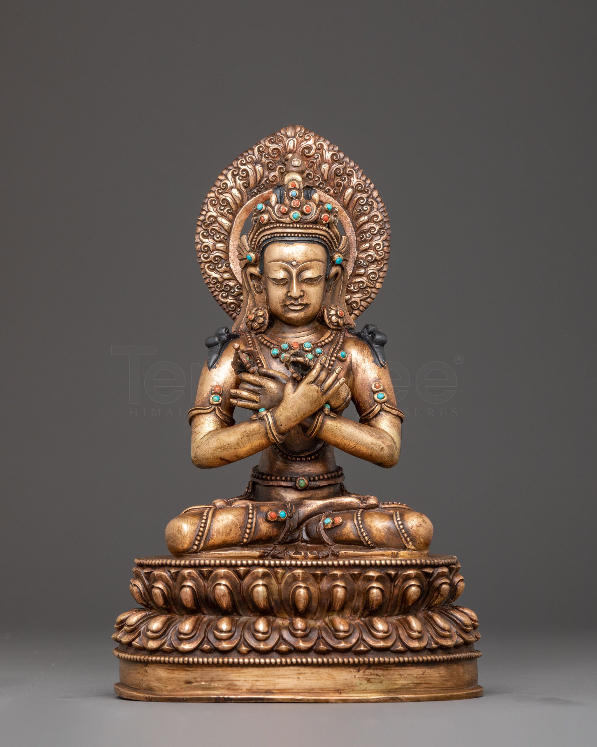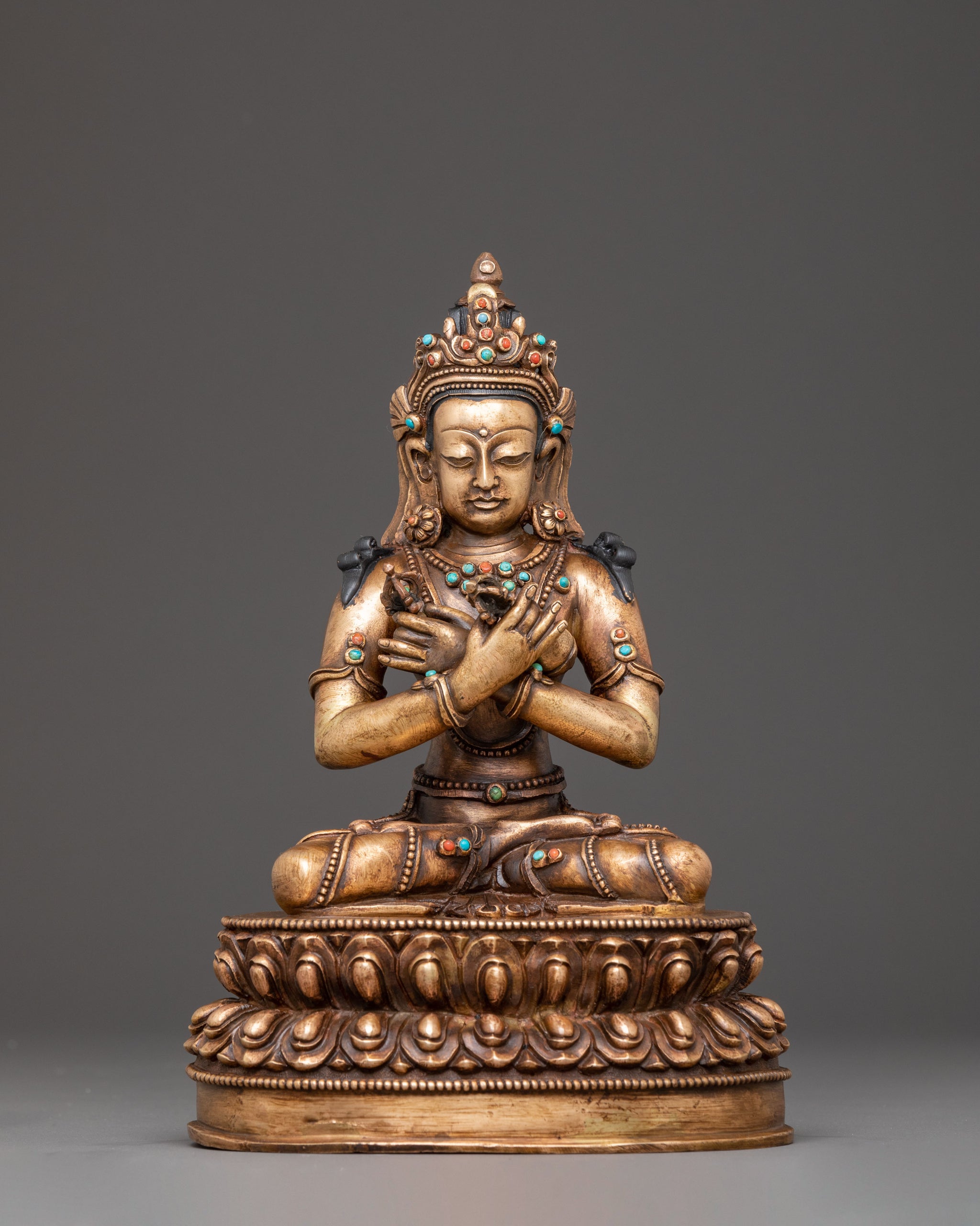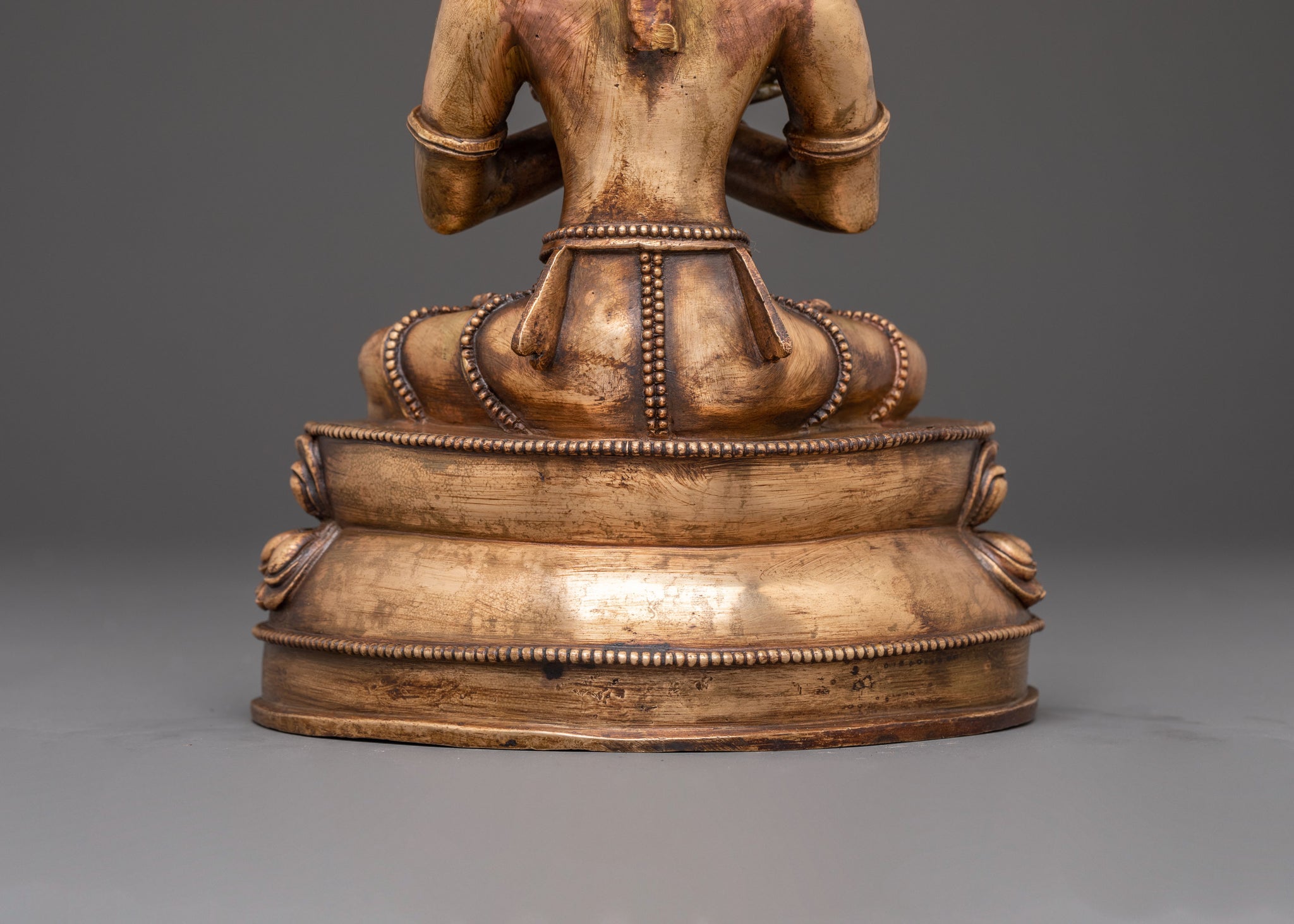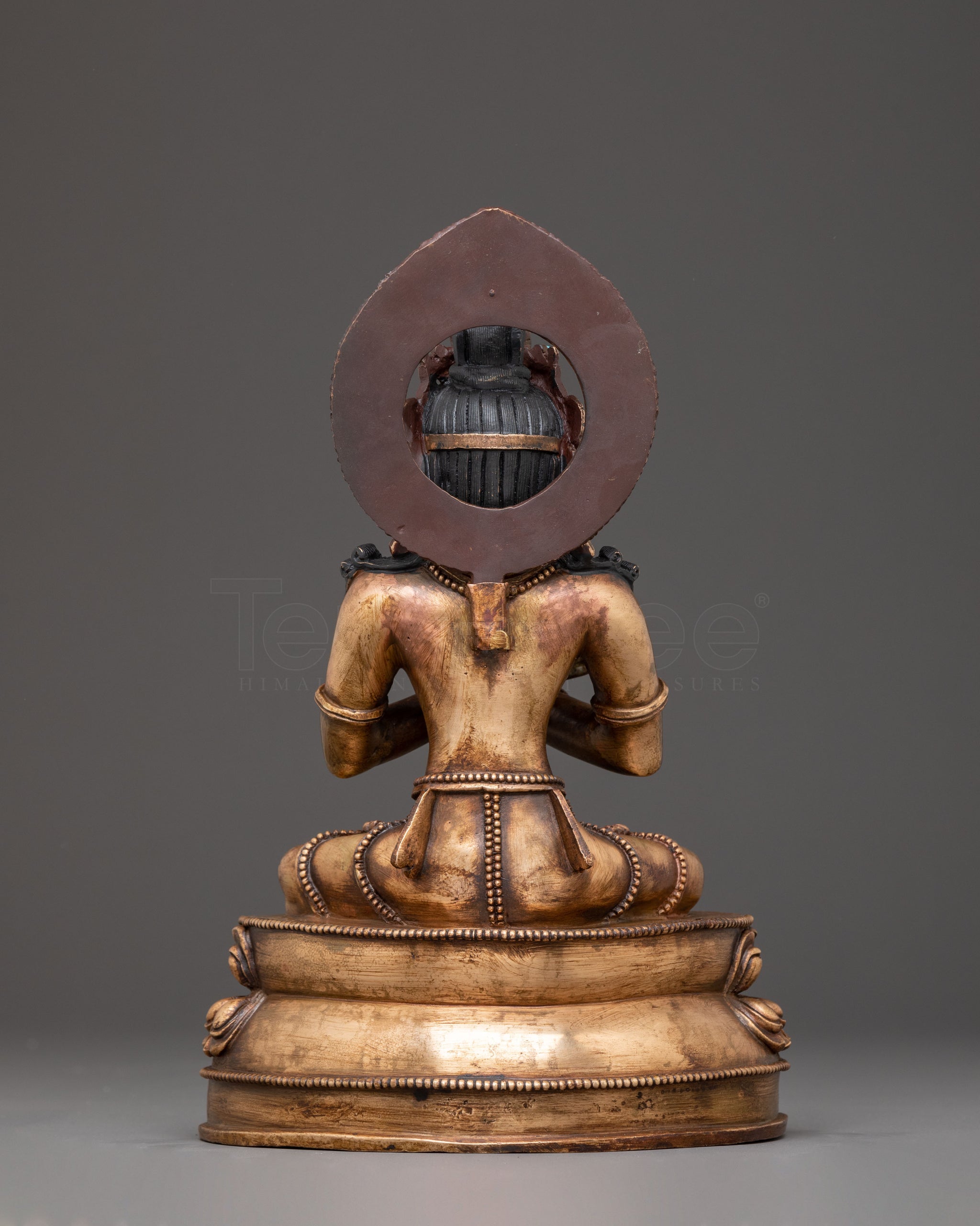 Vajradhara Buddha is depicted seated in the vajrasana, or diamond posture, atop a moon disc lotus base symbolizing purity and spiritual awakening. He holds a vajra in his dhyana mudra, which represents the unbreakable nature of wisdom and the union of emptiness and bliss. His serene expression reflects the realization of the ultimate truth and the union of compassion and insight. Adorning his head is the ushnisha, a cranial protuberance signifying his supreme enlightenment and mastery over the cycles of birth and death. This statue is a powerful manifestation of the Buddha’s presence, embodying deep spiritual meaning through every detail.